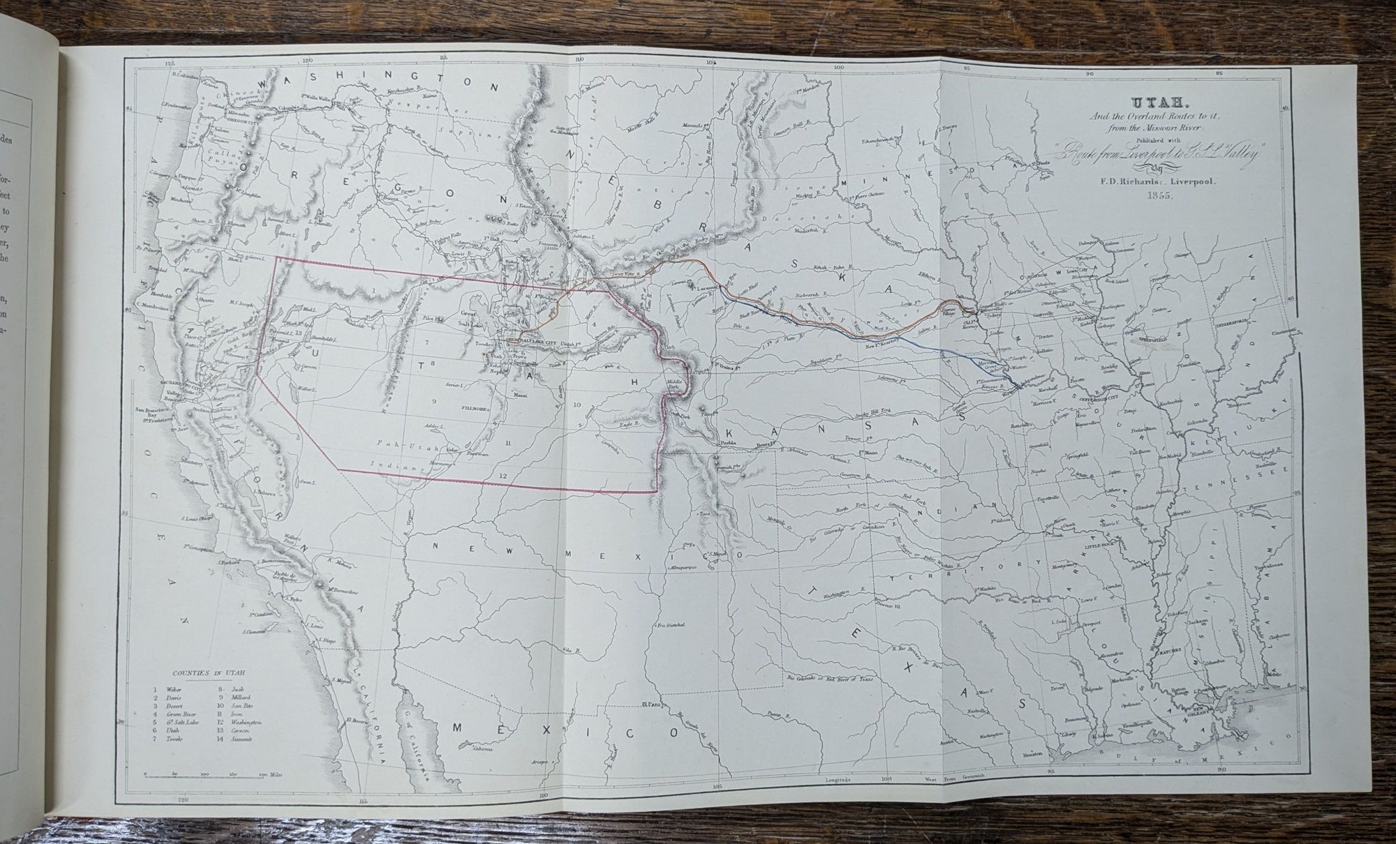 Originally serialized in fifteen issues starting in July of 1854, this impressive volume was the brainchild of young convert Frederick Piercy, and Samuel Richards, president of the Liverpool Mission. They envisioned a travel guide for English converts who wanted to make the trek to the Salt Lake Valley. Piercy (1830-1891) was a gifted artist and engraver whose beautiful work fills this volume.