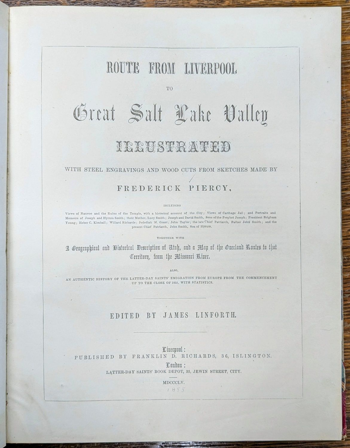 Route from Liverpool to Great Salt Lake Valley illustrated with steel engravings and wood cuts from sketches made by Frederick Piercy. Together with a geographical and historical description of Utah, and a map of the overland routes to that territory from the Missouri River. Also, an authentic history of the Latter-day Saints' emigration from Europe from the commencement up to the close of 1855, with statistics