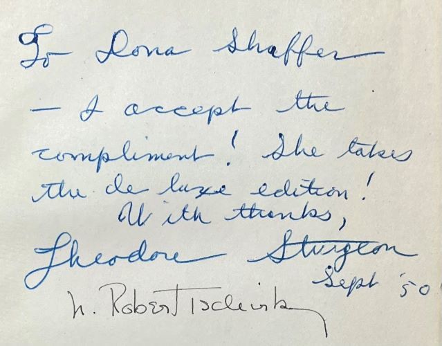 [Philadelphia]: Prime Press, 1948. Deluxe first edition. Hardcover. Very good. L. Robert Tschirky. SIGNED. 355pp. Octavo [22 cm] in burgundy cloth with gilt spine title, in publisher's board slipcase. Lacks glassine jacket. Spine cocked and very slightly faded, else very light wear; interior is clean and crisp. Rubbing to slipcase at extremities. Signed by Sturgeon and Tschirky on front free endpaper as issued, with Sturgeon's personal inscription added: "To Dona S---- I accept the compliment! She takes the de luxe edition! With thanks, Theodore Sturgeon Sept '50."