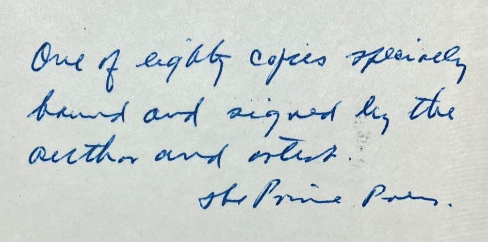 Limitation notice inscribed by publisher in ink on front pastedown: "One of eighty copies specially bound and signed by the author and artist. The Prime Press."