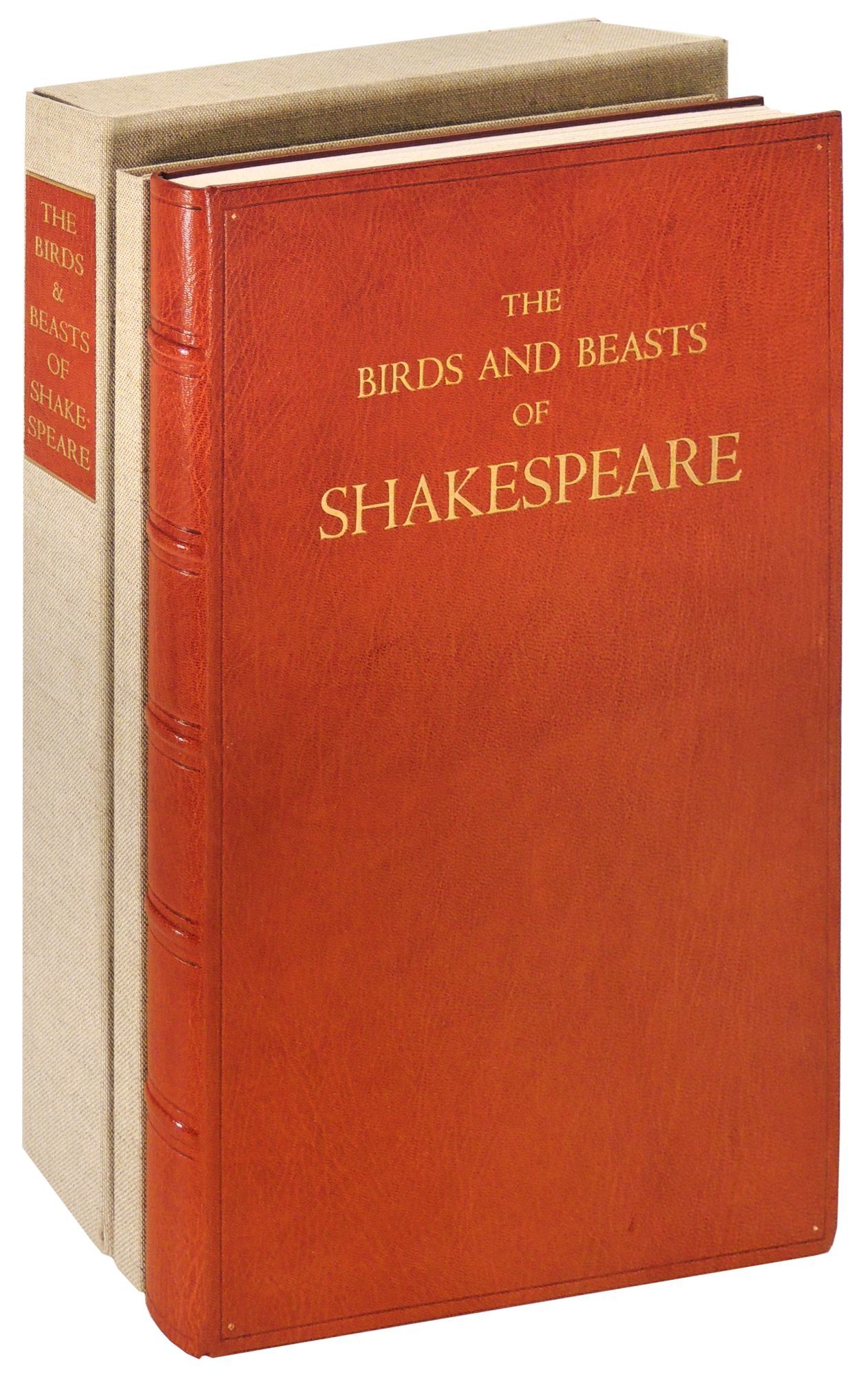 Beautifully bound by noted binders Claudia Cohen and Sarah Creighton in full rust morocco with the title stamped in gilt on the front panel within a blind rule at the outer edge of the covers, raised bands, and leather hinges. Illustrated with 54 wood engravings depicting the birds and beasts found in Shakespeare's plays and poems, plus two portraits of the Bard: one etching and one wood engraving. The book is accompanied by an additional suite of 56 signed and numbered prints from the illustrations. There is also an original watercolor of a Barnacle goose that is not known or called for in the prospectus. They are housed in a linen covered portfolio. The prospectus is also included. There are beautiful hand marbled endpapers by Faith Robinson. The book was printed on special Cheloniidae Rag paper carrying the press watermark that is the exact size of the First Folio of 1623. The type is Centaur and Arrighi set by M&H Type in San Francisco with additional hand composition by Arthur Larson. The book was letter press printed by master printer Harold Patrick McGrath. Housed in a custom clamshell box in near fine condition covered with beige linen with a brown leather spine label. The book is In fine condition. Book is 10.5 x 16 inches. Box is 11 x 17 inches. iv + 87 single fold pages. PRI/102423.