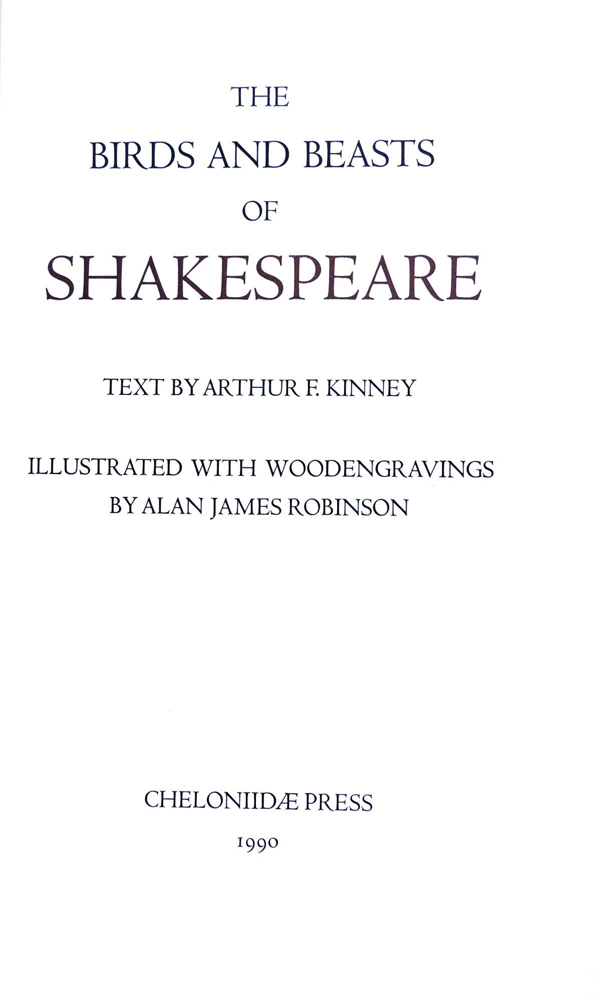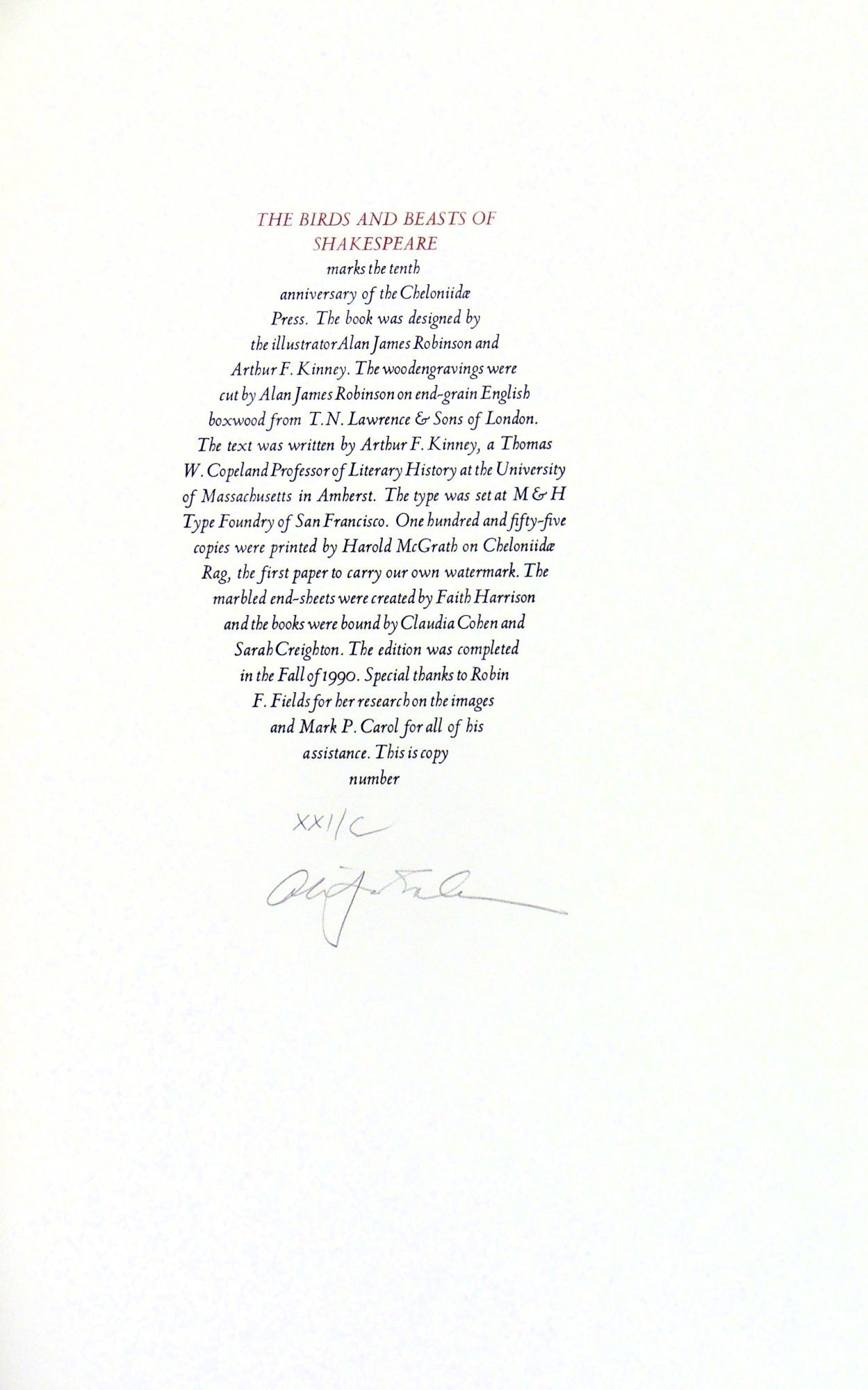 [Easthampton, MA]: Cheloniidae Press, 1990. Hardcover. Fine. Hardcover. Number 21 of 100 (xxi/c) copies in the deluxe edition, signed and numbered by illustrator and book designer Alan James Robinson. There were also 26 copies bound in quarter leather. This magnificent book was undertaken by the press as a celebration of its tenth anniversary. It is one of the great achievements of Robinson's Cheloniidae Press, one of the most respected American private presses. Founded in 1979, the press went through several incarnations during its existence. The constant throughout was the artistry of Alan James Robinson, who became famed for his superlative wood engravings and etchings of animals, birds, the sea, and more. The original text for this edition was written by Arthur F. Kinney, who was then the Thomas W. Copland Professor of Literary History at the University of Massachusetts and an extensive publisher and lecturer on Shakespeare.