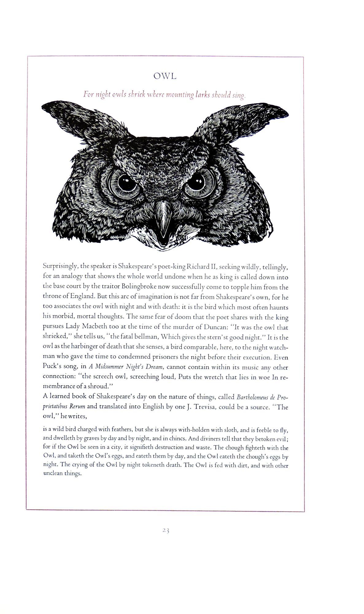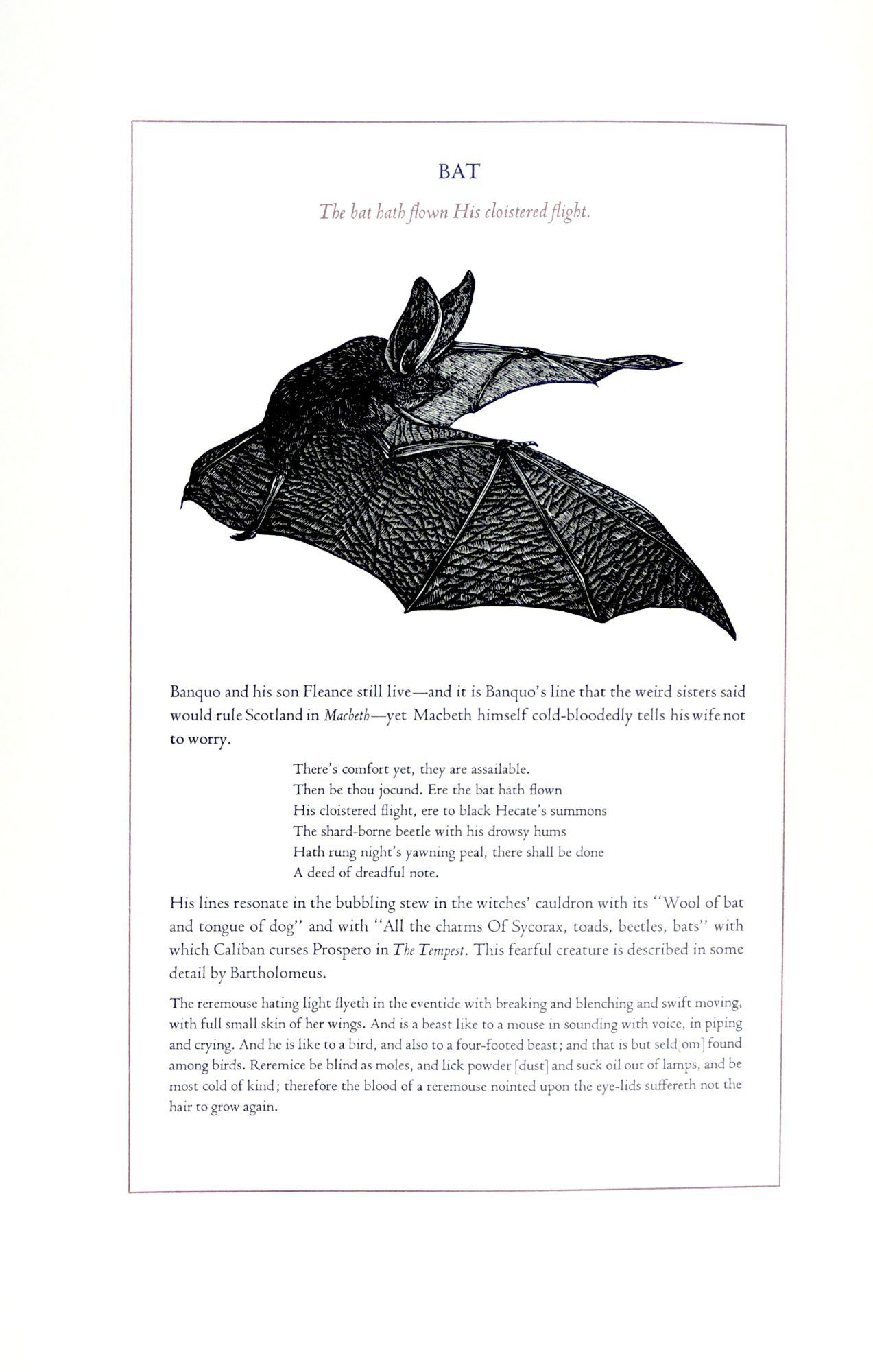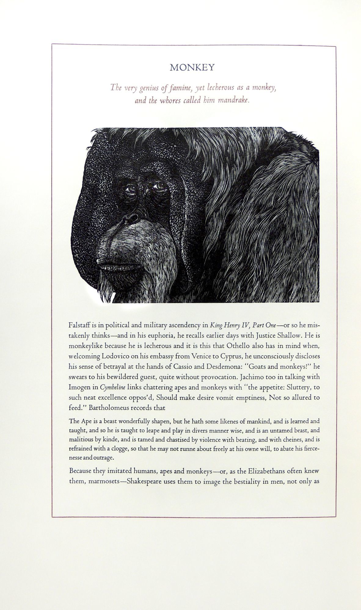 From the prospectus: this book "focuses on popular bird and animal lore and the way Shakespeare turns it into lines of haunting and indelible beauty by describing the familiar and unfamiliar ideas about [many creatures] and by showing how Shakespeare used these [ideas] to shape character and plot in his plays....Shakespeare's imaginative use of observed detail and magical fantasies is matched by the intricate and mysterious wood engravings of Robinson."