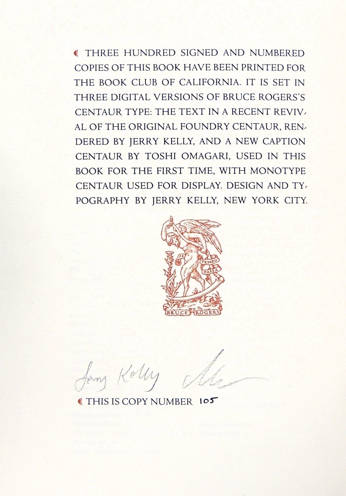 San Francisco: The Book Club of California, 2016. Hardcover. Fine. Hardcover. 105 of 300 copies, signed by both authors. "In this book we will endeavor to unravel some of the key elements of the story [of Bruce Rogers's Centaur typeface] and set the record straight. Examining the muddled origination of the design, the intellectual property issues involved, and the curious story of the font's recutting for machine composition, we hope to shed new light on the evolution of this seminal typeface" (introduction). Set in three digital versions of Bruce Rogers's Centaur Type: the text in a recent revival of the original foundry Centaur, rendered by Jerry Kelly, and a new caption Centaur by Toshi Omagari, used in this book for the first time, with monotype Centaur used fro display. Design and typography by Jerry Kelly. Printed in black and dark red. Bound in speckled cream paper covered boards with paper title label to spine panel. Bruce Rogers design to front board in brown. Clean and bright. Housed in a brown paper covered slipcase with minor sunning to edges and light rubbing to panels. 120 pages. PRI/102323.
