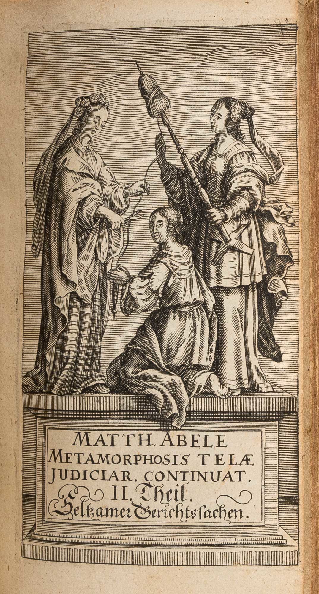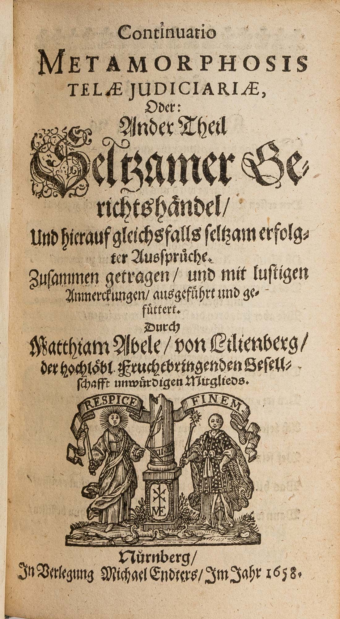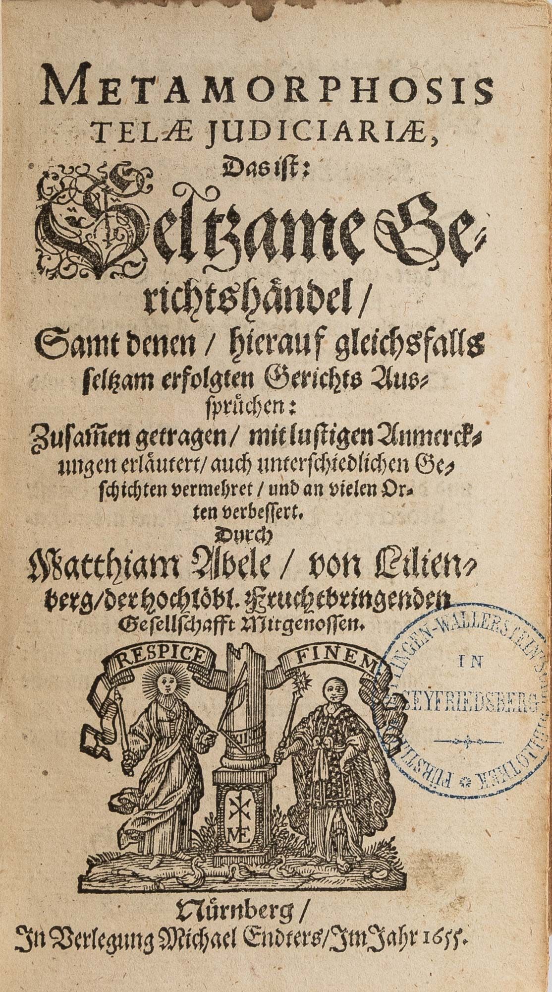 1655. Nuremberg: In Verlegung Michael Endters, 1655.. Nuremberg: In Verlegung Michael Endters, 1655. A Rare Collection of Humorous and Curious Cases Lilienberg, Matthias Abele von und zu [1618-1677]. Metamorphosis Telae Judiciariae, Das Ist: Seltzame Gerichtshandel. Samt Denen/Hierauf Gleichsfalls Seltzam Erfolgten Gerichts Ausspruchen: Zusam[m]en Getragen/Mit Lustigen Anmerckungen Erlautert/Auch Uhterschiedlichen Geschichten Vermehret/Und an Vielen Orten Verbessert. Nuremberg: In Verlegung Michael Endters, 1655. [And] Continuatio Metamorphosis Telae Judiciariae, Oder: Ander Theil Seltzamer Gerichtshandel/Und Hierauf Gliechsfalls Seltsam Erfolgter Auspruche. Zusammen Getragen/Und Mit Lustigen Anmerckungen/Ausgefuhrt und Gefuttert. Nuremberg: In Verlegung Michael Endters, 1658. Two volumes in one book. [xvi], 791 [i.e. 761], [14]; [xvi], 452 [i.e. 434], [12] pp. With 2 additional engraved pictorial copperplate title pages. Octavo (6-1/4" x 3-1/4"; 16 x 8.25 cm). Contemporary laced vellum, later repair to spine incorporating portions of existing spine, edges of text block rouged. Light soiling and a few small stains, remnants of early hand-lettered title to head of spine, early annotation and (illegible) owner signature dated 1680 to front pastedown. Moderate toning to interior, somewhat heavier in places in second volume, light foxing and negligible faint dampstaining to a few leaves, small ink library stamp of the Oettingen-Wallerstein Library to half-title and title page of first volume, tear to margin of leaf R6 (pp. 187-188) of first volume without loss to text, small hole to leaf U8 (pp. 319-320) of second part with very minor loss to text, legibility not affected. A very good copy of a rare complete set. $750. * Later edition. First published in 1651, Metamorphosis Telae Judiciariae is an extensive collection of accounts of amusing and unusual court cases, several of which are accompanied by poems or songs. The second volume contains an additional 150 cases. The final edition appeared in 1712. This copy once belonged to the Oettingen-Wallerstein Library (Oettingen-Wallersteinsche Bibliothek), a notably fine collection established by the princes of Oettingen-Wallerstein that incorporated the contents of five monastery libraries. It was later acquired by the University of Augsburg. OCLC locates 3 complete copies of the 1655-1658 edition in North Ameri.