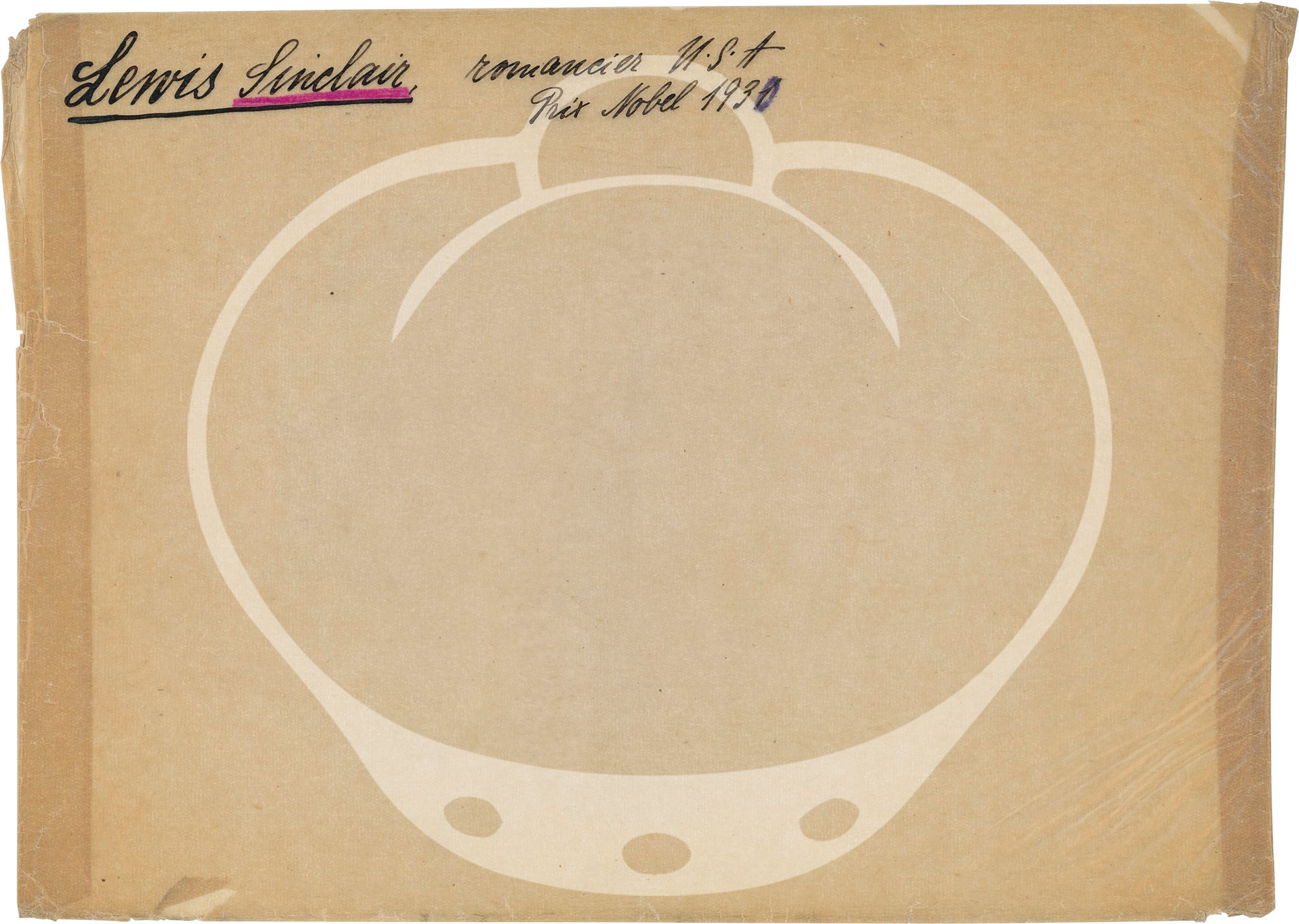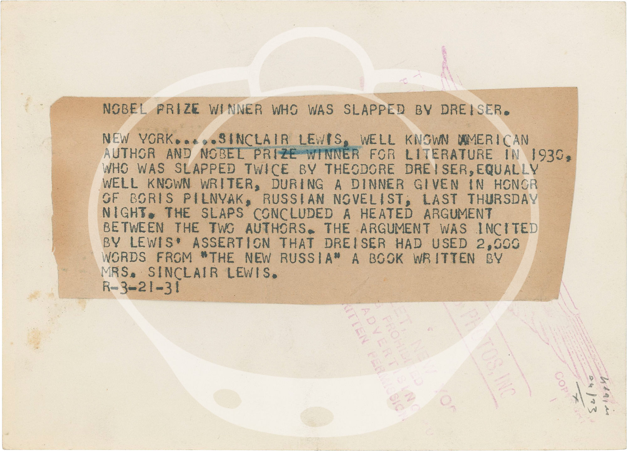 N.p.: N.p., 1931. Vintage portrait photograph of writer Sinclair Lewis in New York, circa 1931. Printed mimeo snipe affixed to the verso, discussing a heated altercation between Lewis and Theodore Dreiser at a 1931 dinner in honor of Russian novelist Boris Pilnyak.
