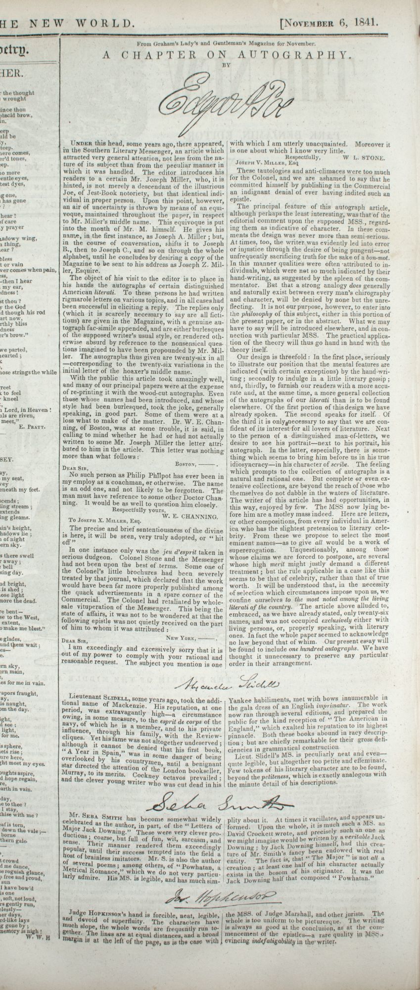 Also includes "A Chapter on Autography" by Edgar Allan Poe (November 6, 1841, pp. 290-293). Myerson E31, E32, E34