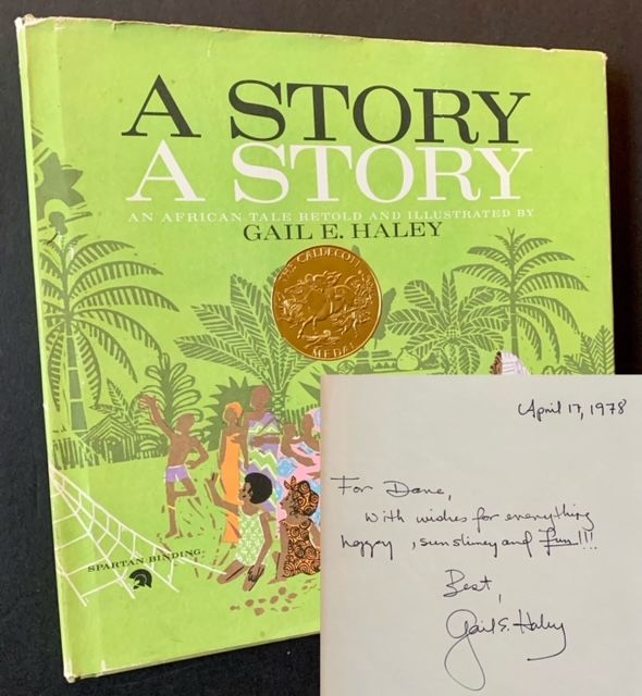 New York: Atheneum, 1974. Cloth. Near Fine/Near Fine. Gail E. Haley. WARMLY INSCRIBED BY THE AUTHOR GAIL HALEY on the half-title. A very solid copy to boot of the November 1974 stated 5th printing of this 1971 Caldecott winner, with an original price of $7.29 at the dustjacket's front flap and the gold Caldecott sticker affixed to the front cover. Clean and Near Fine in a crisp, Near Fine dustjacket. Vert slight bowing at the front board, otherwise very sharp. Square quarto, wonderfully illustrated in rich color by the author herself.