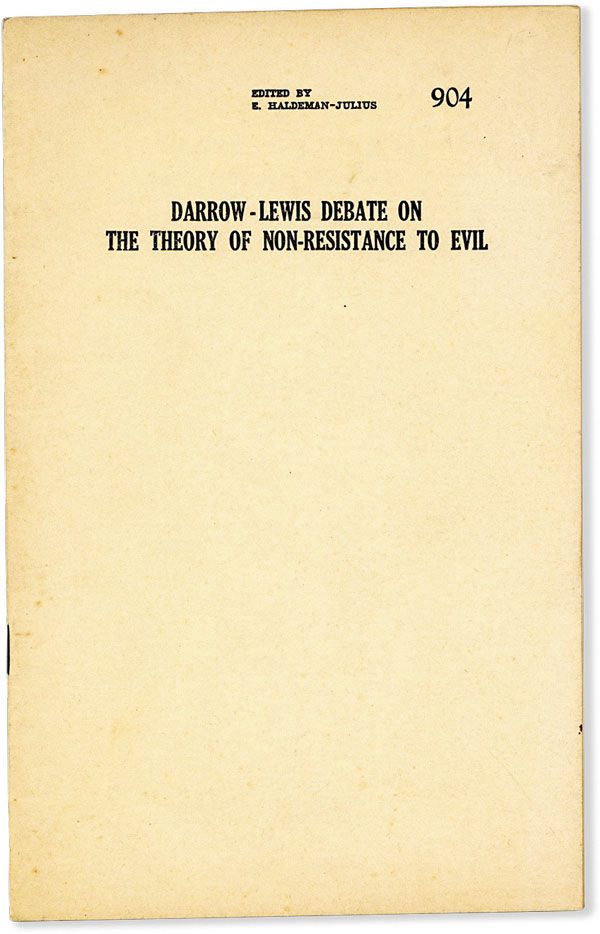 Girard, KS: Haldeman-Julius, N.d. [ca 1950?]. Haldeman-Julius Big Blue Book no. 904; probably a later issue, in ivory wrappers without the "BB" prefix. Octavo. Staple-bound pamphlet; 24pp. Text toned, as usual; Very Good. Transcript of a debate that took place at Chicago's Garrick Theater in 1910, with Darrow taking the affirmative, that evil should not be answered with evil, an argument he applies to modern jurisprudence and the death penalty in particular. The text was originally printed by the Workers University Society in Chicago (1910); this undated reprint is in Haldeman-Julius' "Big Blue Book" series which, in keeping with the publisher's haphazard approach to bibliographical matters, was comprised of books that were not particularly big, and often not blue.