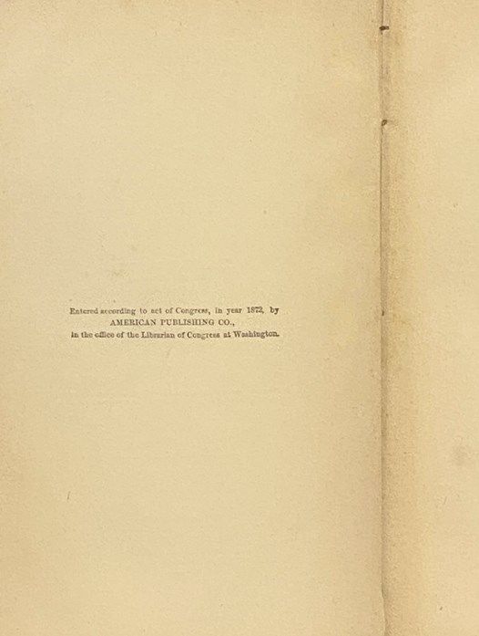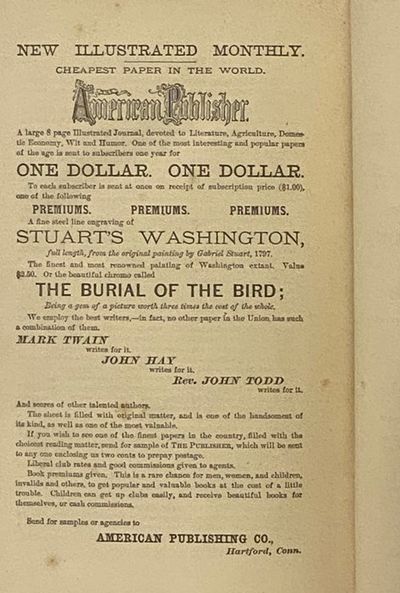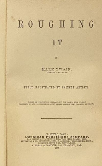 Hartford: American Publishing Company, 1872. First Edition. Hard Cover. Very Good/No Jacket. 0x0x0. First edition, first state (BAL 3337) with ad on p. 592. Edges rubbed (fore edge exposed), single gathering sprung, a few pages lightly foxed. 1872 Hard Cover. xviii, 591, [7] pp. 8vo. Two engraved frontispieces, six plates in text. Numerous engravings throughout. "Roughing It is a book of semi-autobiographical travel literature written by American humorist Mark Twain. It was written during 1870 - 71 and published in 1872 as a prequel to his first book Innocents Abroad. This book tells of Twain's adventures prior to his pleasure cruise related in Innocents Abroad. Roughing It follows the travels of young Mark Twain through the Wild West during the years 1861 - 1867. After a brief stint as a Confederate cavalry militiaman, he joined his brother Orion Clemens, who had been appointed Secretary of the Nevada Territory, on a stagecoach journey west. Twain consulted his brother's diary to refresh his memory and borrowed heavily from his active imagination for many stories in the novel. Roughing It illustrates many of Twain's early adventures, including a visit to Salt Lake City, gold and silver prospecting, real-estate speculation, and his beginnings as a writer. In this memoir, readers can see examples of Twain's rough-hewn humor, which would become a staple of his writing in his later books, such as Adventures of Huckleberry Finn, The Adventures of Tom Sawyer, and A Connecticut Yankee in King Arthur's Court. U.S. astronauts Frank Borman and James Lovell read "Roughing It" aloud to pass the time aboard NASA's Gemini VII, a 14-day-long Earth orbital mission in December 1965. Borman recalls reading the book during an on-camera interview in the 1999 PBS-TV (USA) television program "Nova: To the Moon".