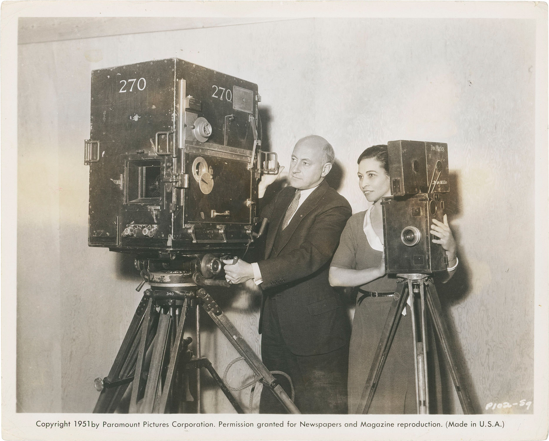 Los Angeles: Paramount Pictures, 1951. Vintage publicity photograph produced by Paramount, showing director Cecil B. DeMille and field secretary Emily Barrie standing with two cameras—DeMille with a Mitchell camera for sound film, and Barrie with a smaller Pathé Studio camera for silent film. Printed mimeo snipe affixed to the verso.