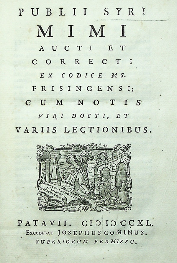 The sayings of Roman playwright Publilius Syrus; though his mimes were popular, and he was famous as an improviser, all that remains of Syrus' plays is this collection of moral maxims or sententiae. This edition was printed in very small numbers, according to Brunet, who noted that it was one of the rarest of the Latin imprints issued by Italian publisher Josephus Cominus. Apparently a rarity in the trade; we have traced only one copy in the auction record. BRUNET V.616. [63025].