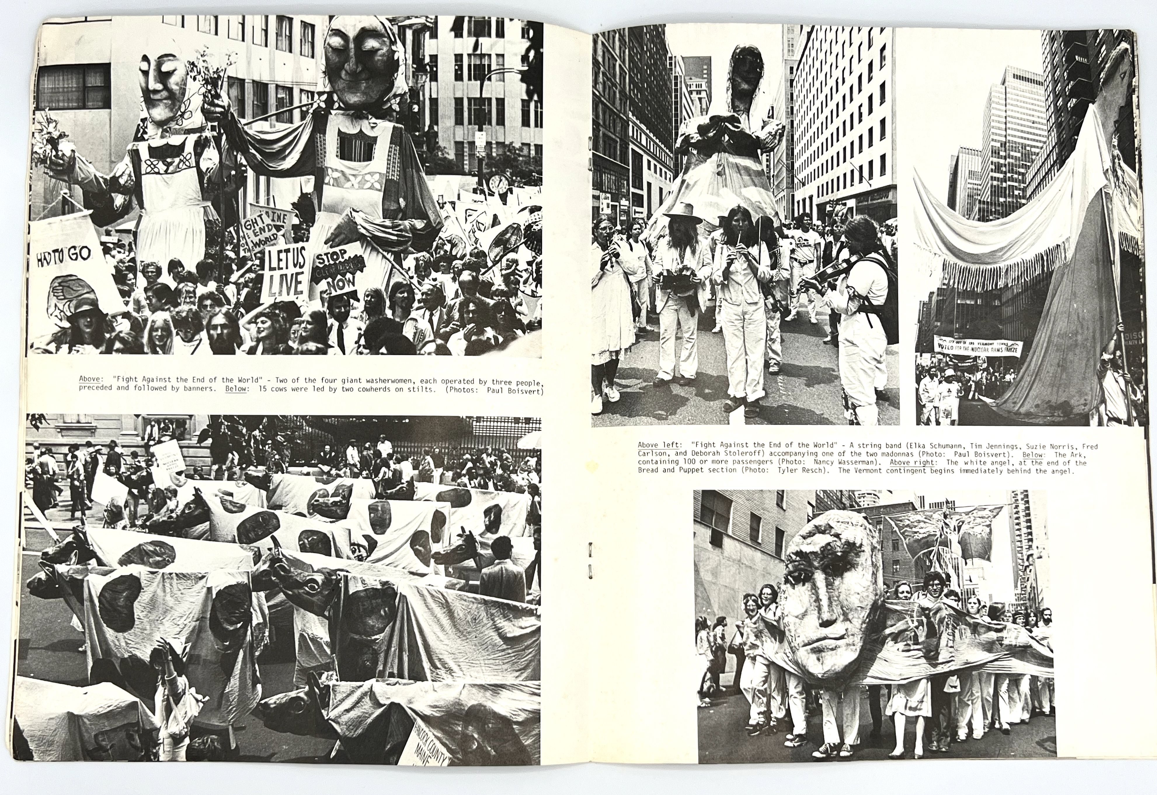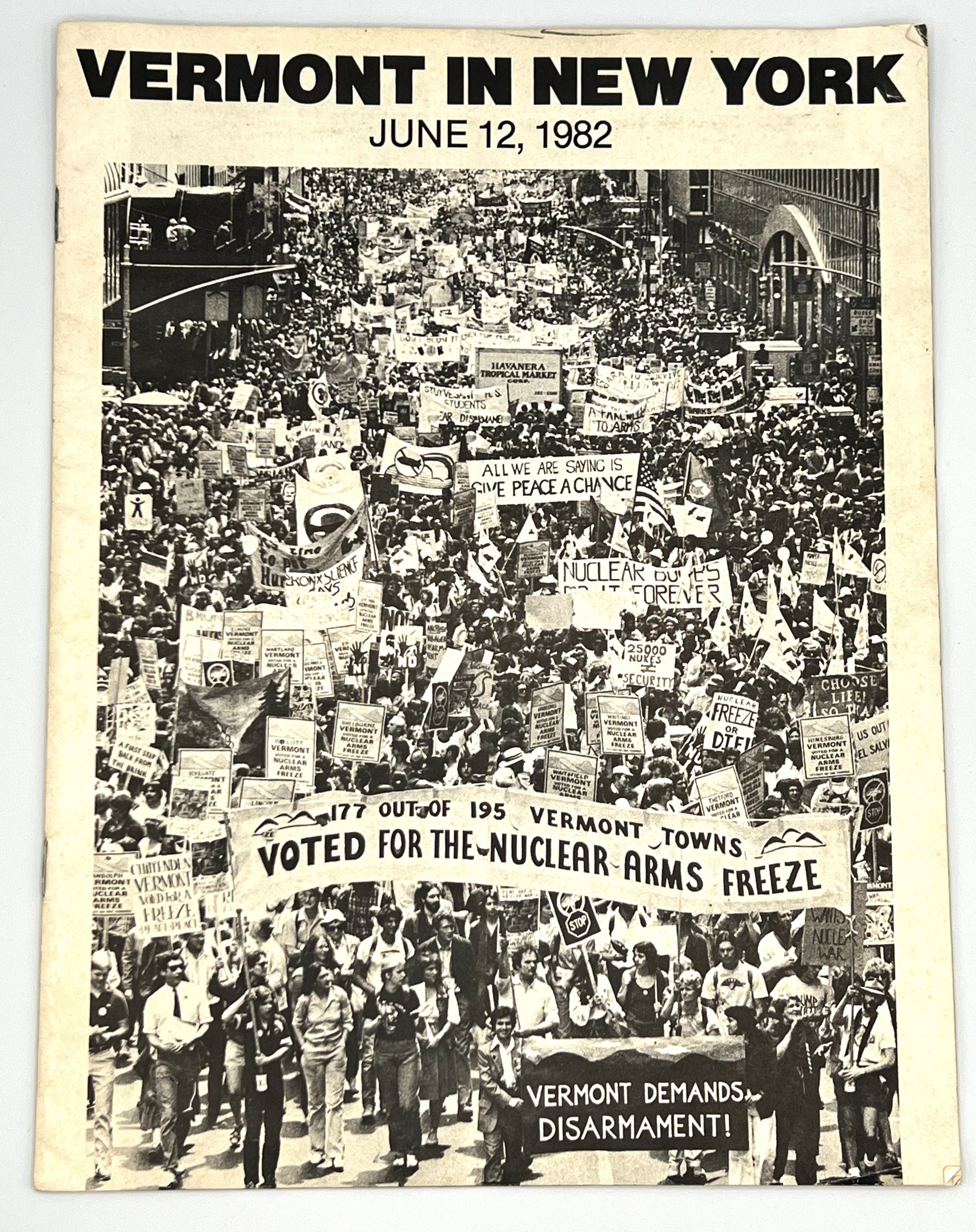 Norwich Peace Center, 1982. Staplebound. White photo illustrated wraps. Very good. Unpaginated [13pp.]. 28 x 21.5 cm. Twenty-six Peace Activist groups from Vermont headed by the Burlington Peace Coalition and The Norwich Peace Center made their way by bus down to NYC to march in the Rally for Nuclear Disarmament, what was at that time the largest political demonstration in the history of the United States, with over 750,000 participants and at least 3000 from Vermont. This "book of memories" includes black and white photos with some participants names added. One of the more significant contributor to the march was The Bread and Puppet Theater of Glover, VT. As a member of the first section of the march over 1000 "puppeteers" costumed in white, carried giant figures portraying the moon mounted on a cart drawn by sheep, white clowns leading white horses, dear, Vietnamese ladies, donkeys plowing, stilt horsemen, and flags and white birds. A couple of names in the paragraphs are circled in pen or pencil. Covers lightly soiled.