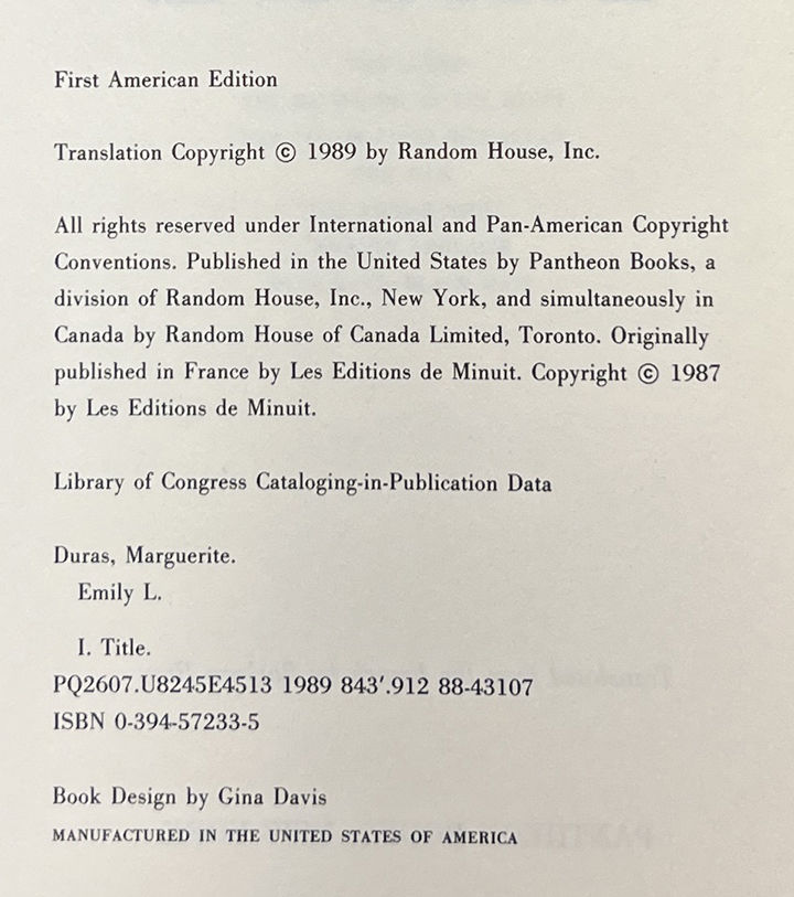 New York: Pantheon, 1989. First Edition. Hardcover. Fine/Fine. Translated by Barbara Bray. Fine in a Fine jacket, unclipped ($15.95), faintly rubbed. Quarter purple cloth with white paper on the boards. Square and firmly bound, clean internally. Duras' novel that "produces an exquisitely poetic exploration of the themes of love and commitment, truth, art, and beauty.