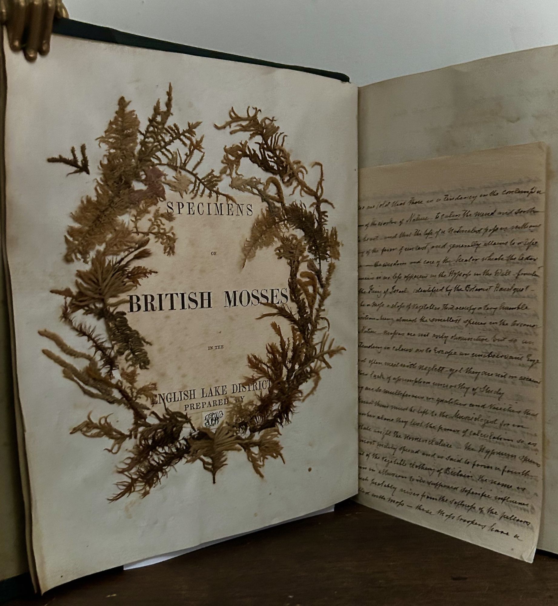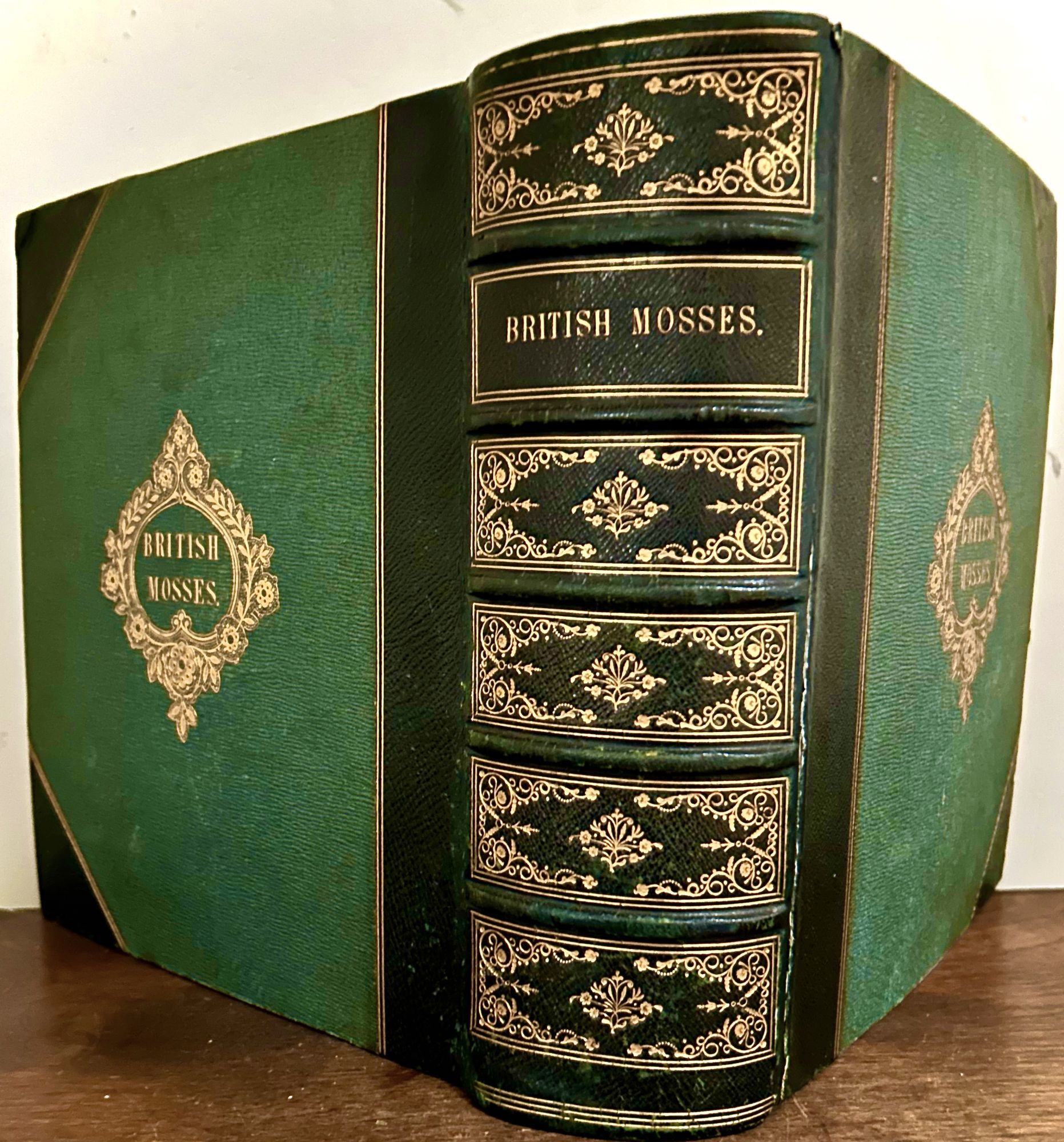 Np: Np, 1850. First edition. Hardcover. Contemporary three quarter dark olive morocco and cloth, front and back covers with gilt wreath design and lettered in gilt. Aeg. Very good. 25.5 x 22.5 cm. 8 page Index. Printed title page with a specimen of a moss wreath and initials apparently cut out and laid down, mostly likely taken from one of Flintoft's (James Flintoff) works. There are 175 specimens, many with more than one specimen, each captioned in ink and pencil. Also laid in, a three page hand written in ink commentary in the same hand pertaining to mosses with a mention of Sir Jackson Hooker. Raised bands, spine panels with gilt arabesque motifs.