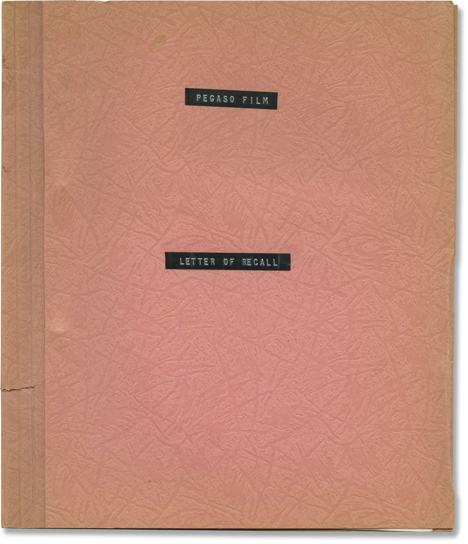 Pink titled wrappers. Title page present, with credits for screenwriter Nicola BADALUCCO. 23 leaves, with last page of text numbered 22. Carbon typescript, rectos only. Pages Near Fine, wrapper Very Good plus, with a small splash on the front wrapper and slight yapping to the fore edge, bound internally with two gold brads.