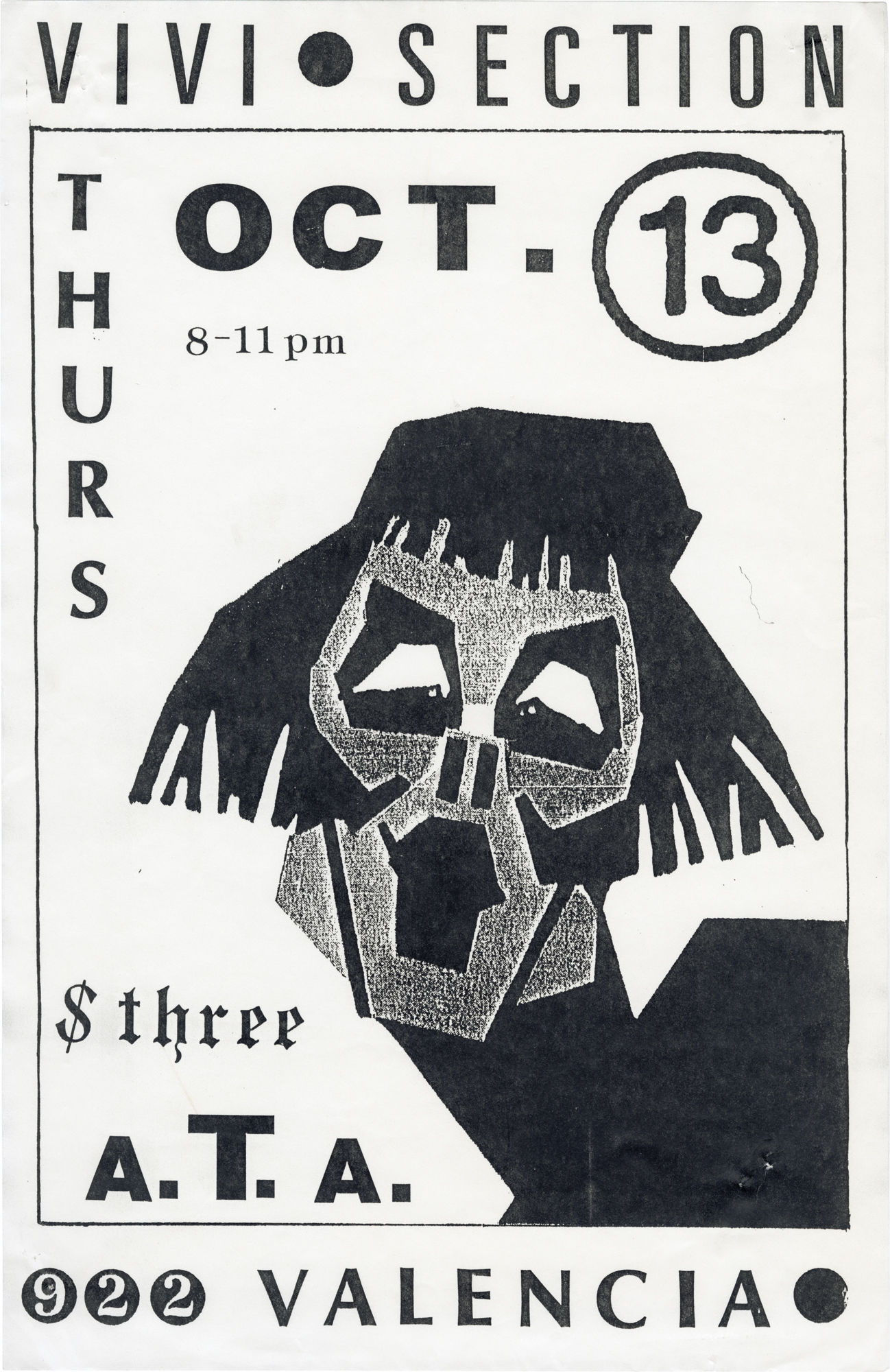 San Francisco: Artists' Television Access, 1988. Vintage poster for a performance by Vivi Section at the A.T.A. (Artists' Television Acess), October 13, 1988.