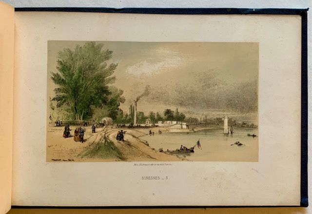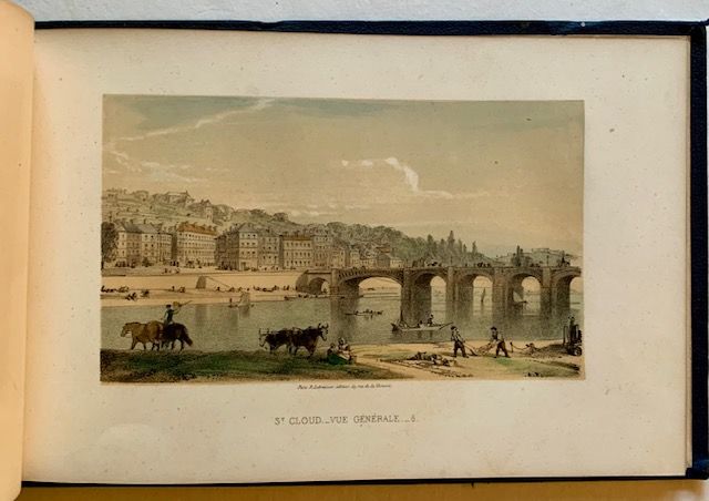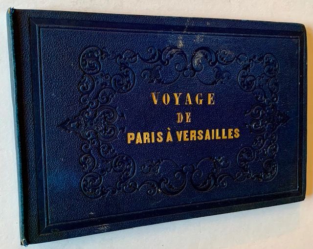 Paris: R. Lebrasseur, 1850. Decorative Boards. Very Good. A lovely mid 19th century color plate book, with 22 chromolithographs plus title page. Oblong octavo, navy-blue boards, with decorative blindstamping and brigh gilt-titling ("Voyage de Paris a Versailles") at the front panel. The 1850 1st edition, published by R. Lebrasseur of Paris, the lithography executed by Becquet Freres, also of Paris. A bright, very presentable copy, with light staining to the boards and offsetting at the pastedowns and the endsheets. All of the plates, save 2 or 3 (which show just a touch of spotting encroaching along their margins), are clean and very sharp.