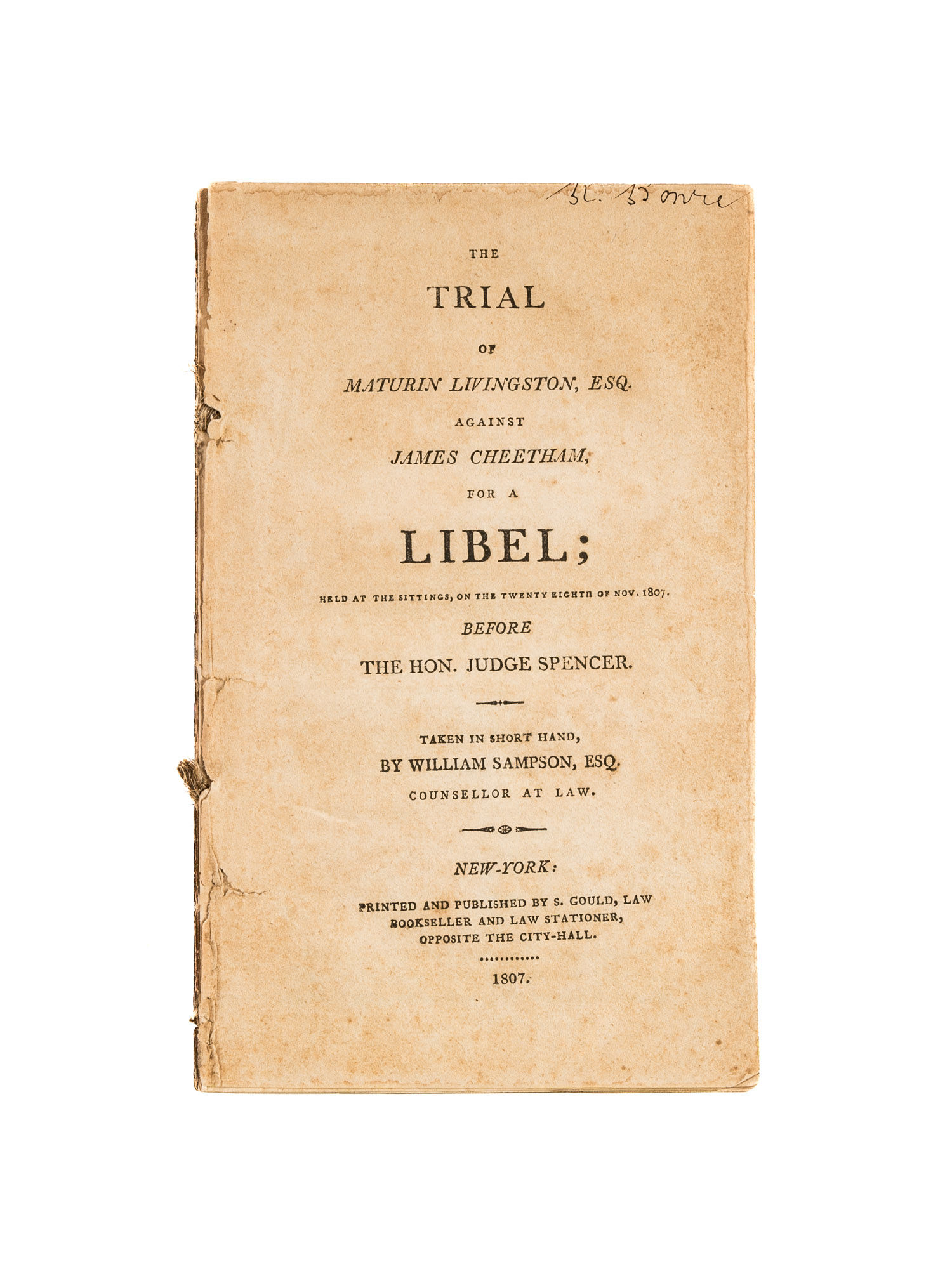 1807. Bowie, Ralph (former owner). Bowie, Ralph (former owner). A Card Game and a Libel Case [Trial]. Livingston, Maturin [1769-1847], Plaintiff. Cheetham, James [1772-1810], Defendant. Sampson, William [1764-1836], Reporter. The Trial of the Hon Maturin Livingston, Esq., Against James Cheetham, For a Libel; Held at the Sittings, On the Twenty Eighth of Nov. 1807, Before the Hon. Judge Spencer. Taken in Short Hand. New York: Printed and Published by S. Gould, Law Bookseller and Law Stationer, 1807. 63, [1] pp. Octavo (7-3/4" x 5-3/4"). Disbound stab-stitched pamphlet. Light browning, light foxing in a few places, title page detached and lightly edgeworn, early owner signature ("R. Bowie," affected by trimming) to its head. $450. * Only edition. Livingston, a member of the prominent Livingston family, was a New York City lawyer and politician. "Cheetham was accused of libeling Livingston by charging in the Republican Watch Tower, 14 September 1805, that the latter cheated at cards. The defendant was found guilty and fined $1,000" (McCoy). The R. Bowie who owned this pamphlet may be Ralph Bowie [1755-1816]. Born and educated in Scotland, he emigrated to the United States in the early 1780s for political reasons and established himself in York, Pennsylvania, where he became a connected and well-respected attorney. Cohen, Bibliography of Early American Law 11994. McCoy, Freedom of the Press C296.