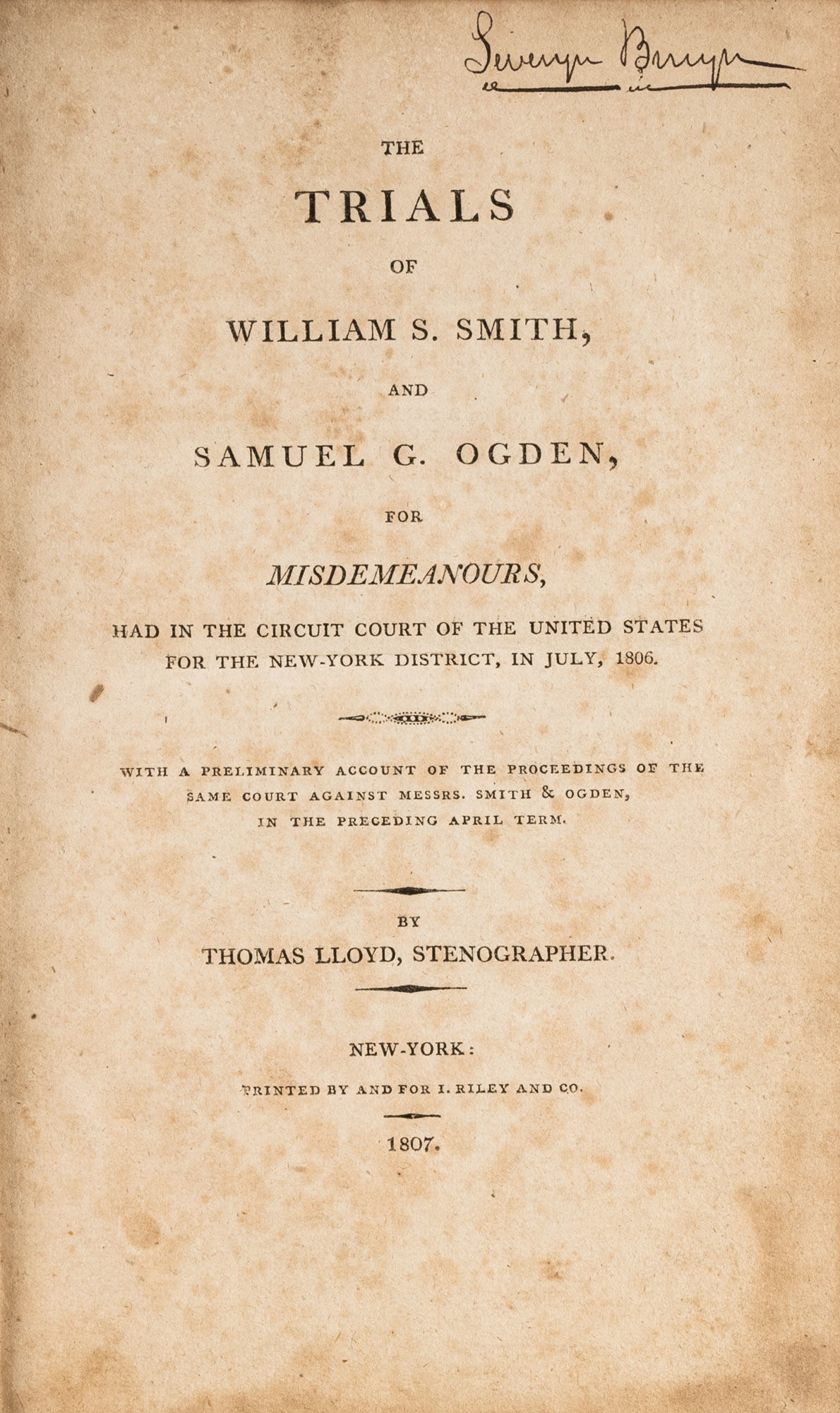 1807. New York: Printed by and for I. Riley, 1807. New York: Printed by and for I. Riley, 1807. Trial of the Leaders of the Ill-Fated Miranda Expedition [Trials]. Smith, William S. [1755-1816], Defendant. Ogden, Samuel G. [1779-1860], Defendant. Lloyd, Thomas [1756-1827], Stenographer. The Trials of William S. Smith and Samuel G. Ogden for Misdemeanours had in the Circuit Court of the United States for the New-York District in July, 1806. With a Preliminary Account of the Proceedings of the Same Court Against Messrs. Smith and Ogden in the Preceding April Term. New York: Printed By and For I. Riley, 1807. xxxiii, 287 pp. Octavo (8" x 5"). Contemporary sheep, blind fillets to boards, calf lettering piece and blind fillets to spine. Light rubbing and scuffing to boards, moderate rubbing to extremities with wear to head of spine, joints starting at heads, corners bumped and somewhat worn. Moderate toning and light foxing to interior, early owner signature (Severyn Bruyn) to head of title page. $250. * Only edition. Francisco de Miranda hoped to become the George Washington of South America. This led him to assemble a group of mercenaries that included William S. Smith for an unsuccessful invasion of Venezuela, a violation of United States law. Colonel Smith was the son-in-law of John Adams. Samuel G. Ogden was a merchant who had furnished ships and supplies for the expedition. The counsel for the defense attempted to show that Smith and Ogden, though they had taken part in the affair, had not actually begun it, that members of the government, including even Thomas Jefferson, were cognizant of Miranda's plans, and that Spain and the United States were on the brink of war at the time of the expedition. Smith and Ogden were acquitted. They attracted great public sympathy because they were seen as heroes in a noble war against Spanish tyranny. This copy appears to have been owned by a member of the Bruyn family, influential New Yorkers from Ulster County. Many of the Bryuns served in the state assembly. Sabin, A Dictionary of Books Relating to America 84904. Cohen, Bibliography of Early American Law 13615.