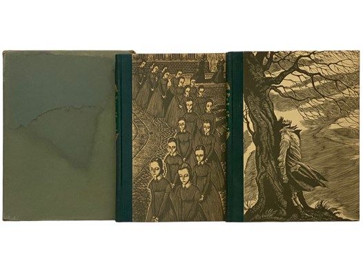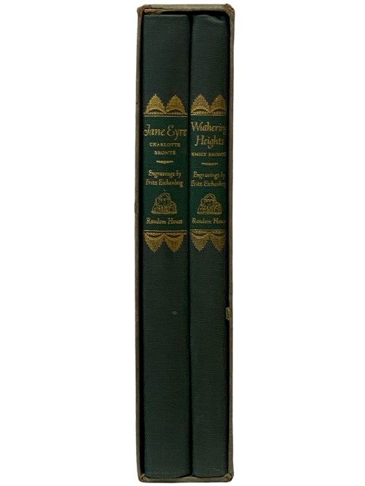New York: Random House, 1943. Hard Cover. Very Good/Good. 10x8x2. Eichenberg, Fritz. Includes publisher's slipcase. Slipcase stained, boards a bit toned (as usual), owner bookplate on front endpaper of each volume. 1943 Hard Cover. Two volumes originally issued together as a set in publisher's slipcase. 343, [1]; 212, [2] pp. 10 x 8. Engravings by Fritz Eichenberg. Pictorial paper over boards hardcover bindings, green cloth spines, gilt titles, green top page ridge. Includes the edition of Jane Eyre featured in the major motion picture 'Definitely Maybe'. Jane Eyre is a famous and influential novel by English writer Charlotte Bronte. It was published in London, England in 1847 by Smith, Elder & Co. with the title Jane Eyre. An Autobiography under the pen name "Currer Bell". Jane Eyre is a first-person narrative of the title character, a small, plain-faced, intelligent and honest English orphan. The novel goes through five distinct stages: Jane's childhood at Gateshead, where she is abused by her aunt and cousins; her education at Lowood School, where she acquires friends and role models but also suffers privations; her time as the governess of Thornfield Manor, where she falls in love with her Byronic employer, Edward Rochester; her time with the Rivers family at Marsh's End (or Moor House) and Morton, where her cold clergyman-cousin St John Rivers proposes to her; and her reunion with and marriage to her beloved Rochester at his house of Ferndean. Partly autobiographical, the novel abounds with social criticism and sinister gothic elements. Jane Eyre is divided into 38 chapters; most editions are at least 400 pages long (although the preface and introduction on certain copies are liable to take up another 100). The original was published in three volumes, comprising chapters 1 to 15, 16 to 26, and 27 to 38. Bronte dedicated the novel's second edition to William Makepeace Thackeray." "Wuthering Heights is Emily Bronte's only novel. It was first published in 1847 under the pseudonym Ellis Bell, and a posthumous second edition was edited by her sister Charlotte. The name of the novel comes from the Yorkshire manor on the moors on which the story centers (as an adjective, Wuthering is a Yorkshire word referring to turbulent weather). The narrative tells the tale of the all-encompassing and passionate, yet thwarted, love between Heathcliff and Catherine Earnshaw, and how this unresolved passion eventually destroys them and many around them. Now considered a classic of English literature, Wuthering Heights met with mixed reviews by critics when it first appeared, mainly because of the narrative's stark depiction of mental and physical cruelty. Though Charlotte Bronte's Jane Eyre was originally considered the best of the Bronte sisters' works, many subsequent critics of Wuthering Heights argued that its originality and achievement made it superior. Wuthering Heights has also given rise to many adaptations and inspired works, including films, radio, television dramatisations, a musical by Bernard J. Taylor and songs (notably the hit "Wuthering Heights" by Kate Bush), ballet and opera.