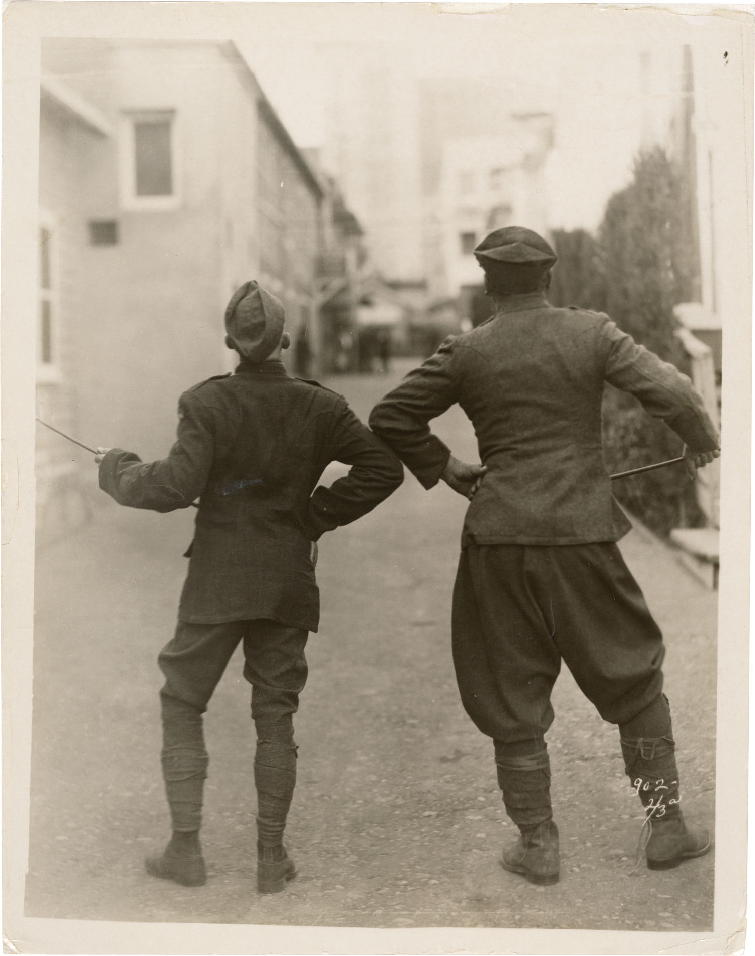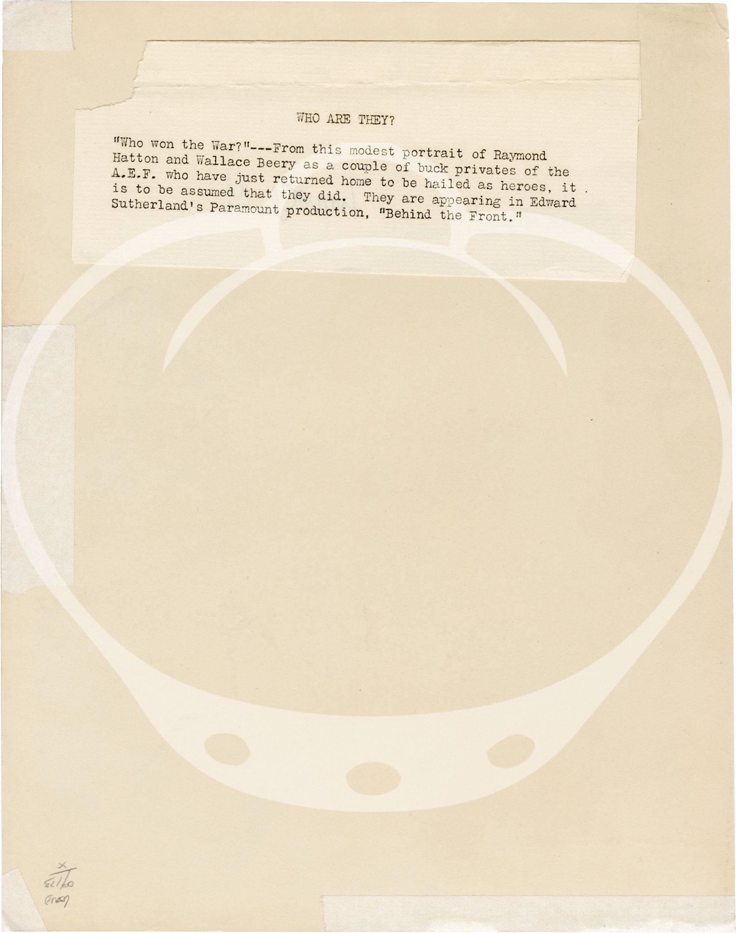 Los Angeles: Paramount Pictures, 1926. Vintage reference photograph from the 1926 film, showing actors Wallace Beery and Raymond Hatton from behind. Printed mimeo snipe affixed to the verso.