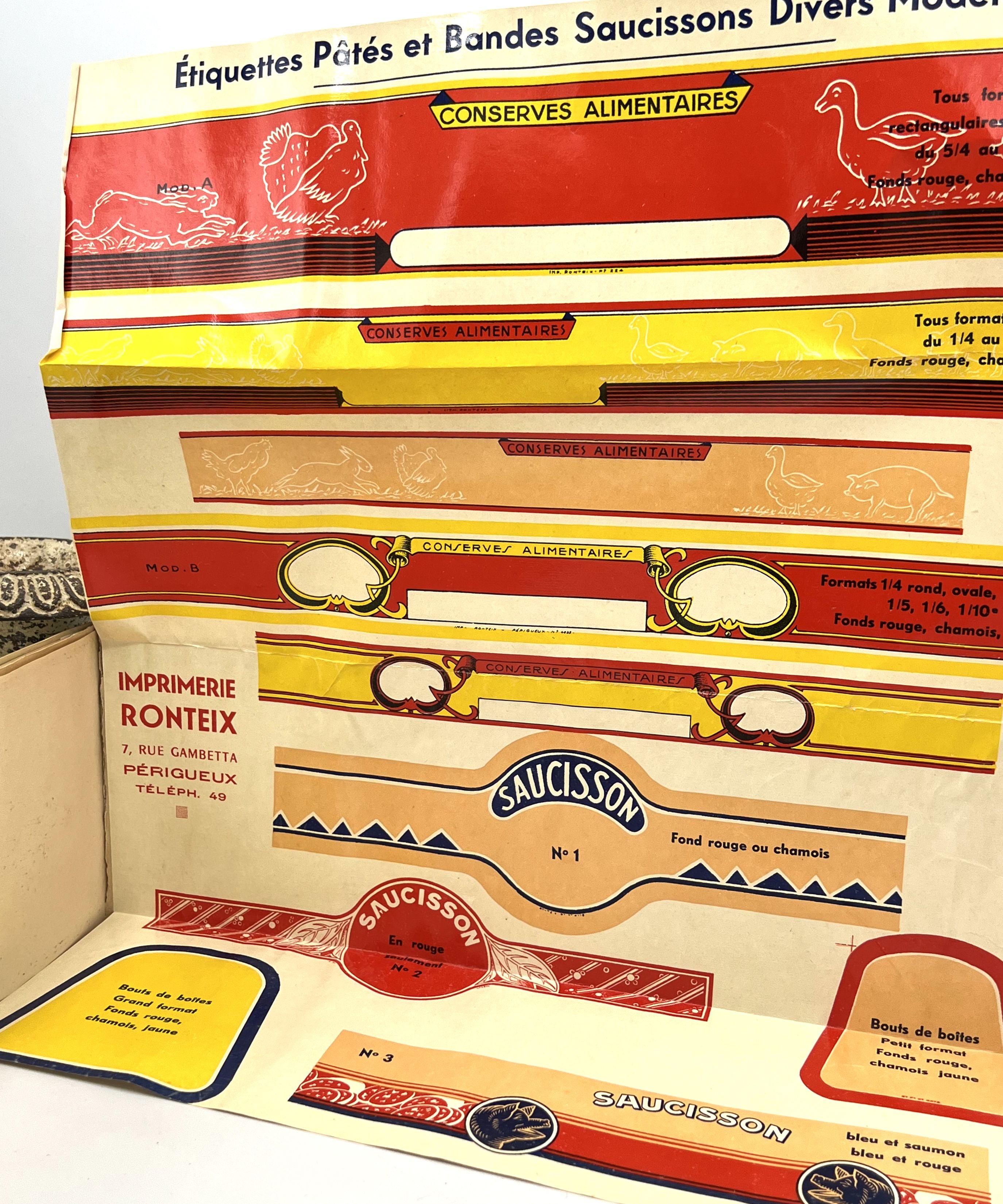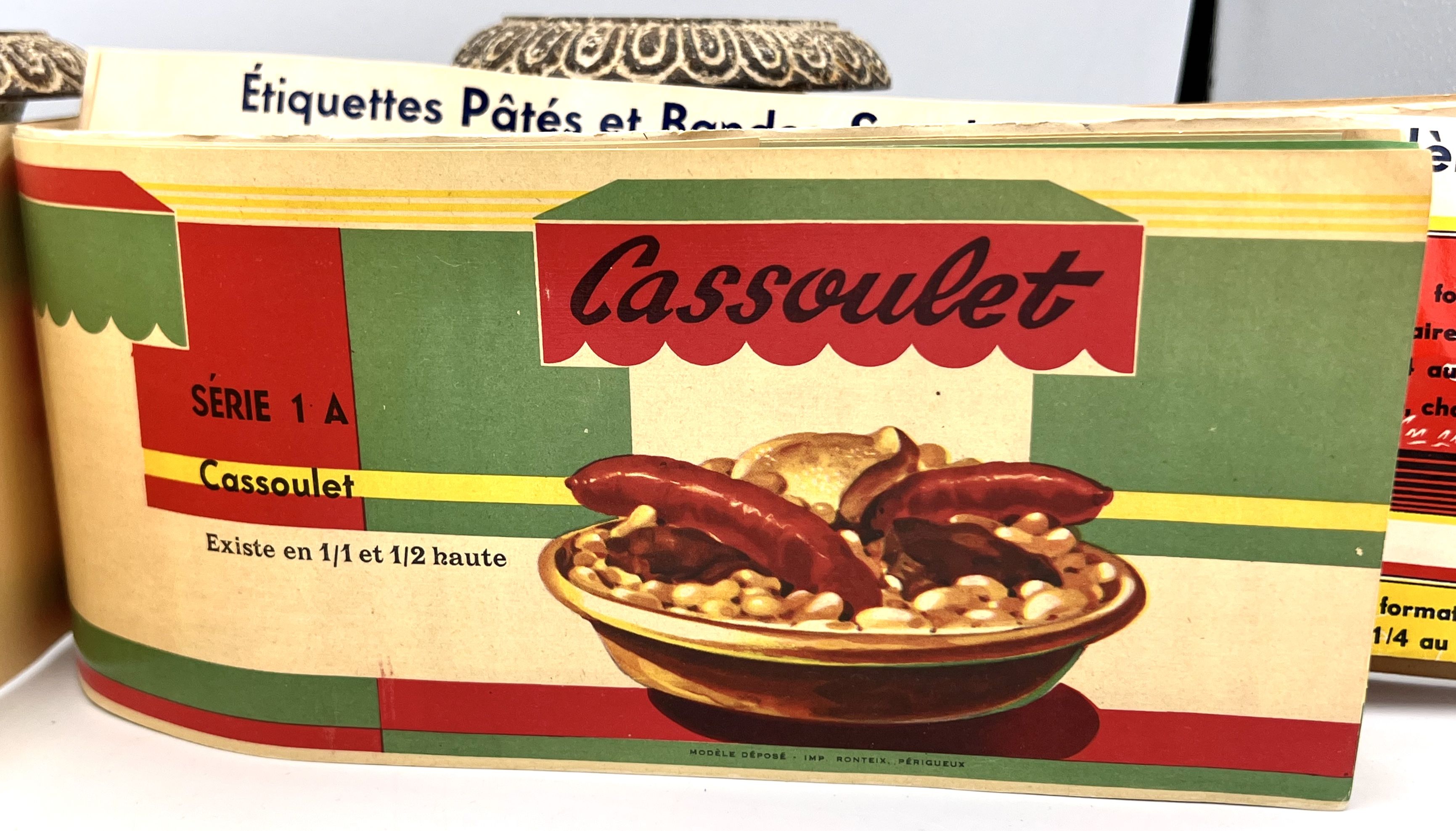 Périgueux, France: Imprimerie Ronteix , 1954. Staplebound. Tan wraps. Very good. Unpaginated [17pp.] Title: Extract from the General Catalog of all-purpose Labels for Canned Goods - Collection of "Cooking Dishes" labels. French colorful trade catalog with an emphasis on canned food products. Merchandise includes Cassoulet, Tripe, Foie Gras, Patés, and more. A signed, typed letter in laid in from the owner of the business explaining the procedure to order and describing the companies ability to print any design a customer can think of. Clean and crisp copy.