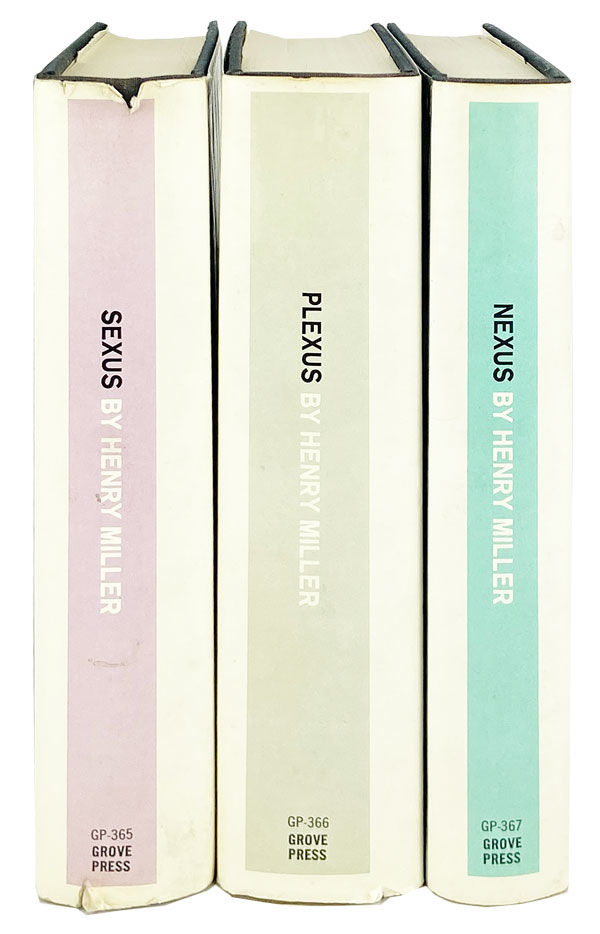 New York: Grove Press, 1965. Very Good+/Very Good. New York: Grove Press, [1965]. First Grove Editions. Three volumes; octavos (21cm.); publisher's cloth in white dust jackets all retaining original prices ($7.50, $7.50, and $5.00). Light wear to jacket extremities including a few short closed tears at spine crowns, titling on spine panel of the Plexus volume a bit faded, contemporary ownership rubberstamp to front free endpapers, else a Very Good, sound set overall.