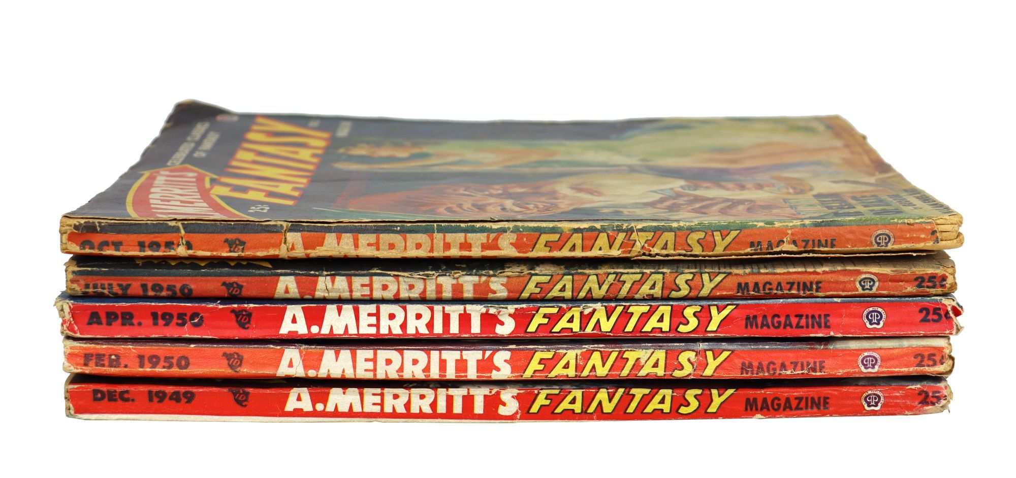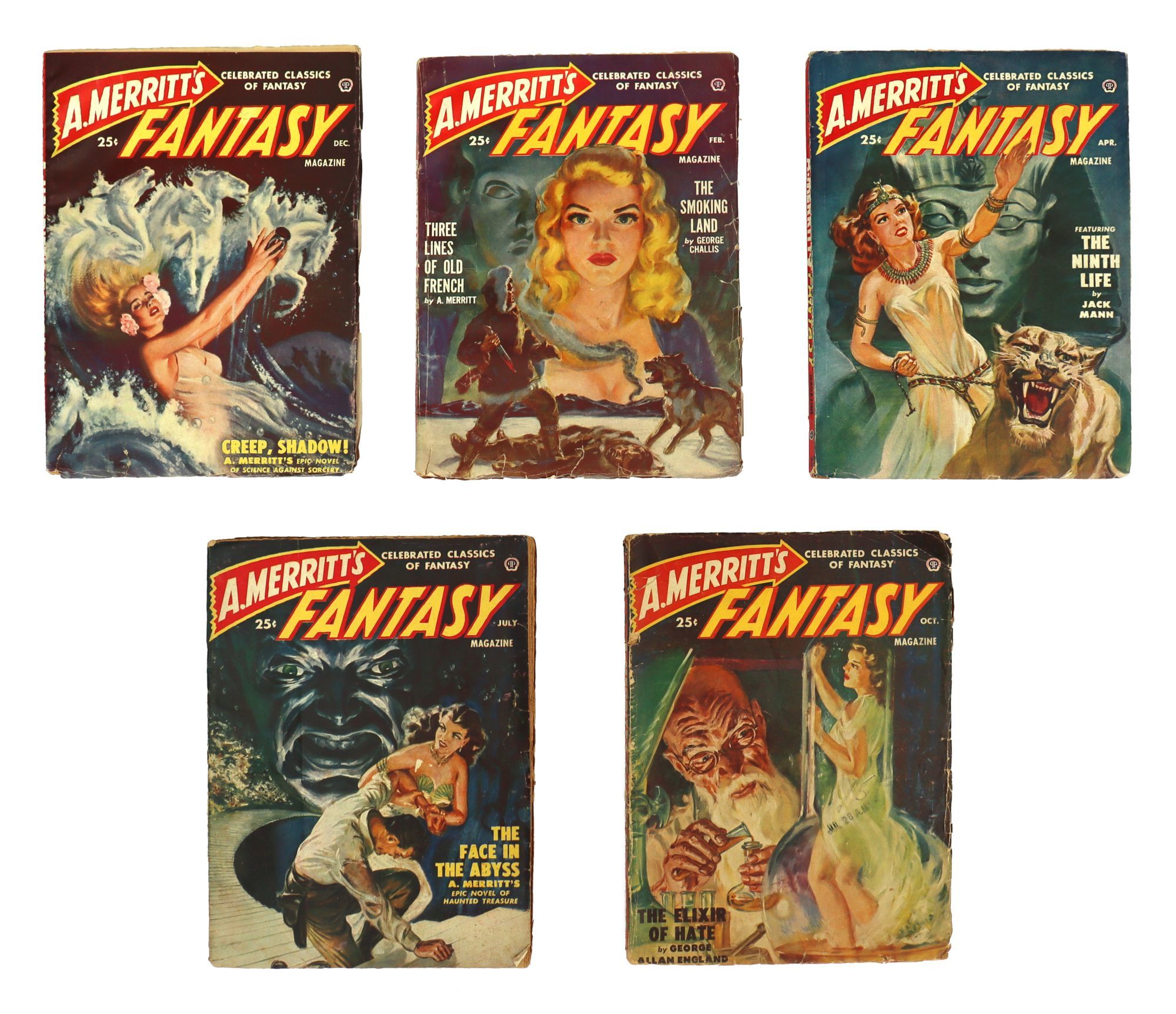 Complete run of the short-lived pulp named to surf the popularity of the six-years-deceased Merritt. The magazine reprinted three works by Merritt -- Creep, Shadow! (novel), "Three Lines of Old French" (short story), and The Faced in the Abyss (novella) -- as well as a biographical portrait in the final October issue. The run also included Max Brand's (as George Challis) The Smoking Land, Jack Mann's The Ninth Life, George Allan England's The Elixir of Hate, Jack Williamson's "Racketeers in the Sky," art by Virgil Finlay, Paul Calle, H.R. Van Dongen, and a letter to the editor by an opinionated and question-brimming 15-year-old Robert Silverberg, among others. The magazine folded before a planned sixth issue was finished.