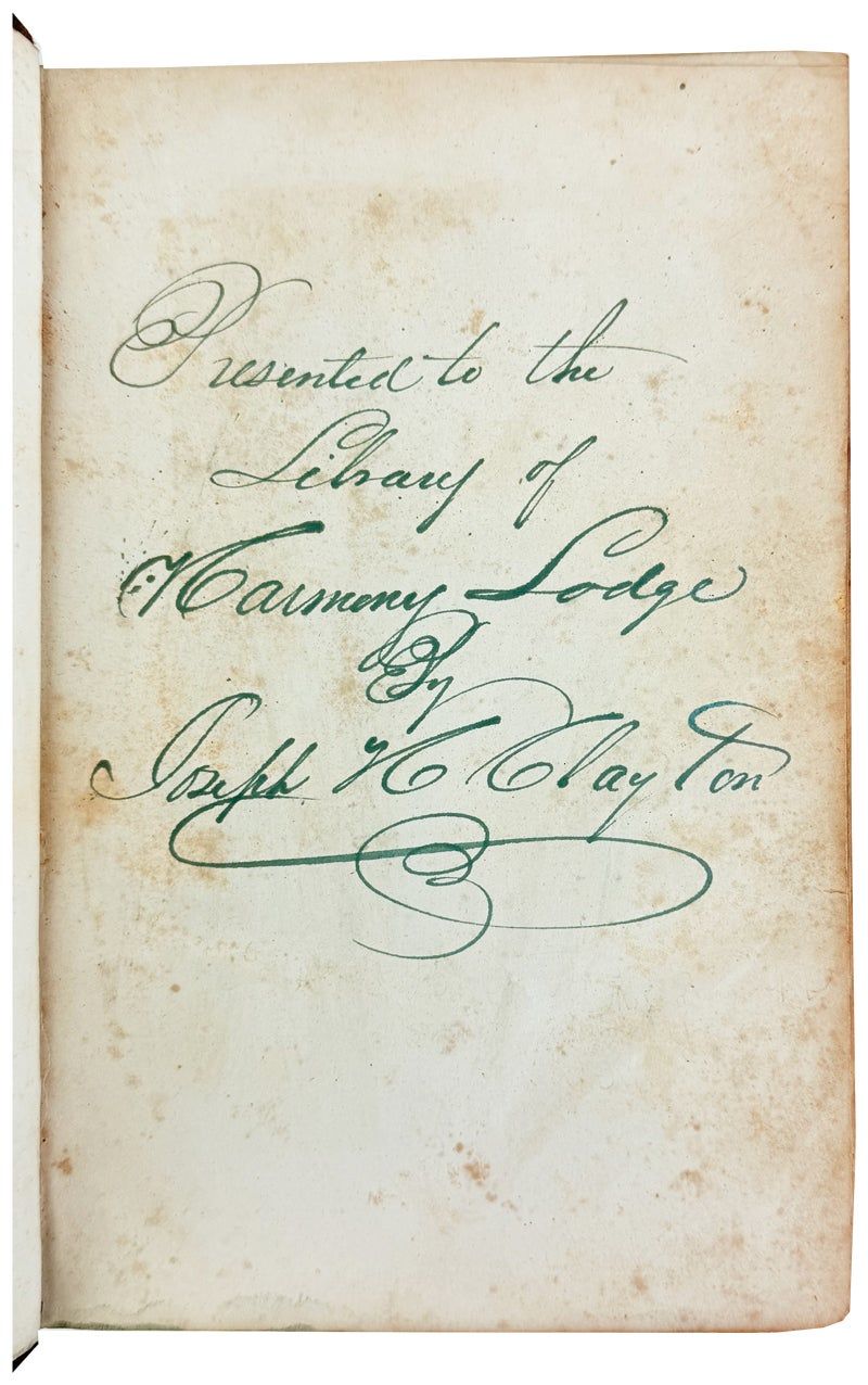 Boards worn and scuffed with chipping to extremities, split at top of spine, heavier rubbing and surface fractures to spine, and front board bowed towards fore-edge, binding otherwise sound. Map toned with a few splits along folds, else intact and sound. Ownership inscriptions of Joseph H. Clayton to endpapers, along with his inscription presenting the volume to the Library of Harmony Lodge. Clayton is also listed in the subscriber list at rear with residence listed as New Haven. Very Good copy of a scarce local history, uncommon with the hand-colored map. .