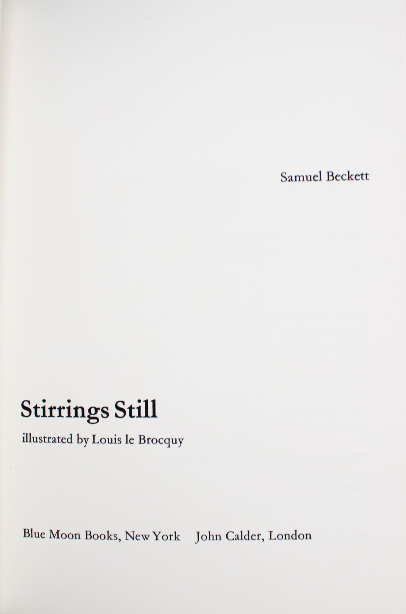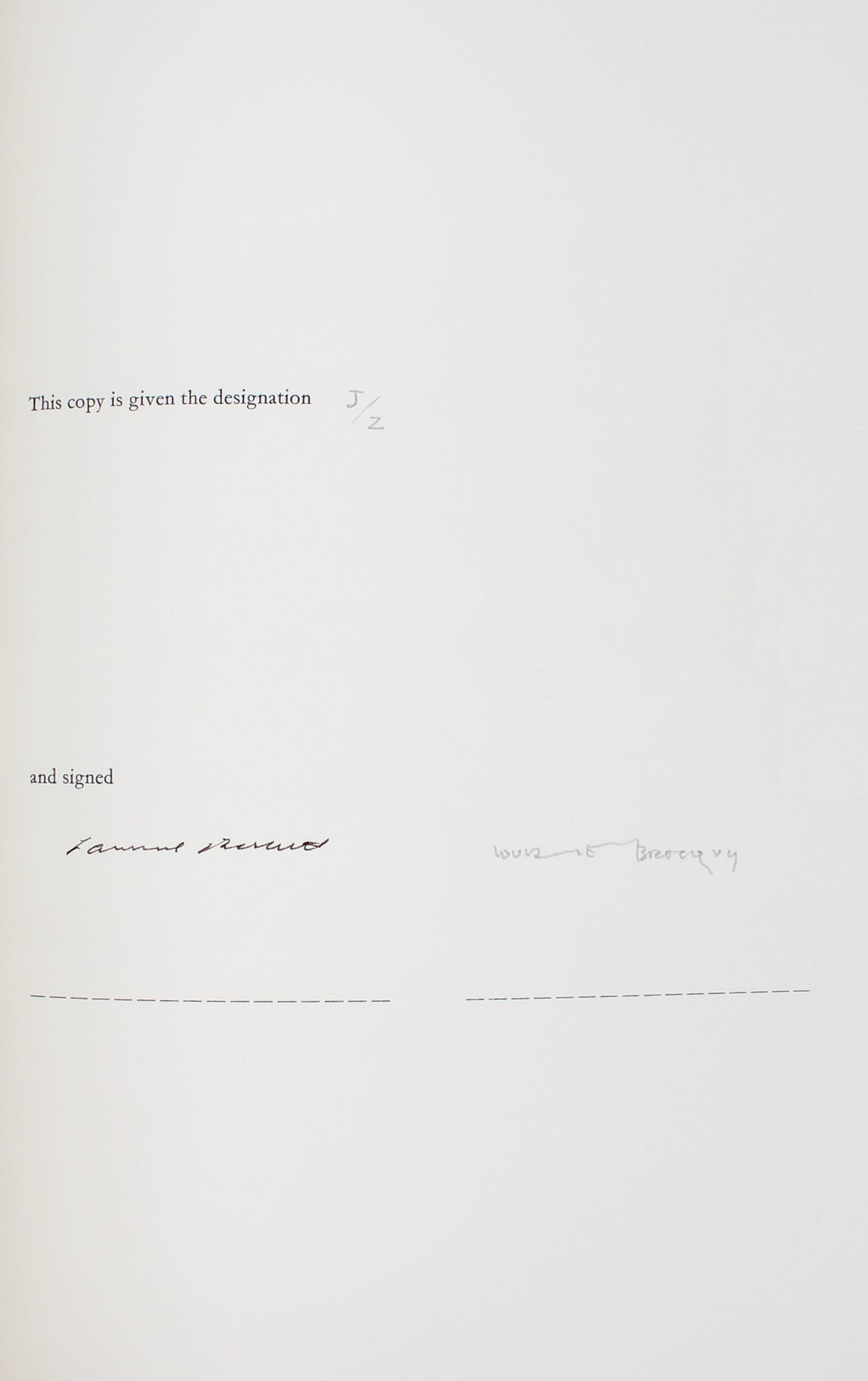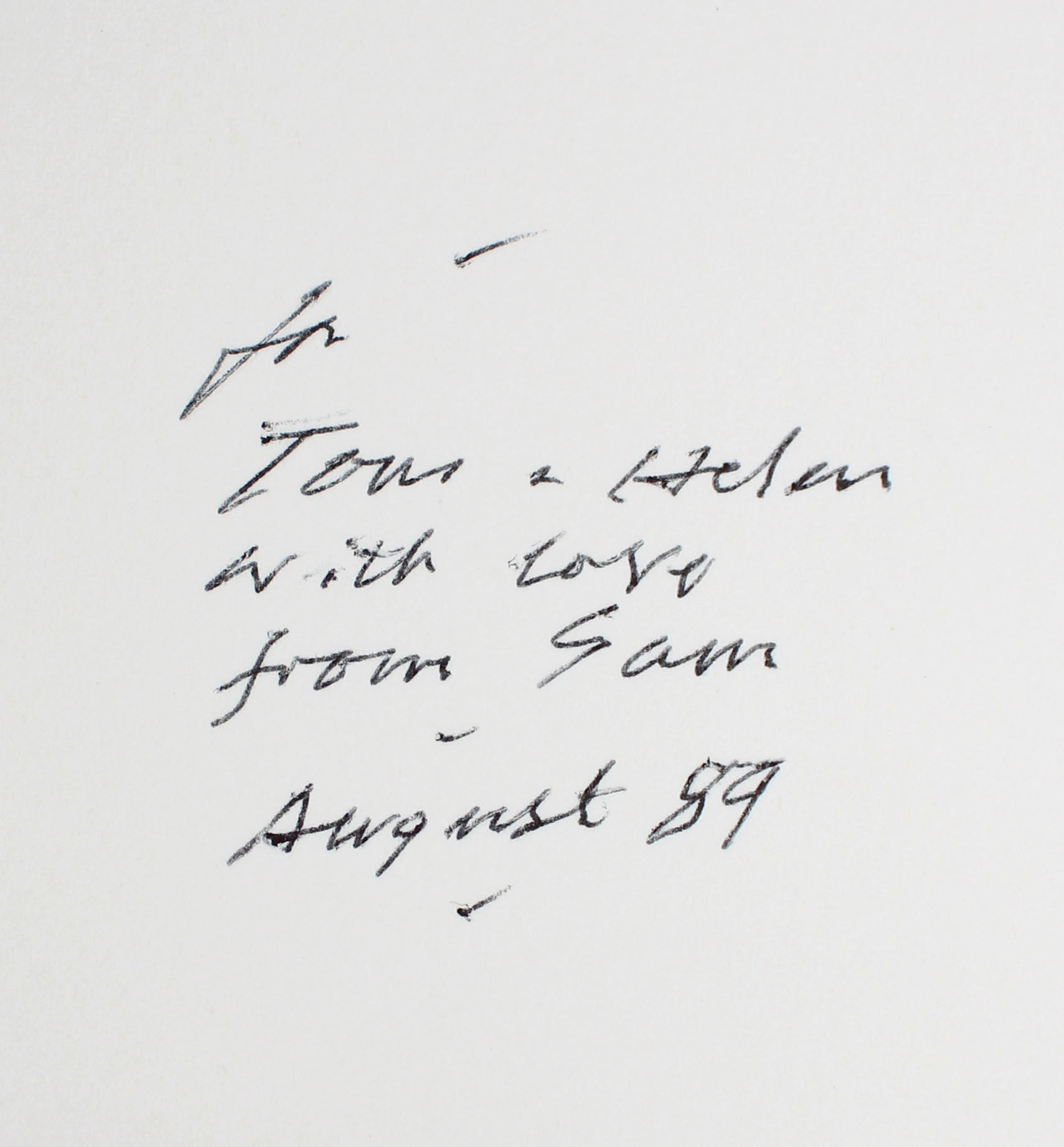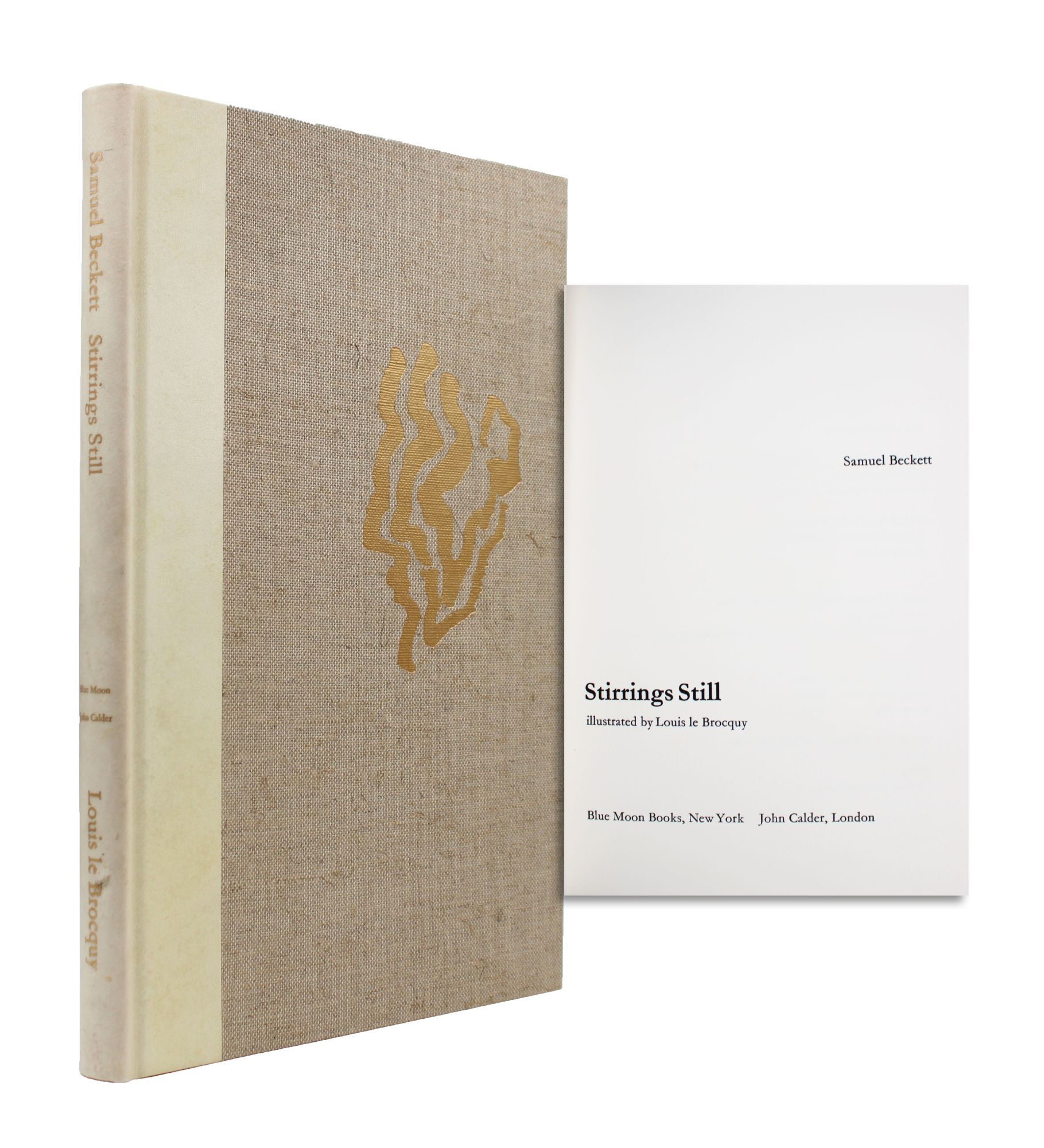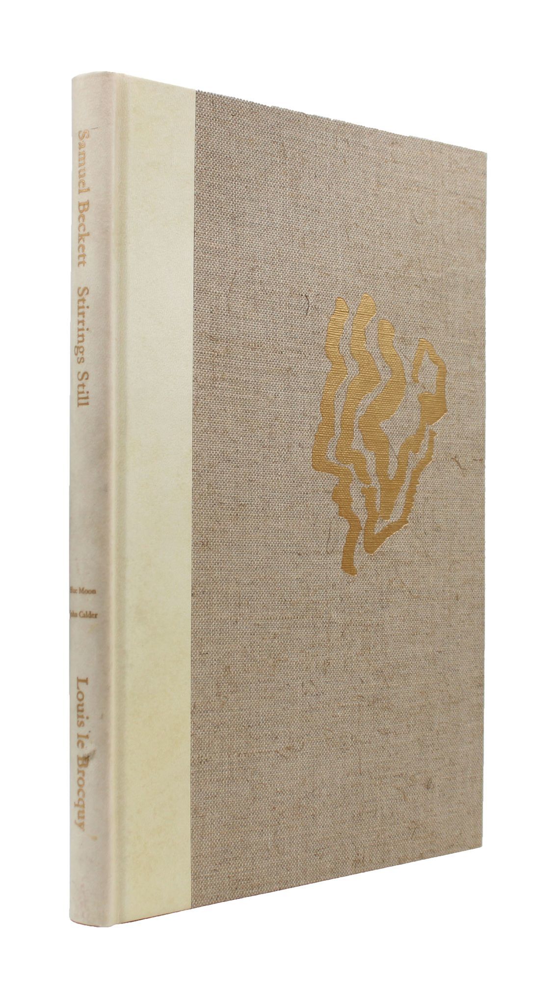 New York/London: Blue Moon Books and John Calder, 1988. Edition of 200, with a further 26 copies designated A-Z, all signed by the author and the artist. This is copy J of 26. Inscribed. Illustrated by Louis Le Brocquy with one color lithograph and eight lithographs in black. 1 vols. Folio. Publisher's parchment-backed linen boards stamped in gilt after a design by De Brocquy, slipcased as issued. Brocquy, Louis le. Edition of 200, with a further 26 copies designated A-Z, all signed by the author and the artist. This is copy J of 26. Inscribed. Illustrated by Louis Le Brocquy with one color lithograph and eight lithographs in black. 1 vols. Folio. This a presentation copy on the half-title inscribed by Beckett "for/Tom & Helen (Bishop)/with love/from Sam/August 89.