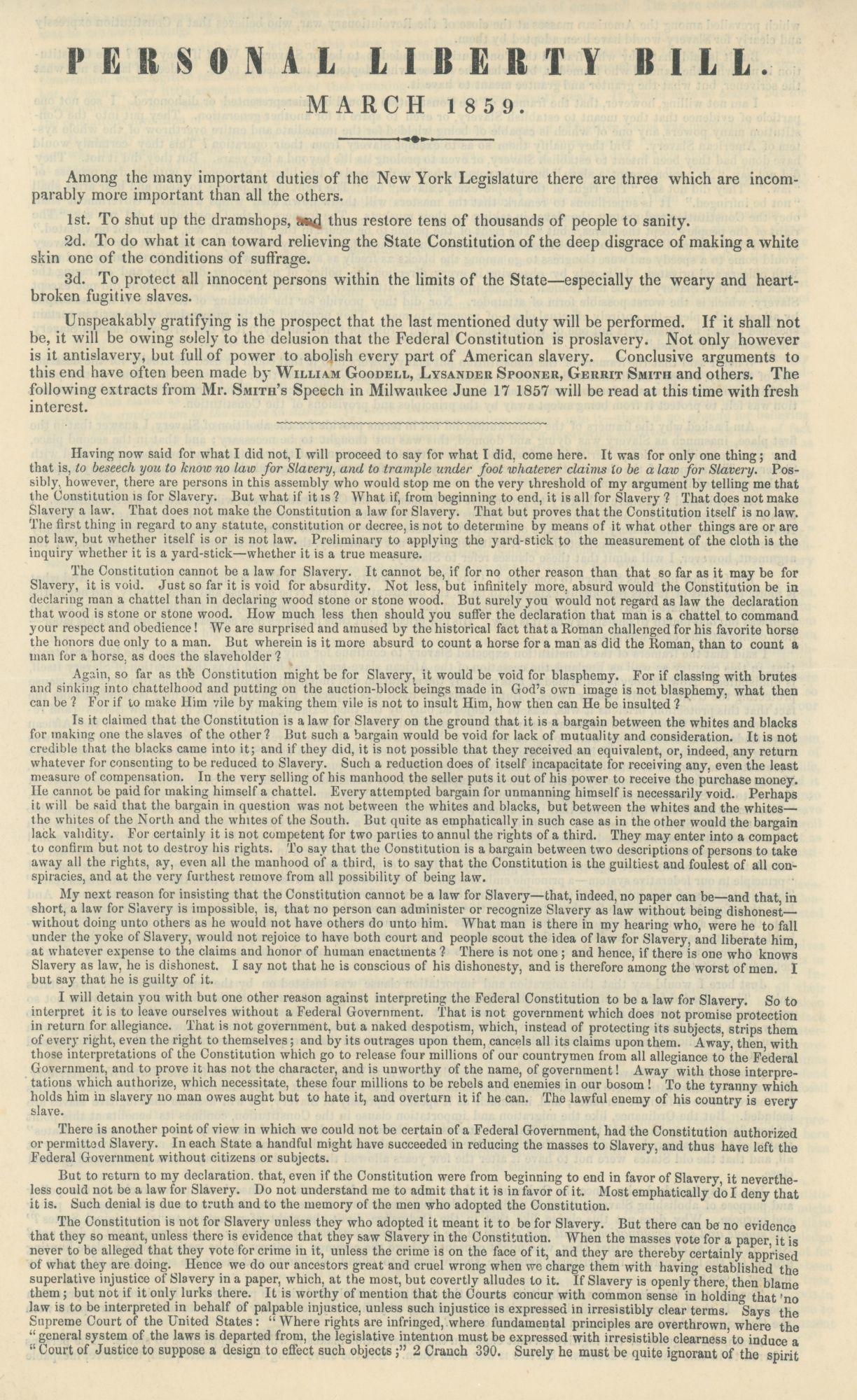 [Peterboro?], 1859. Four page bilfolium, 12 ½ x 8 inches. Fine condition. Fine. An uncommon imprint likely printed by Gerrit Smith in Peterboro, in 1859, the bulk of which reprints one of Smith’s speech from June 17, 1857 in Milwaukee. The speech mostly addresses the constitutionality of the Fugitive Slave Act, a piece of legislation which galvanized the abolition movement and convinced many that violent resistance was justified. The preamble to Smith’s speech lists three of duties of the New York Legislature: to close the dramshops, to prevent withholding suffrage from black men, and to protect the "weary and heart-broken fugitive slaves" within state limits.