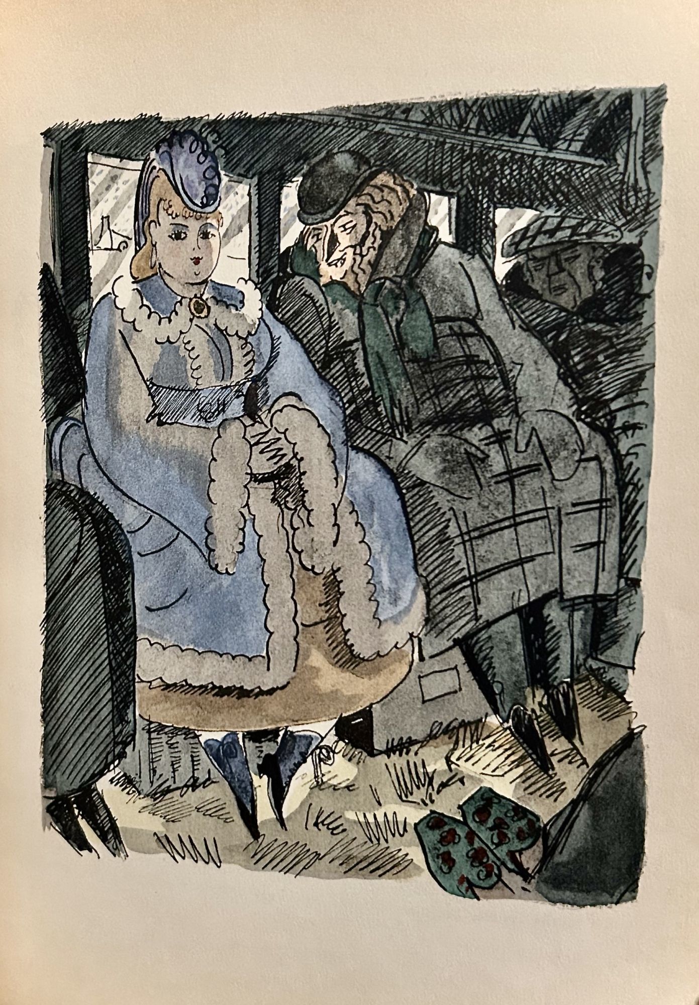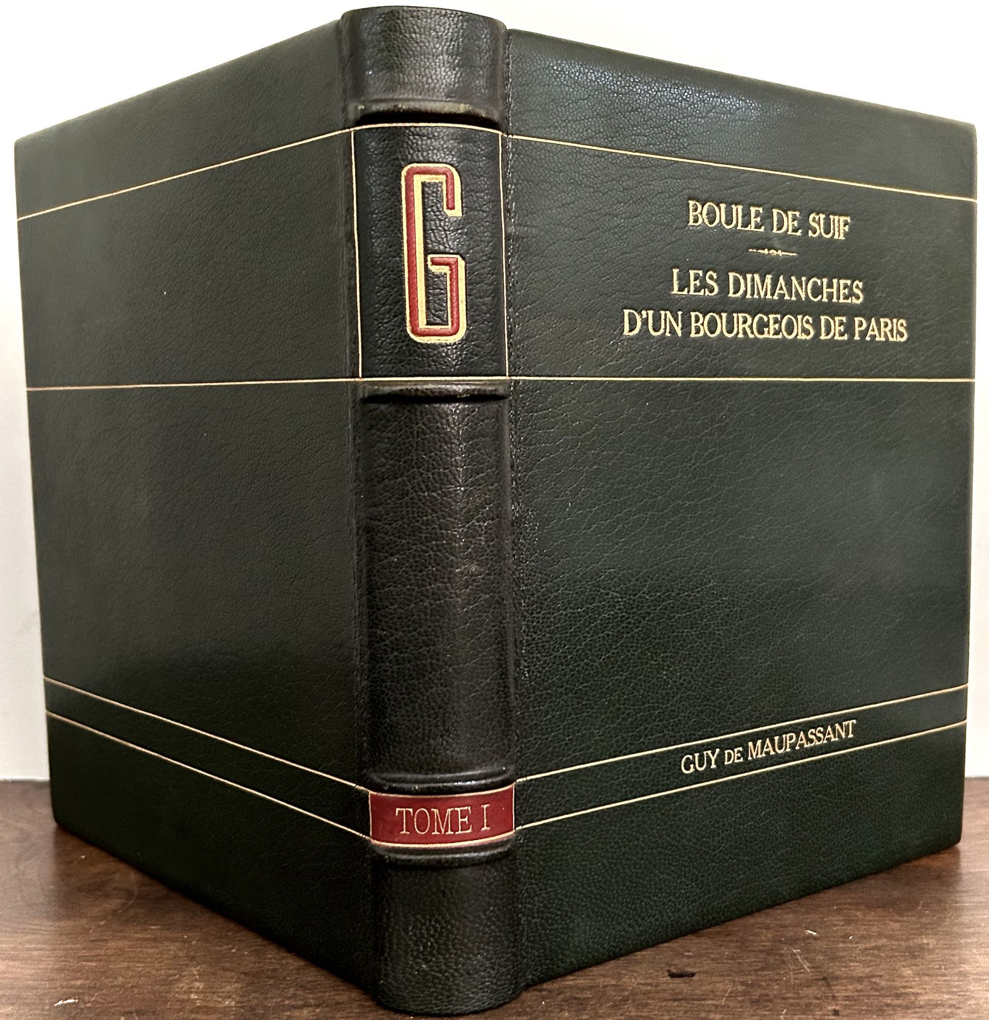 Paris: Librairie De France, 1934. leather_bound. Full black morocco, raised bands, spine in gilt and colors, front cover lettered in gilt. Teg. Fine. 387 pages. 24 x 19 cm. Eight full page pochoir plates executed by Jacomet, 55 full page black and white plates by Victor MIchel, and a host of black and white text illustrations. Boule de Suif, translated variously as Dumpling, Butterball, Ball of Fat, or Ball of Lard, is a short story by the late-19th-century first published on 15/16 April 1880. Limited edition, copy 685 of 1150 on alfa satine Navarre. Elegant unsigned binding, inner dentelles, green silked and marbled board endpapers, spine of original paper bound edition laid-in. Interior fresh and day printed.