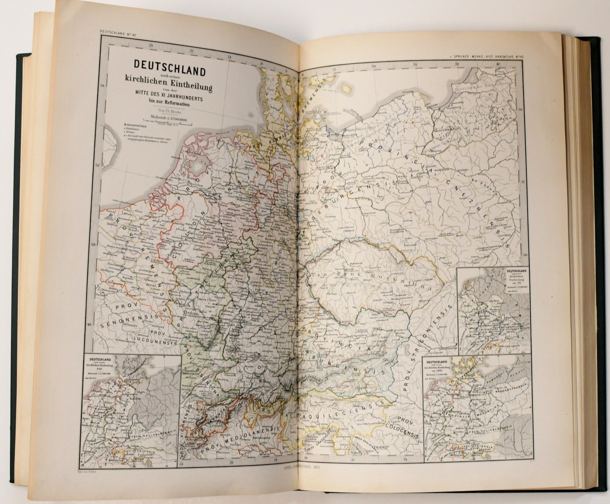 Gotha: Justus Perthes, 1880. Hard Cover. Near Fine binding. Folio; rebound in green cloth with titling in gold to the spine; [ii],[2], 3-42 pages, followed by 89 of 90 double-paged maps [NOTE: this copy appears to be lacking Map VIII: Europa wahrend des Zeitraums der Reformation und der Uebermachtdes Hauses Hapsburgh 1492-1618]; the maps are steel-engraved, with coloring to the borders of the countries; one maps in color lithography.~~This copy is bound quite tightly -- so tightly that it does not lie flat when opened and to the extent that some text and perhaps some part of maps are down in the gutter. Near Fine binding.