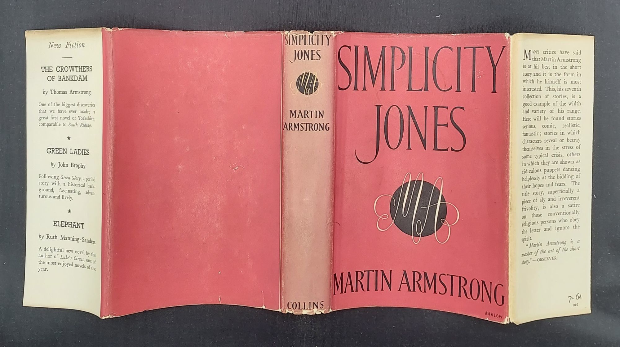 London: Collins, 1940. First edition. Hardcover. Very good minus/Very good. 250pp. Duodecimo [19 cm] Pink cloth over boards. The boards are a hair warped and the spine is subtly sunned. The text block is cracked at p. 145, however it is still very sturdy. In the dust jacket, with fading to the spine, light chipping to the edges, and a thing moisture ring stain to the front panel. The author's seventh collection of short stories. The stories here are serious, comic, realistic, and fantastic.