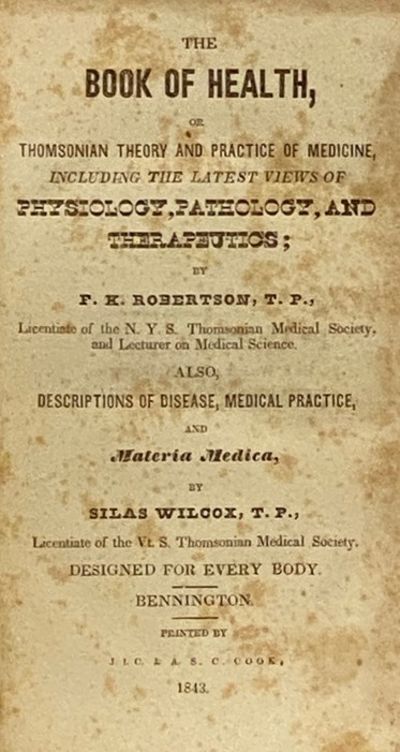 Bennington: J.I.C. & A.S.C. Cook, 1843. First Edition. Hard Cover. Good/No Jacket. First edition. Minor loss from spine head & foot, leather split along joints but binding holding strongly, though backstrip appears to have laid down and reattached directly to the text block (i.e., no mull or backing), inexpertly at some point, front & end matter foxed with minor transfer throughout. 1843 Hard Cover. 304 pp. Full sheep, gilt titles and double rules. Hoolihan 2987: '... evidences the transition within the Thomsonian movement post-1830 from [a] populist system of medical self-help into something more palatable intellectually... Samuel Thomson was highly suspicious of those who would carry his populist system into the classroom or laboratory, and jealous of those who might divert monies from his single-minded enterprise... The book of health is divided into four parts, the first two written by Robertson and the final two by Wilcox. In part one Robertson discusses the importance of the diffusion of medical knowledge, briefly reviews the life and work of Samuel Thomson, and describes the correct relation of medicine to science (i.e., regular medicine is an art; botanic medicine is a science). Part II includes a lengthy essay on physiology and hygiene, as well as chapters explaining Thomsonian pathology and therapeutics. The third and lengthiest part of the book is a manual of domestic medicine, which, though based on botanical principles, is nosologically arranged (i.e., class, order and genus) - an organization that would have enraged Thomson. Part IV provides a Thomsonian materia medica. F.K. Robertson is described on the title-page as 'Licentiate of the N.Y.S. Thomsonian Medical Society,' and Silas Wilcox as 'Licentiate of the Vt. S. Thomsonian Medical Society.' Wilcox had been a Thomsonian practitioner for ten years prior to the publication of this book, and was proprietor of a Thomsonian Depot on Main St. in East Bennington.