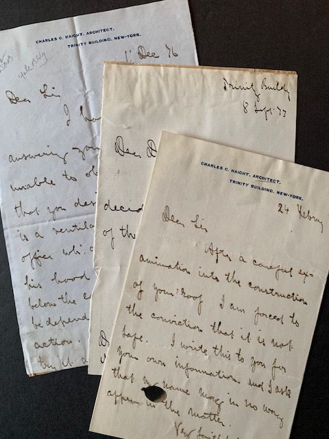 New York. Letters. Very Good. 3 signed, handwritten letters by leading late 19th-early 20th century American architect Charles C. Haight (1841-1917), who was responsible for much of the design of Columbia's previous campus (at Madison Ave. & 49th St. in NYC) and Yale's current campus. 2 of the letters are single page, the 3rd letter 2 pages. And 2 of the 3 are written on Charles Haight's personal staionary. All 3 letters are crisp and eminently legible, with a touch of staining and abrading at several spots. The letters date from 1873, 1876 and 1877.