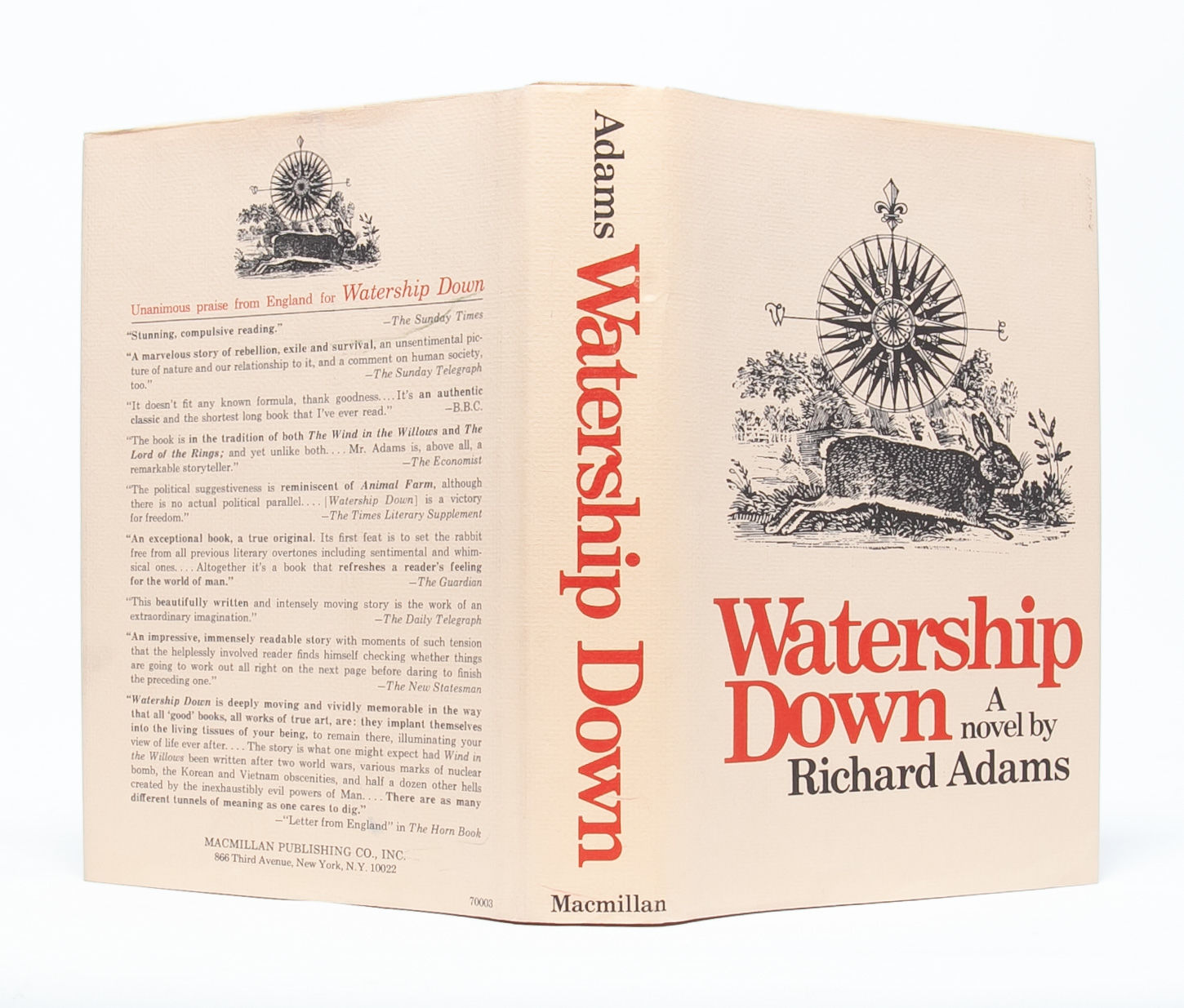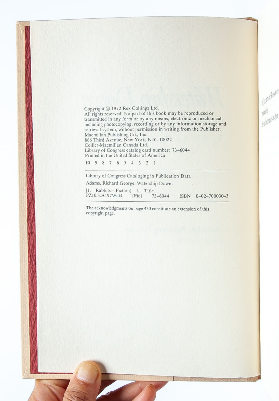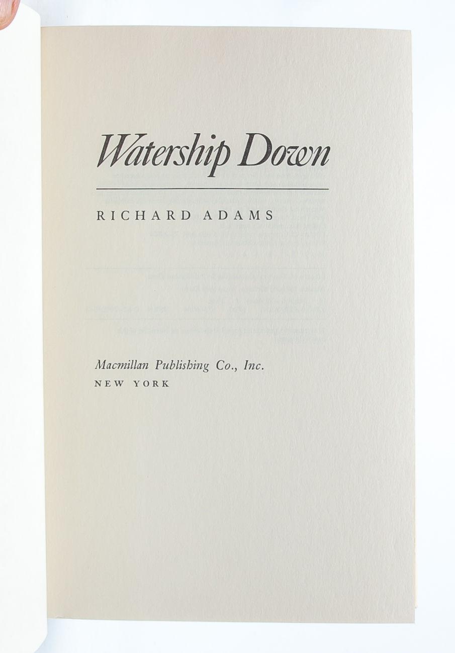 New York: Macmillan Publishing Co., Inc, 1974. First American edition. Fine/Fine. A Fine copy of the book in like dust jacket. A stray mark in green pencil on the rear jacket panel, otherwise exceptionally bright and fresh. A fantastic debut novel by Adams, ostensibly a book for children, but with themes and layers of complexity best suited for an adult audience.