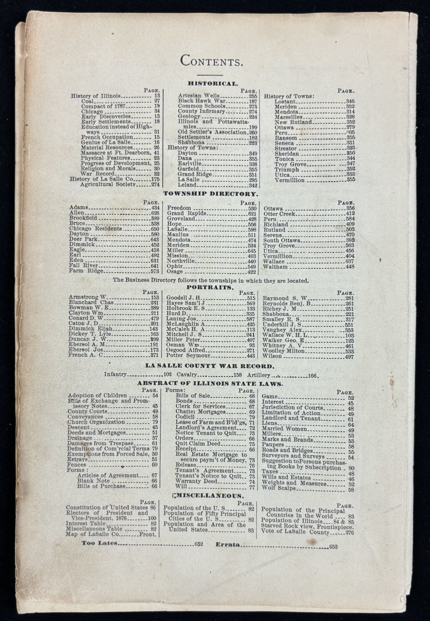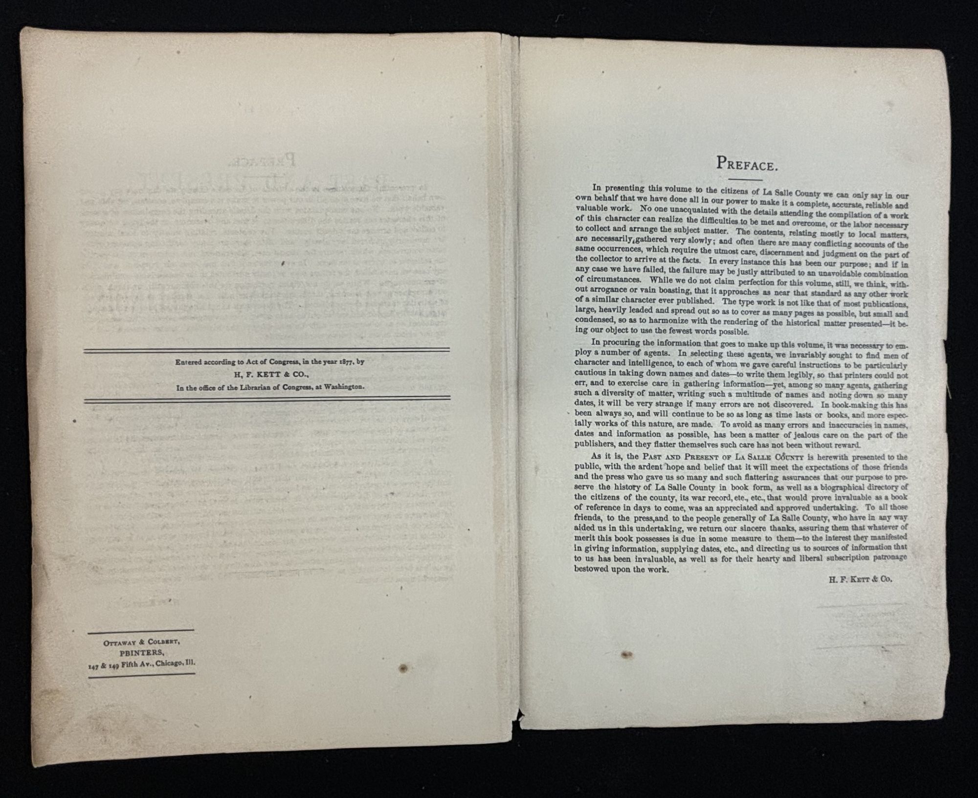 Chicago: H.F. Kett & Co, 1877. Hardcover. Octavo, 653 pages. In Good minus condition. Fully bound in original brown publisher's cloth with gilt lettering to spine and front cover. Boards show moderate wear with front cover detached, back cover loose (but attached), rubbing to spine head and tail, bumping to corners, and abrasions to back cover (with drips of something sticky). Text block shows mild age toning throughout, first four leaves detached (front free end page, county map, title page, and preface), and ownership stamps and writing to free end pages. CS Consignment. Shelved in Room G. 1374436. Special Collections.