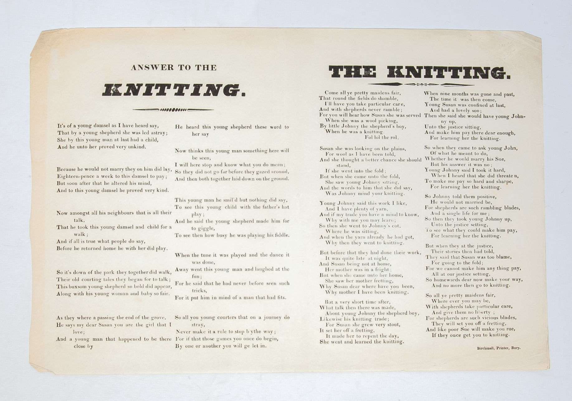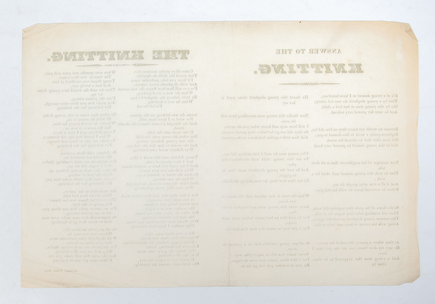 Bury: Birchinall, Printer, 1820. First edition. Near Fine. Broadside measuring 245 x 380mm and printed to verso only; the layout and placement of the imprint suggest that this piece was meant to be folded down the center with The Knitting appearing first and Answer appearing at rear. A very nearly Fine example, with just a bit of creasing at the corners and faint offsetting along the left margin. Unrecorded by the Bodleian Library of Broadside Ballads or by OCLC, the typeface suggests that it was produced toward the end of W. Birchinall's operations (1806-1829).