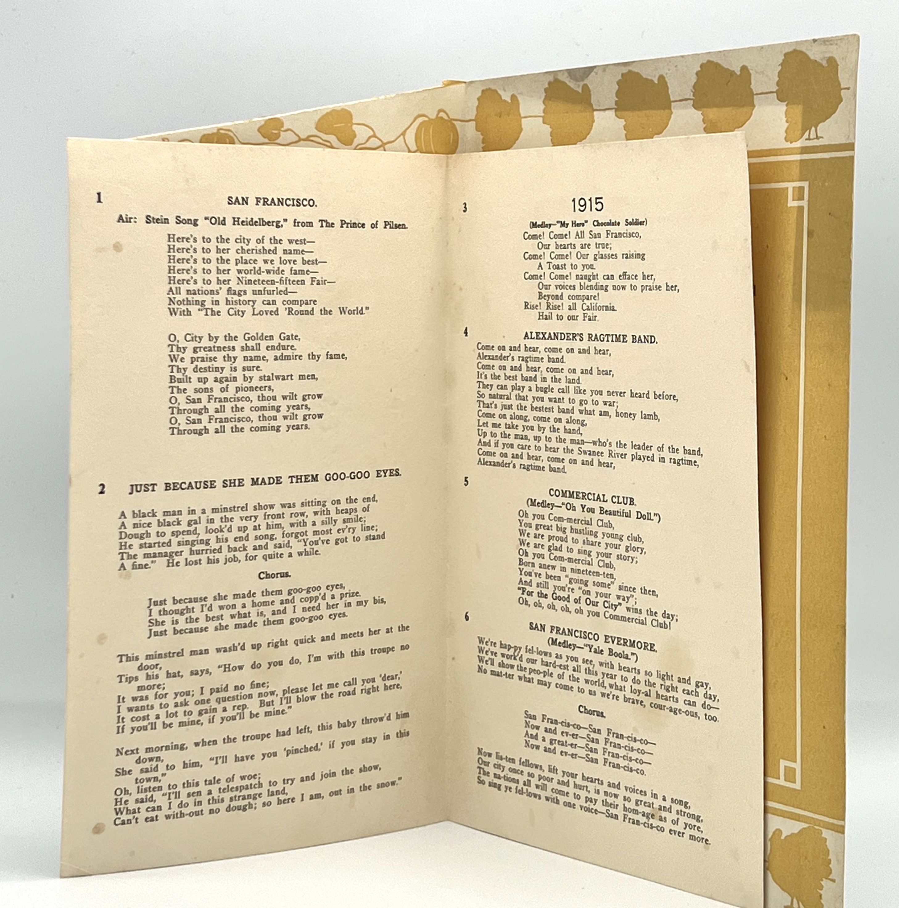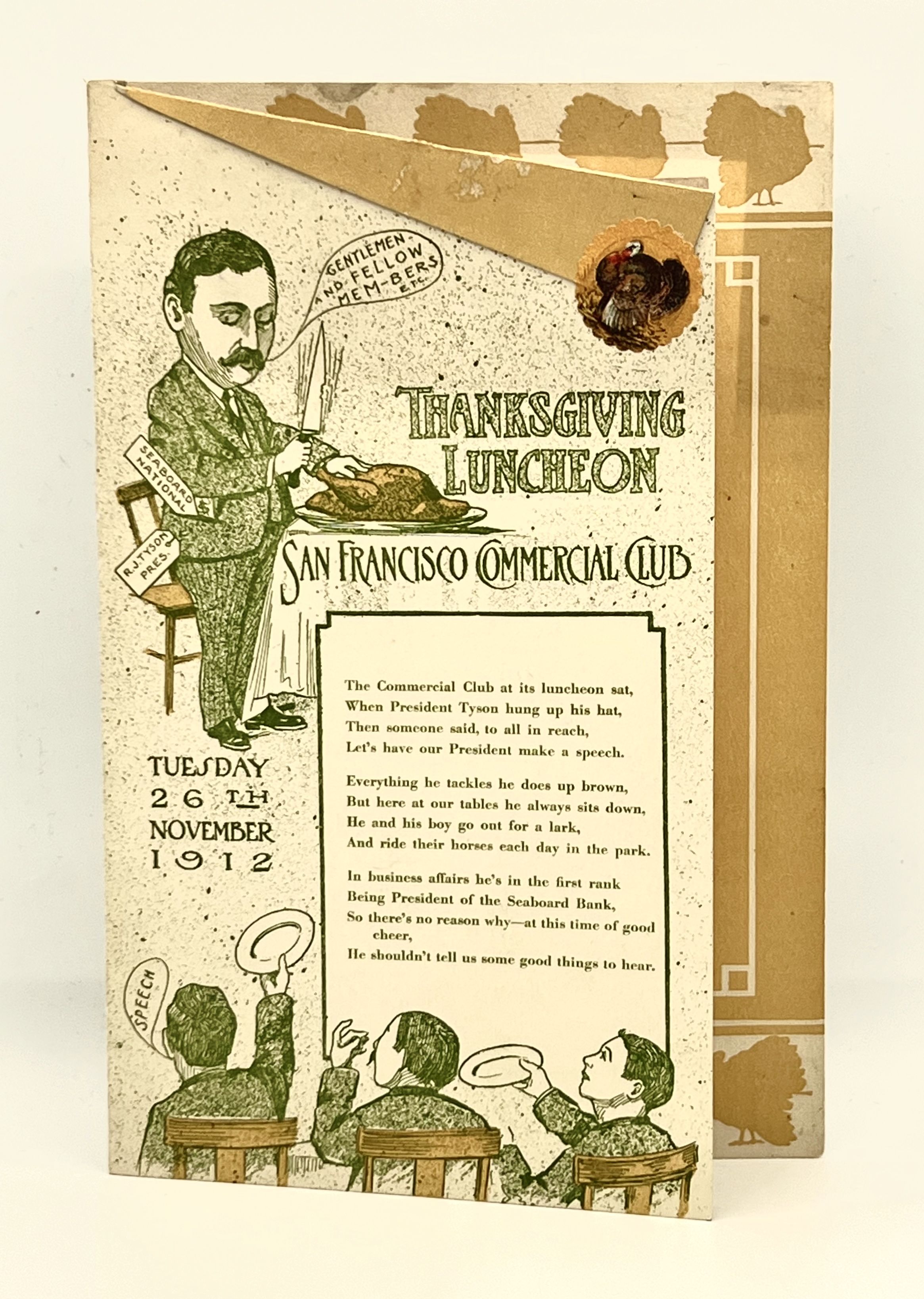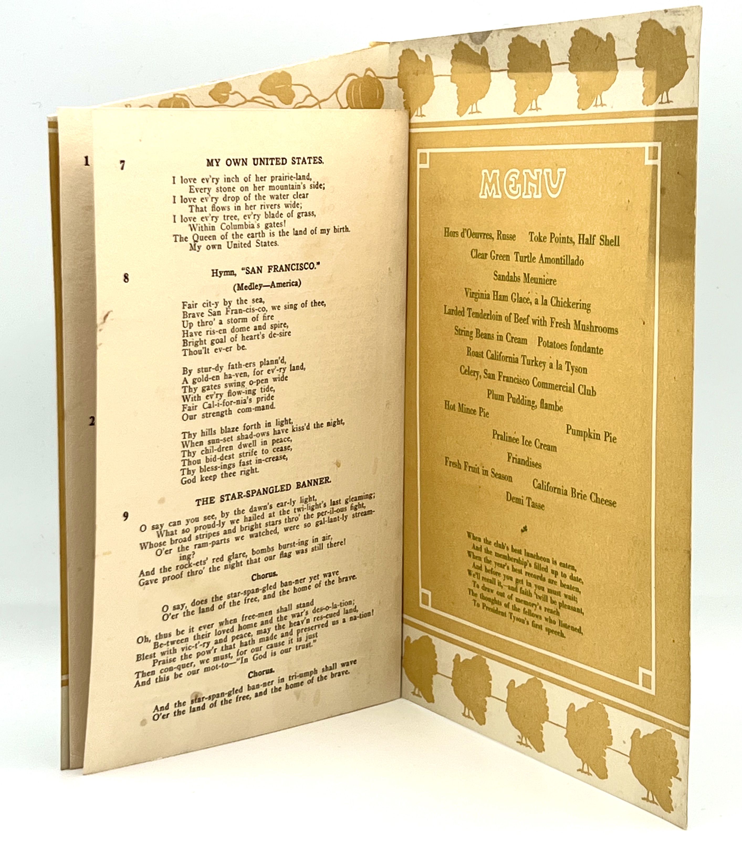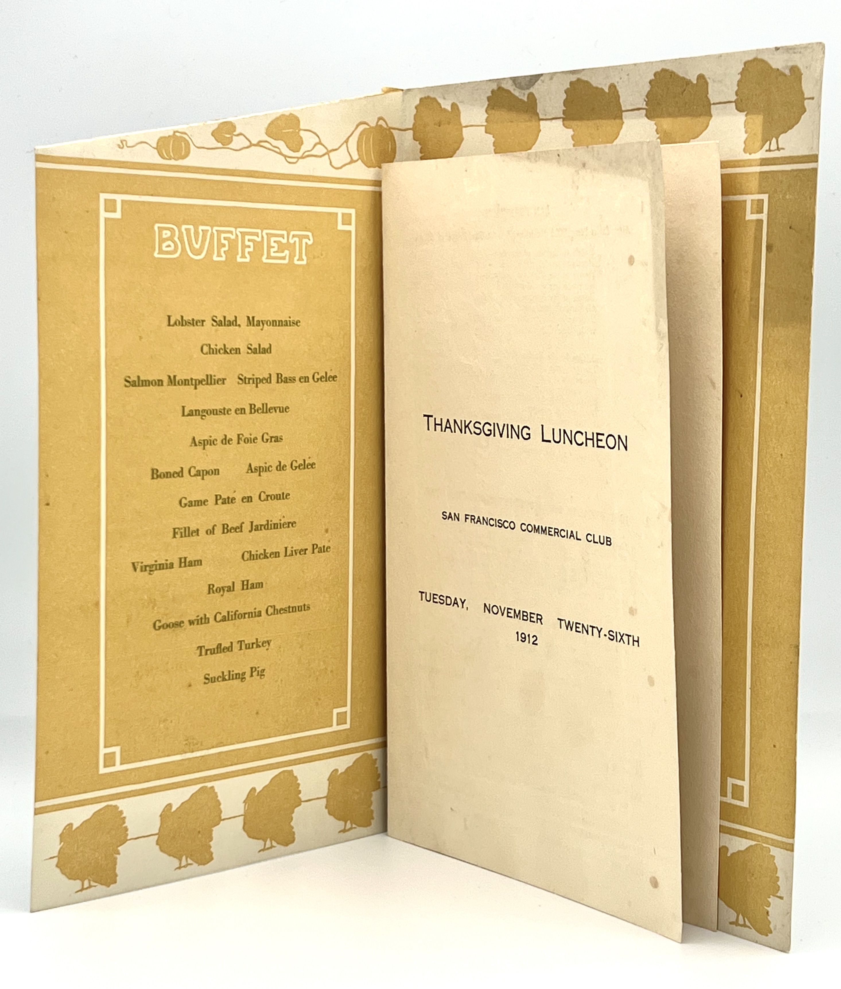 San Francisco: The Union Lithograph Company , 1912. Cards. Color illustrated cards. Very good. Located in the iconic Merchants Exchange Building, the San Francisco Commercial Club was the location where city leaders and businessmen met to socialize and address the issues of the day. Julia Morgan, the first licensed female architect in California and the first female architect to graduate from the École de Beaux-Arts in Paris was tapped to redesign and rebuild the damaged interior after the Great Earthquake and Fire of 1906. Two menus are features in this beautiful illustrated, shaped pamphlet. One menu, a Buffet, features Lobster Salad, Salmon Striped Bass, Langouste, Aspic de Foie Gras, Fillet of Beef, Goose, Truffled Turkey, and Suckling Pig. The established menu features Green Turtle soup, Sandabs, Virginia Ham, Larded Beef Tenderloin, Turkey, Pies, Fruit, and Cheese. Menu includes the original insert revealing the entertainment of the day. Cover illustration presents the R.J. Tyson, the outgoing President of the Club. Back cover illustrates a turkey hunt and the printing information: The Union Lithograph Company of San Francisco. Insert lightly foxed, otherwise clean.