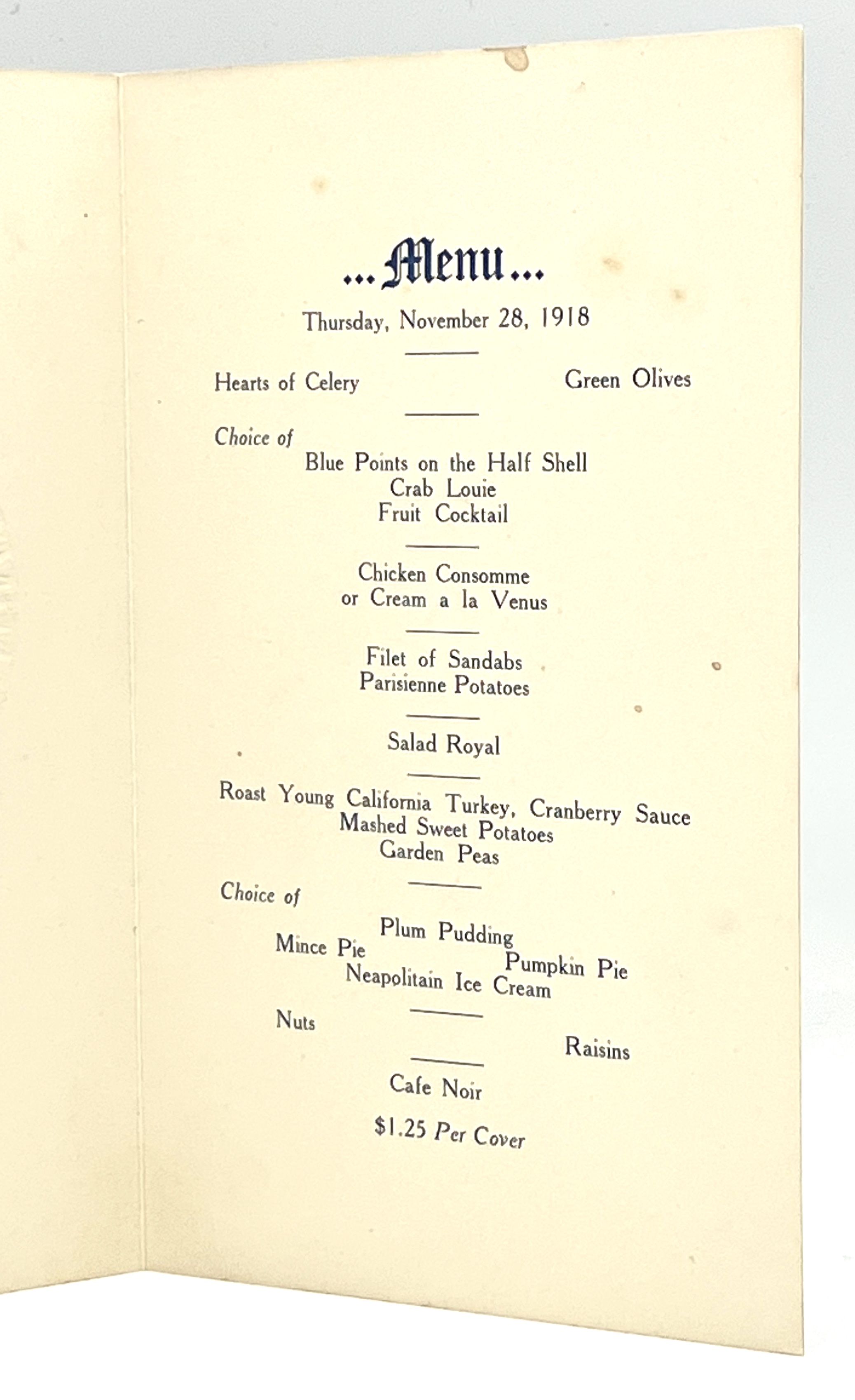 San Francisco, 1918. Cards. Cream embossed and illustrated cards. Very good. 18 x 11 cm. Embossed, illustrated Thanksgiving Menu for Thursday, November 28, 1918. Menu features: Blue Point Oysters, Crab Louie, Filet of Sandabs, Roast Turkey, Cranberry Sauce, Mashed Potatoes, Peas, Plum Pudding, Mince Pie, Pumpkin Pie and Neapolitan Ice Cream - all for $1.25! Light staining.