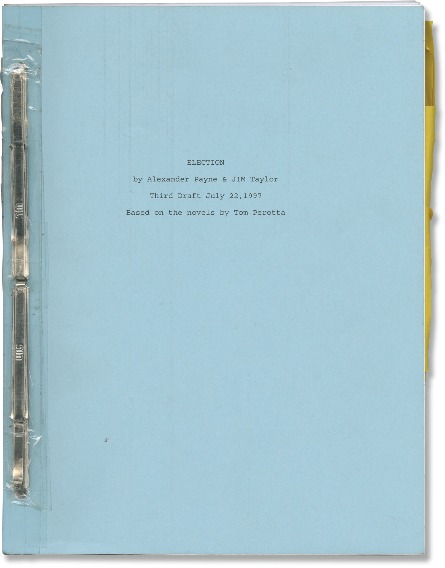 Blue titled wrappers, noted as THIRD DRAFT on the front wrapper, dated July 22, 1997, with credits for director-screenwriter Alexander Payne, screenwriter Jim Taylor, and novelist Tom Perotta. Title page present, noted as THIRD DRAFT, dated July 22, 1997, with credits for director-screenwriter Alexander Payne, screenwriter Jim Taylor, and novelist Tom Perotta. 116 leaves, with last page of text numbered 108. Xerographic duplication, rectos only. Pages Fine, wrapper Very Good plus, bound with a silver prong that has been reinforced with clear packing tape.