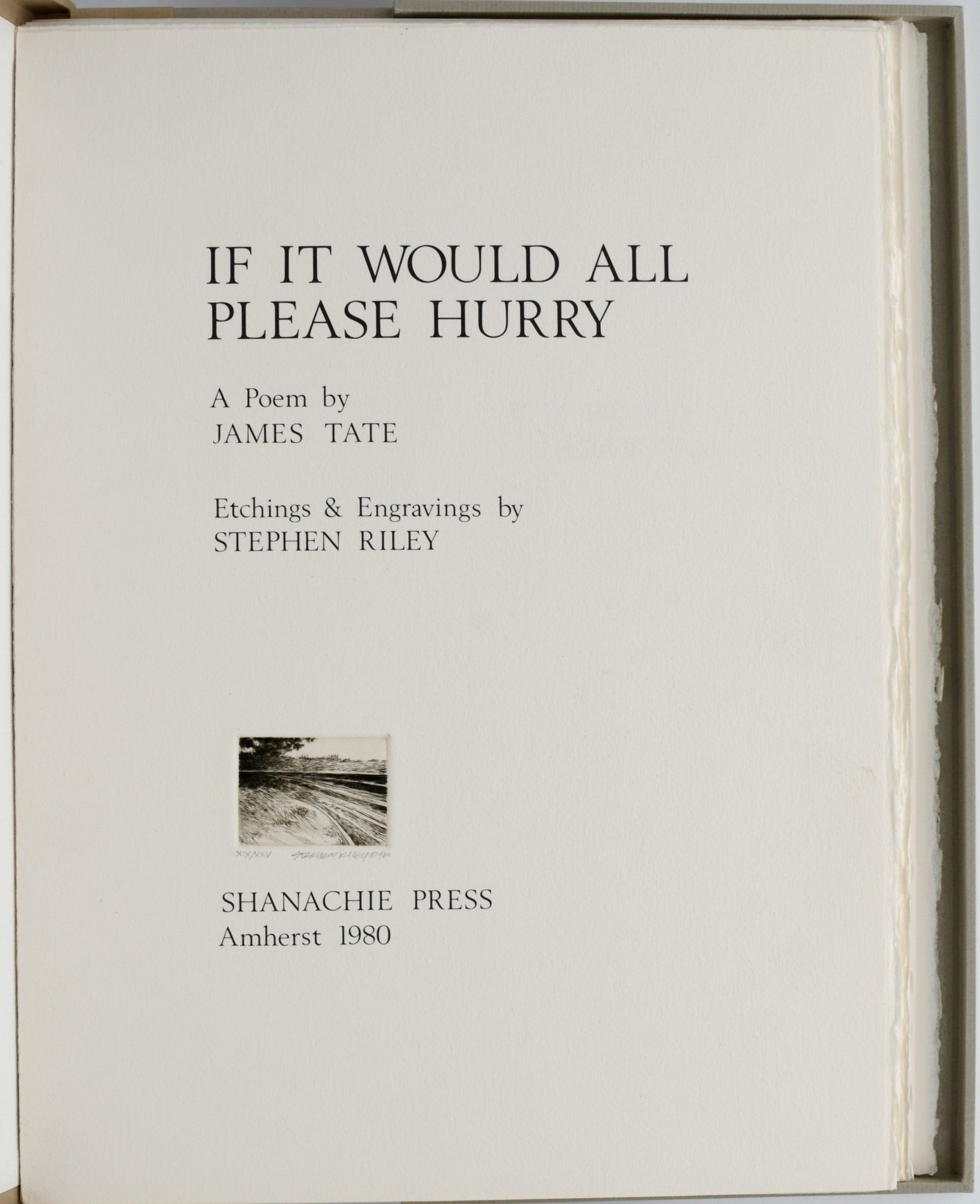 Amherst: Shanachie Press, 1980. Limited Edition. Fine binding. Stephen Riley. Signed. Copy XIX of XXV copies. Printed by the Shanachie Press and signed by James Tate and Stephen Riley. With 10 engravings and letter-pressed text laid into publisher issued box with title label on the cover; each engraving signed and numbered by Riley. Signed by Tate and Riley on the colophon.~~A beautiful collaboration, coupling James Tate's luminous poem with Stephen Riley's evocative etchings (Riley sadly died several years later). Fine binding.