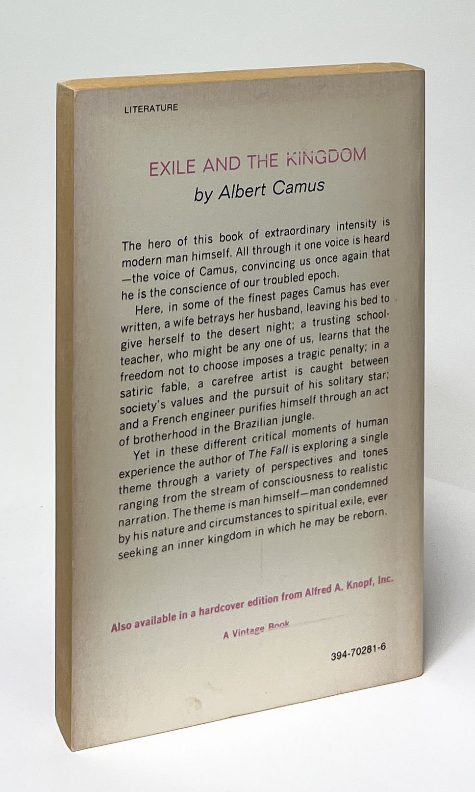 New York: Vintage Books. Mass Market Paperback. Very Good. V-281. Later Printing. Translated by Justin O'Brien. Very Good. Wraps soiled at the edges of the wraps. Firmly bound with a slight forward lean, former owner's name on the first page, clean otherwise. A work of fiction that, in typical Camus fashion, explores the theme of "man himself--man condemned by his nature and circumstances to spiritual exile, ever seeking an inner kingdom in which he may be reborn.