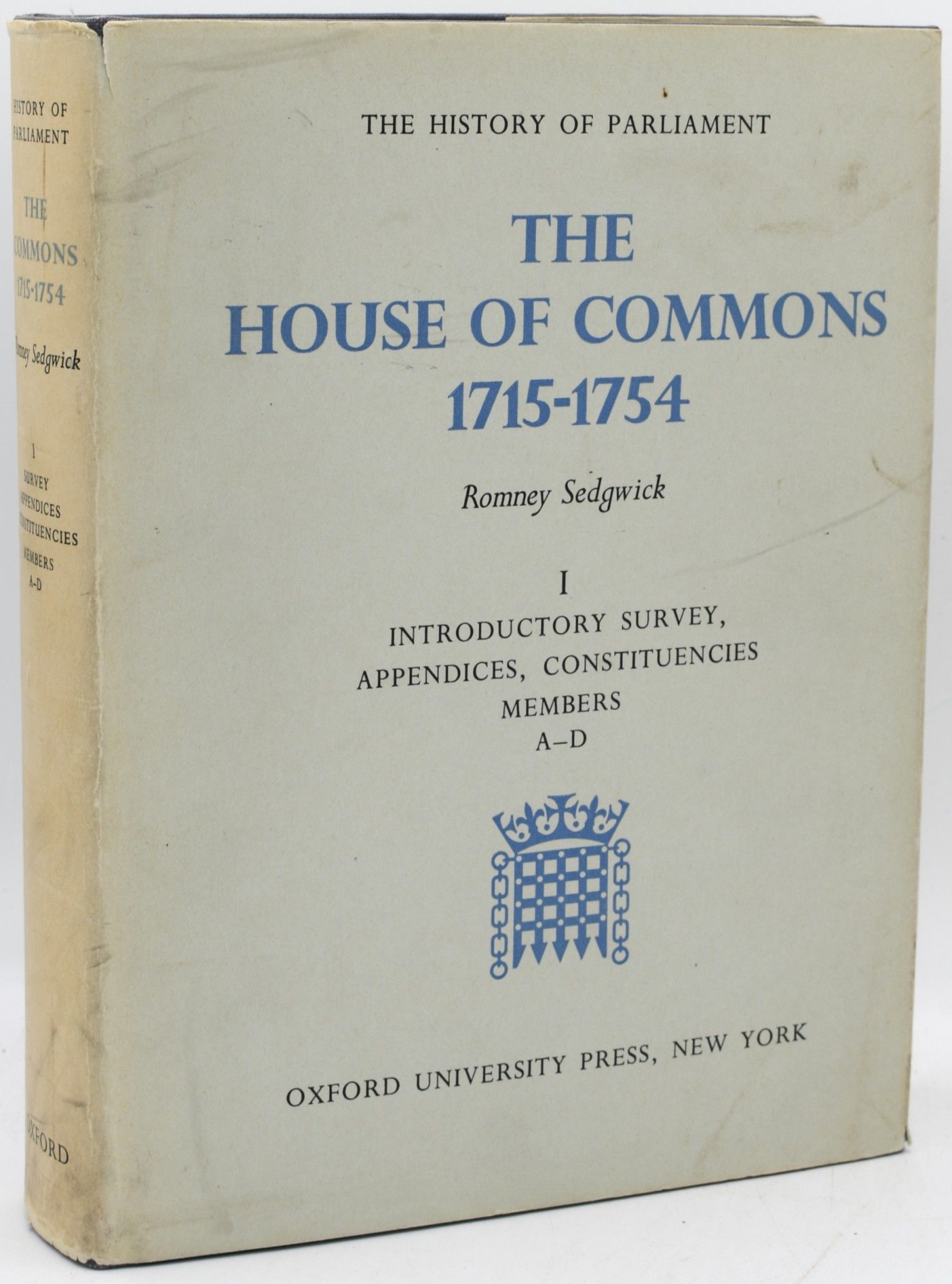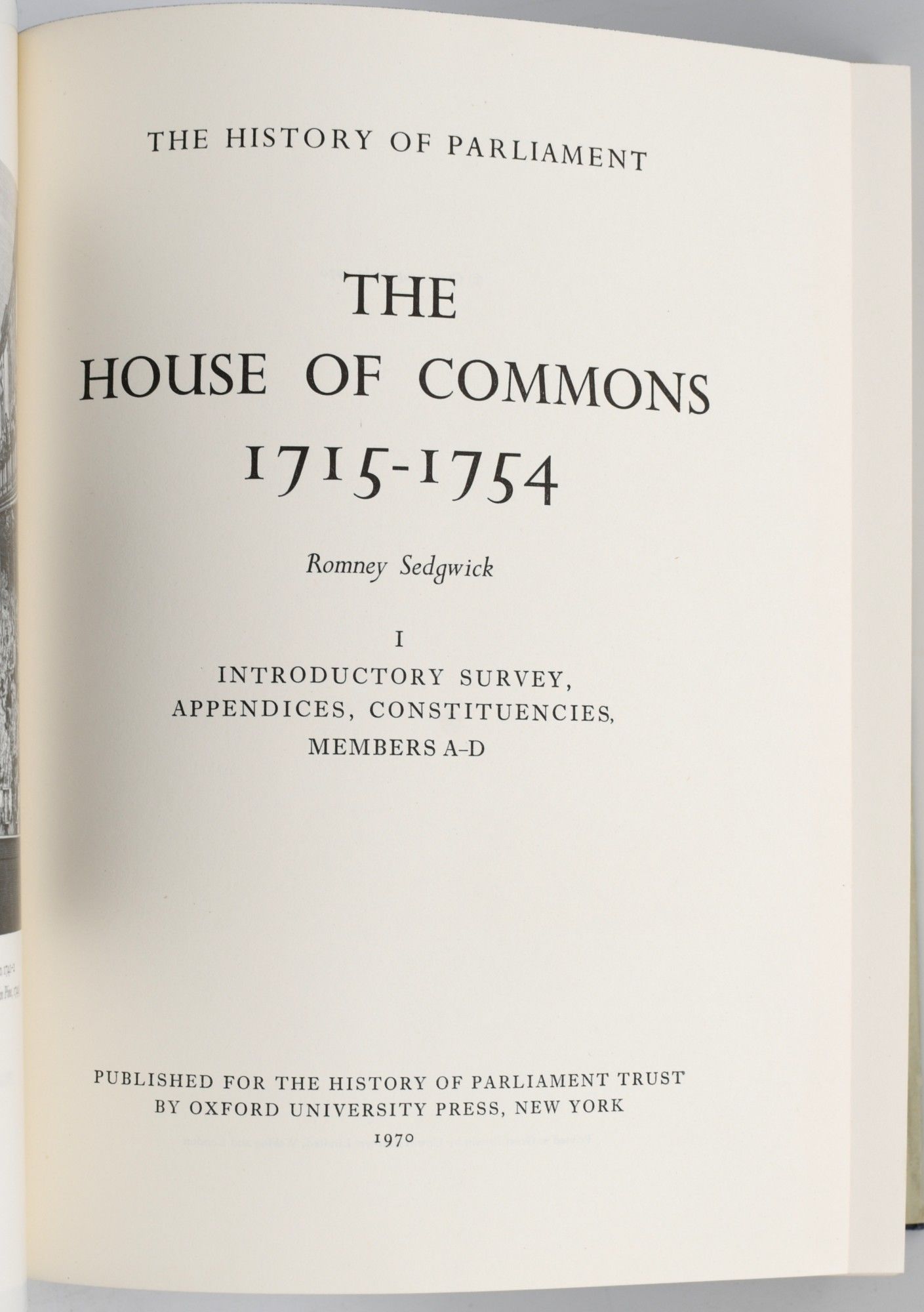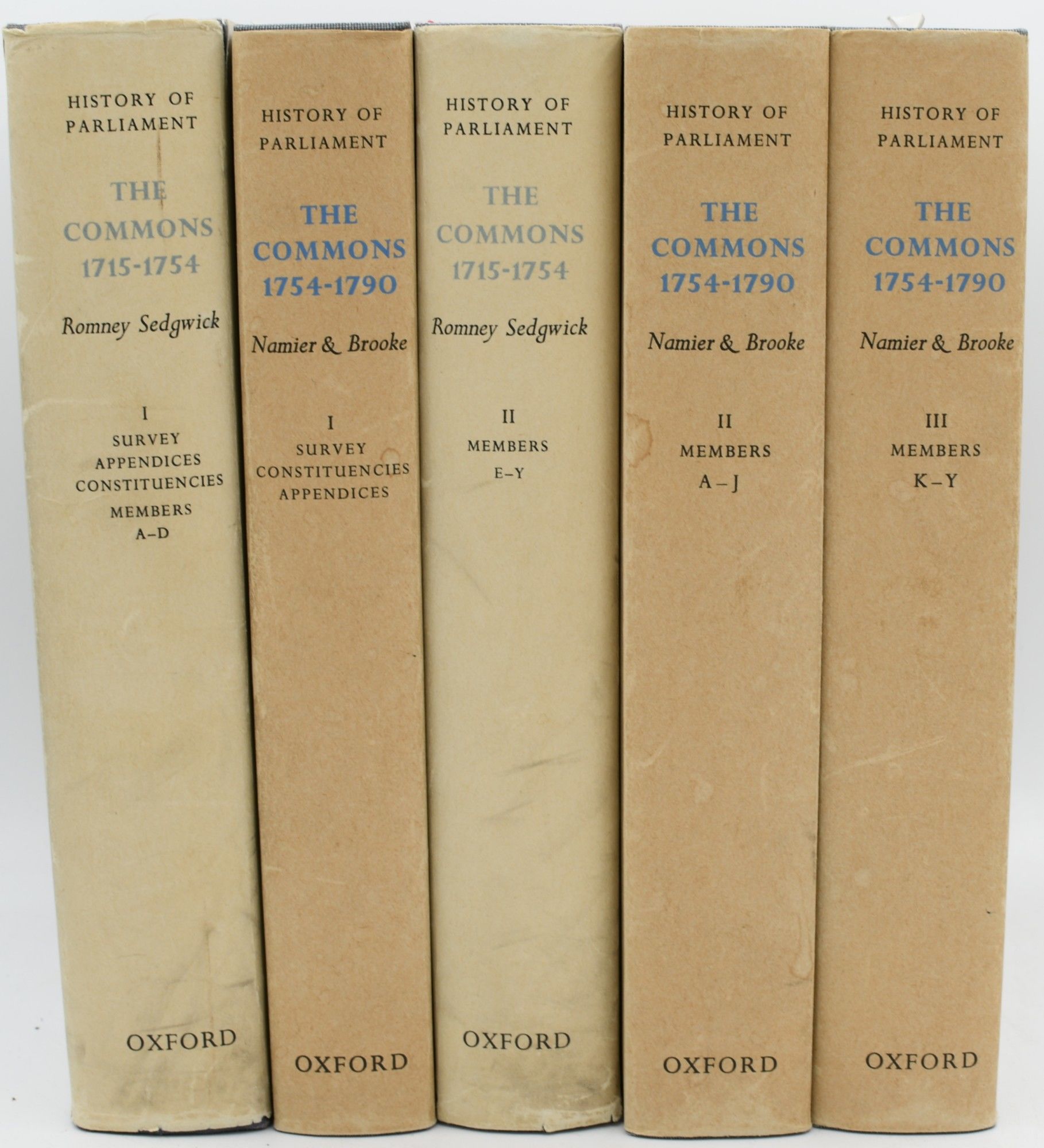 [ENGLAND] THE HISTORY OF THE HOUSE OF COMMONS [5 VOLUMES]. 1715-1754 [2 VOLUMES]: INTRODUCTORY SURVEY, APPENDICES, CONTITUENCIES, MEMBER A-D, MEMBERS E-Y; 1754-1790 [3 VOLUMES] : INTRODUCTORY SURVEY, CONSTITUENCIES, APPENDICES; MEMBERS A-J; MEMBERS K-Y. COMPLETE IN FIVE VOLUMES