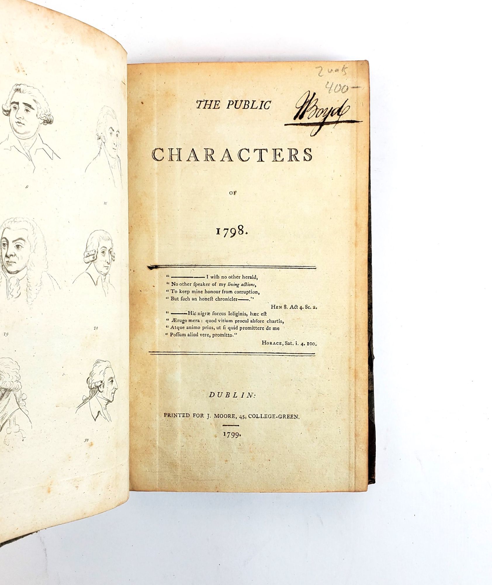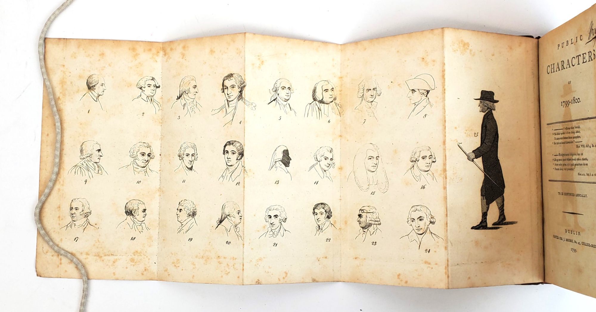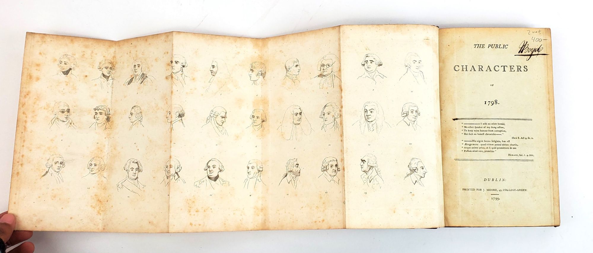 Dublin: Printed for J. Moore, 1799. Hardcover. Octavo, Two volumes (x, 382 pages ; 452 pages). In Good minus condition. Spines are brown with gold print on black banners. Boards half bound with brown leather to spine and corners and marbled paper to boards. Wear to spine caps and corners, tears to front hinges, slight cracking to spine leather, light rubbing to paper. Text blocks have cracked front hinge, bookplate on front pastedown, name in ink on title pages, slight spotting to endpapers, light occasional foxing and tanning to paper. Illustrated: b&w folded frontispiece in each volume exhibiting sketches of biographies within. NOTE: Shelved in Locked Annex Area, ND-HV Column.
