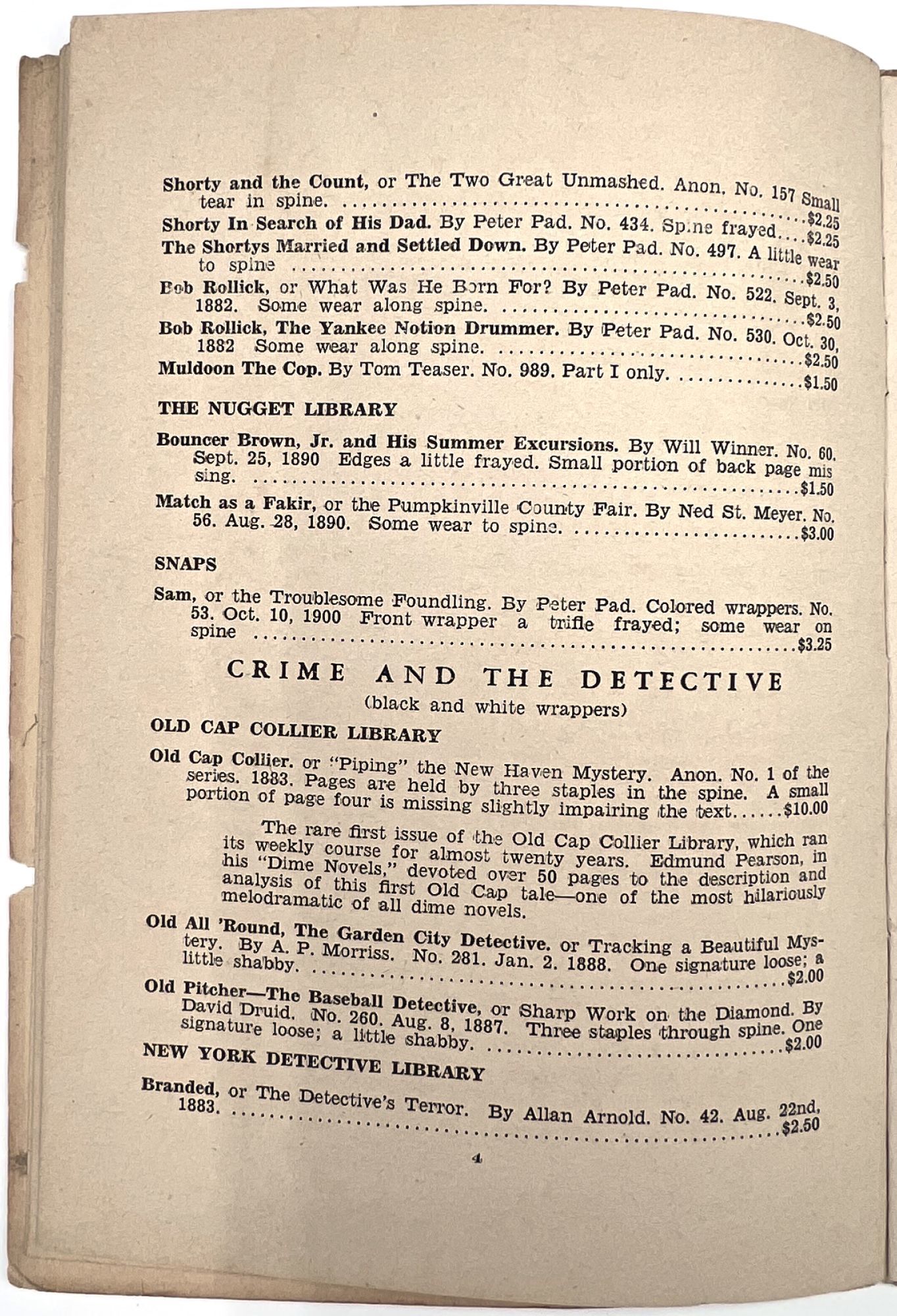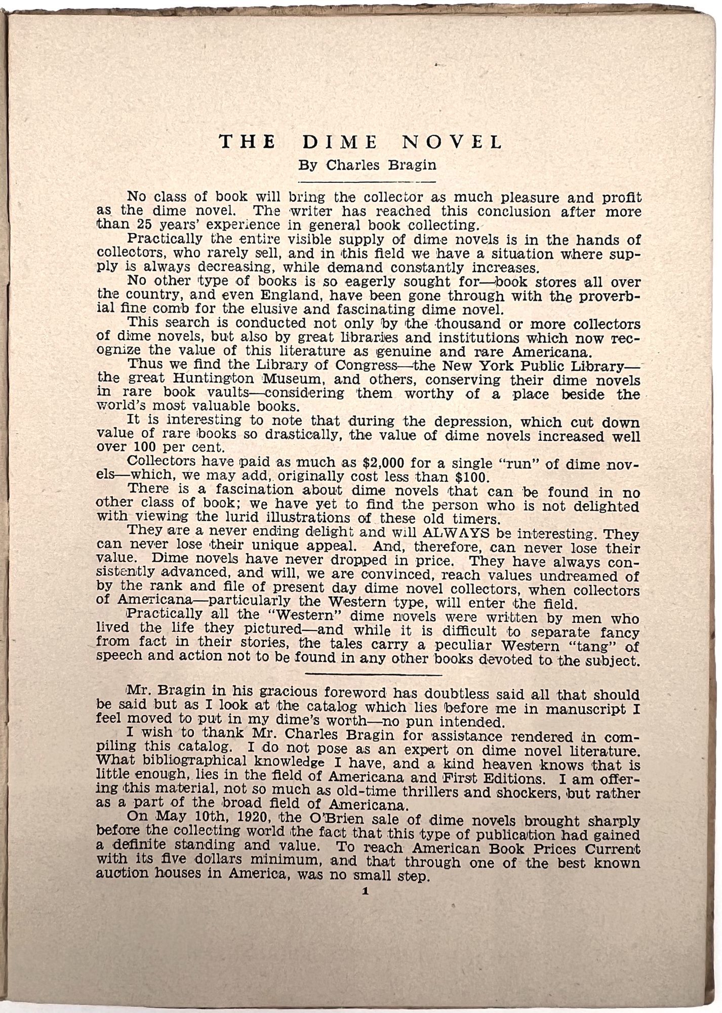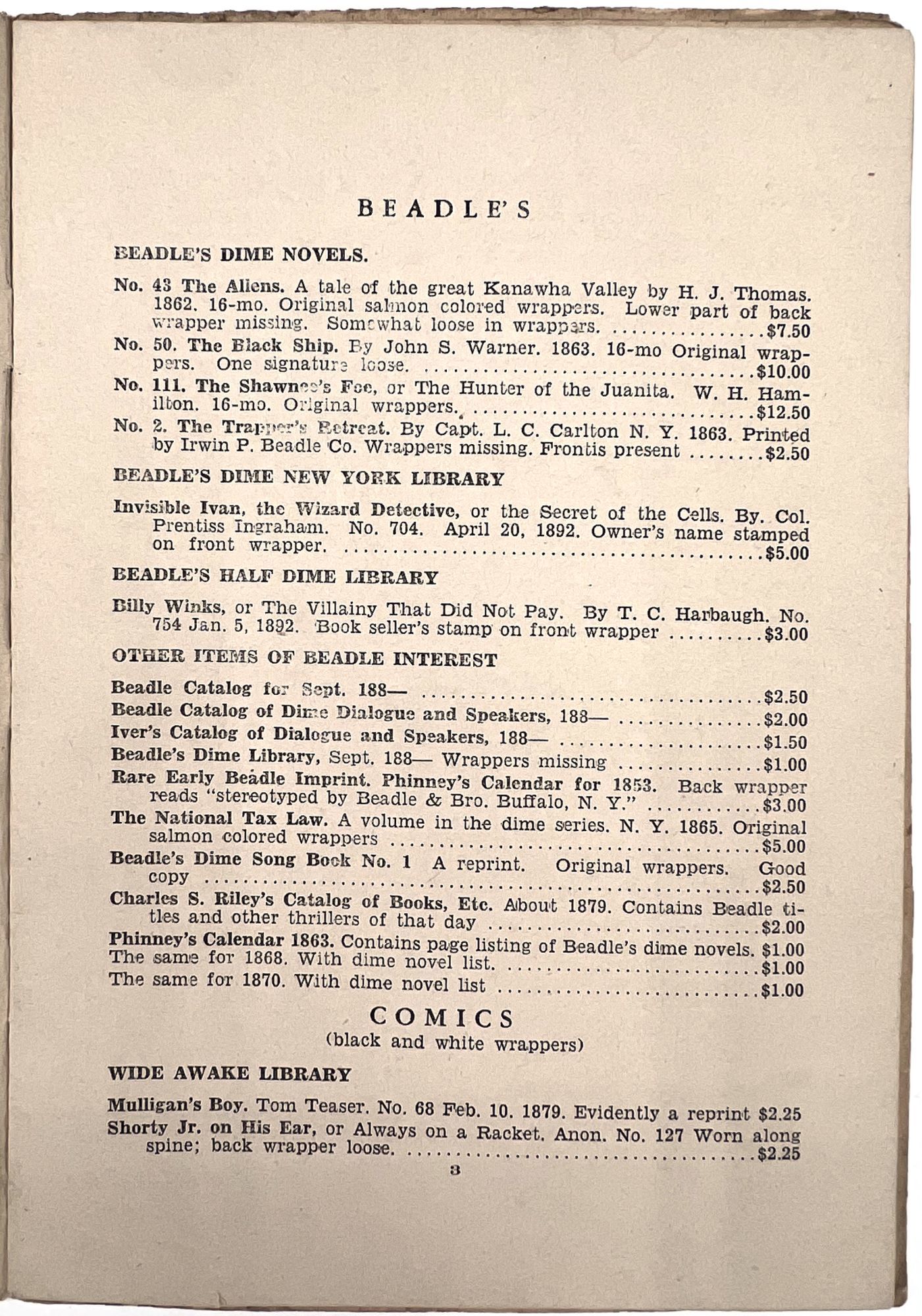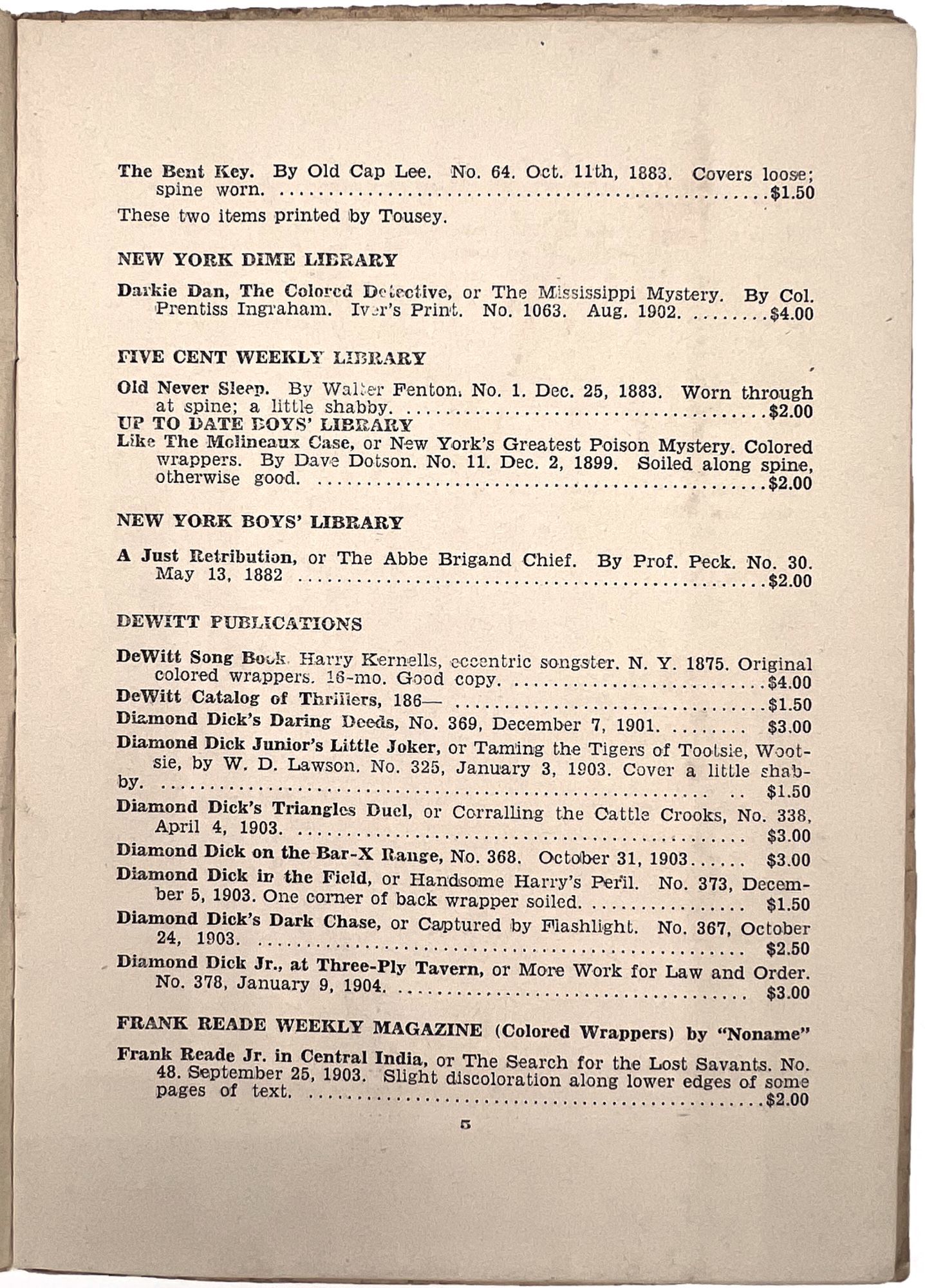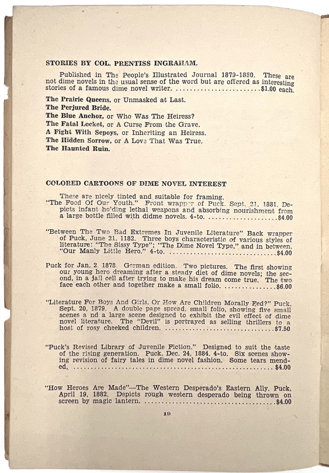 Red Bank, New Jersey: John A. Hayes, 1936. Very good. Some toning, chipping, dust soiling.. A scarce and valuable list of Victorian dime novels for sale in 1936 by the dealer John A. Hayes, including a brief essay by Charles Bragin on a recent rise in dime novel collecting: "Thus we find the Library of Congress, the New York Public Library, the great Huntington Museum, and others, conserving their dime novels in rare book vaults--considering them worthy of a place beside the world's most valuable books. Each dime novel is priced with title, author, format, and defects where applicable. They are organized into the following categories: Beadle's; Comics; Crime and the Detective; Sea and Sailor; The West and Indians; Lots; Reprints; Misc.; and Buffalo Bill. Limited to 500 copies; this is copy no. 39. Single vol. (8.25" by 5.75"), pp. 24, original printed wrps.