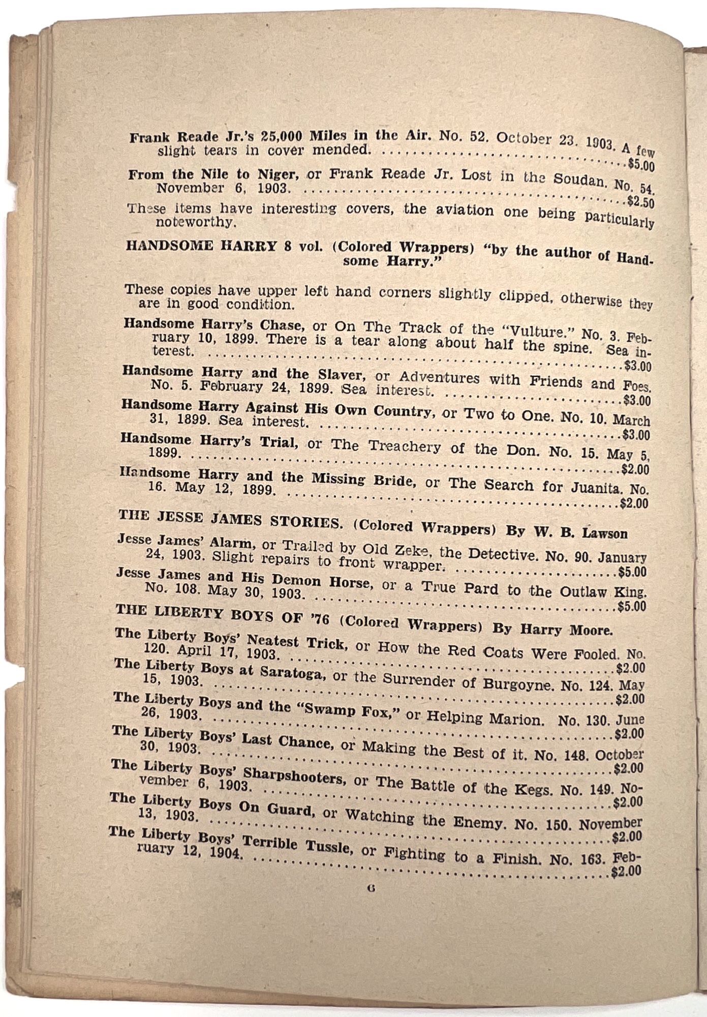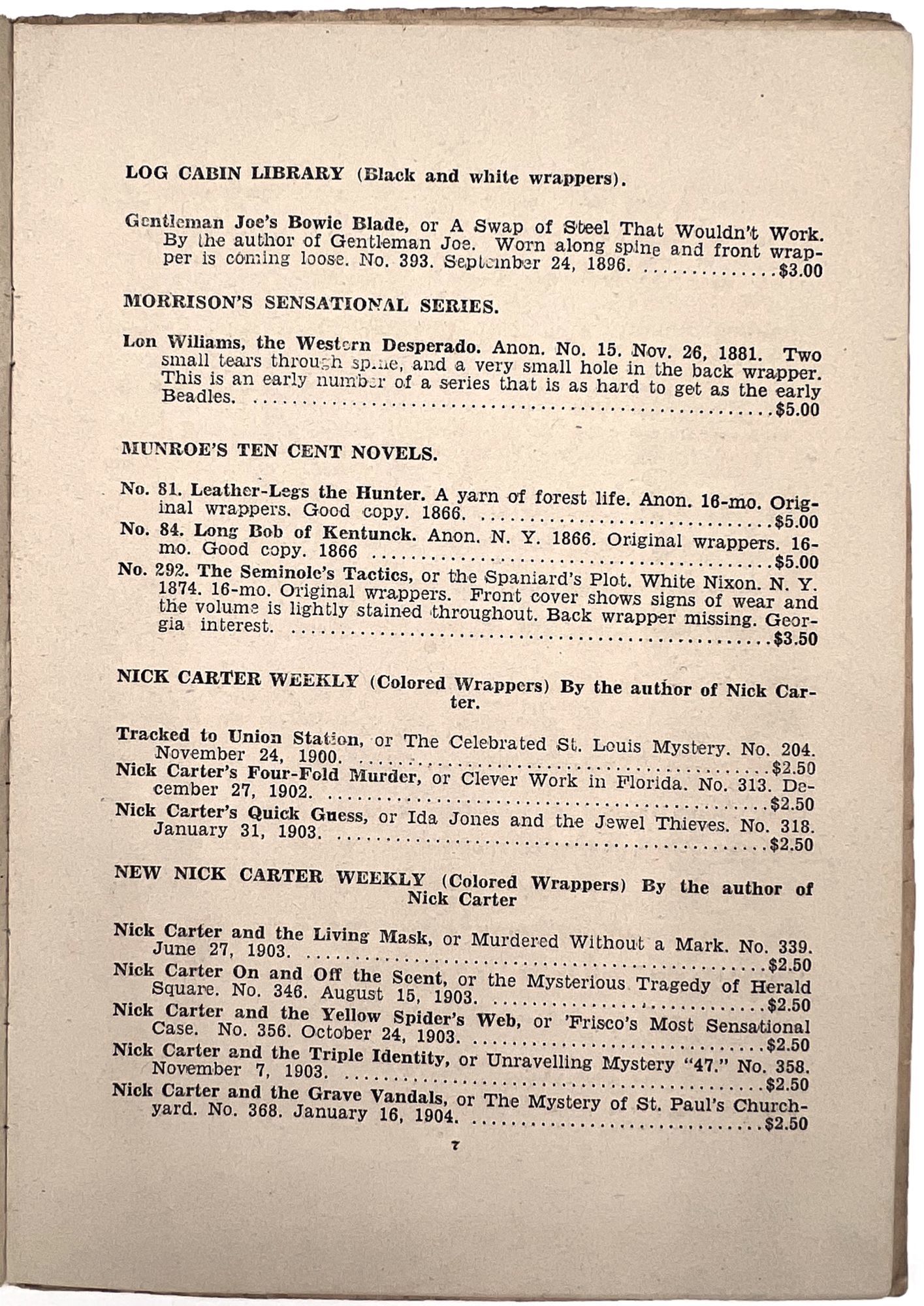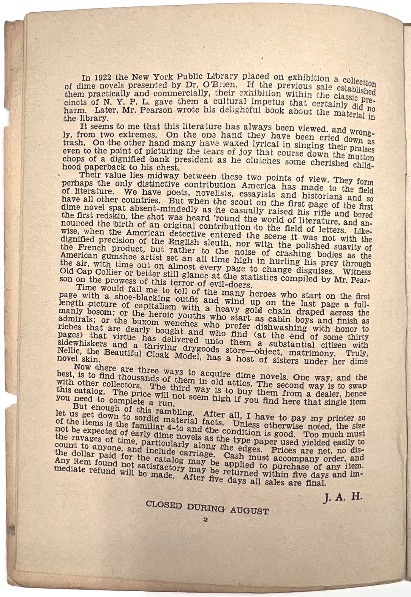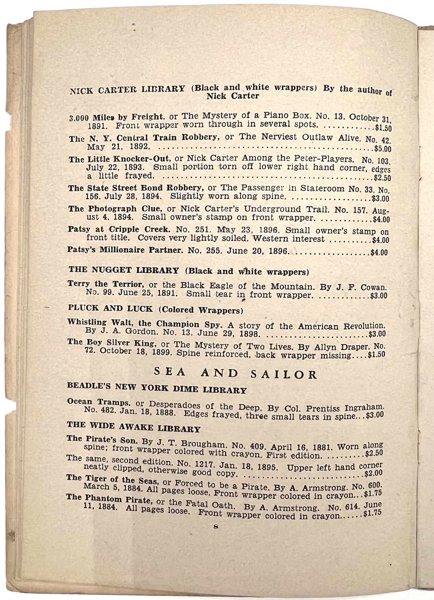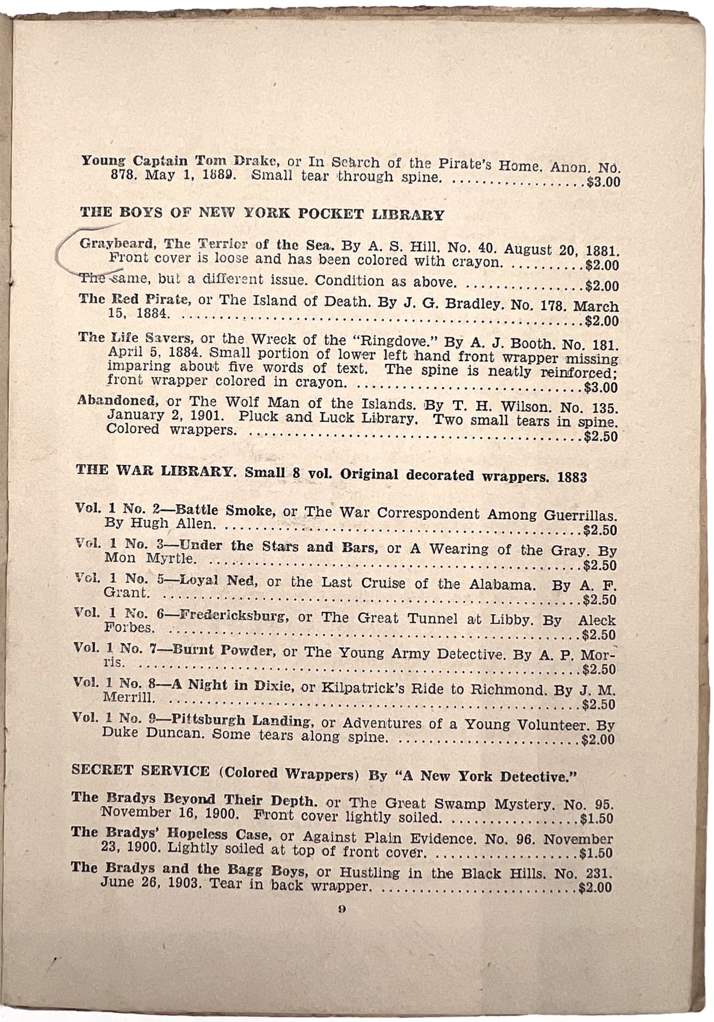 Red Bank, New Jersey: John A. Hayes, 1936. Very good. Some toning, chipping, dust soiling.. A scarce and valuable list of Victorian dime novels for sale in 1936 by the dealer John A. Hayes, including a brief essay by Charles Bragin on a recent rise in dime novel collecting: "Thus we find the Library of Congress, the New York Public Library, the great Huntington Museum, and others, conserving their dime novels in rare book vaults--considering them worthy of a place beside the world's most valuable books. Each dime novel is priced with title, author, format, and defects where applicable. They are organized into the following categories: Beadle's; Comics; Crime and the Detective; Sea and Sailor; The West and Indians; Lots; Reprints; Misc.; and Buffalo Bill. Limited to 500 copies; this is copy no. 39. Single vol. (8.25" by 5.75"), pp. 24, original printed wrps.