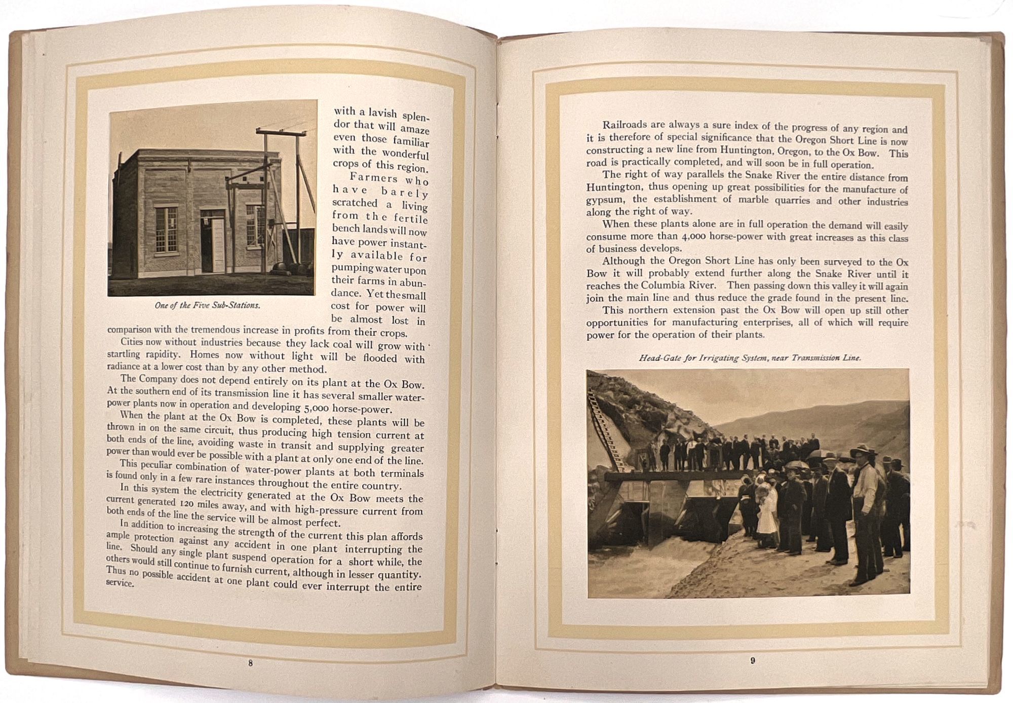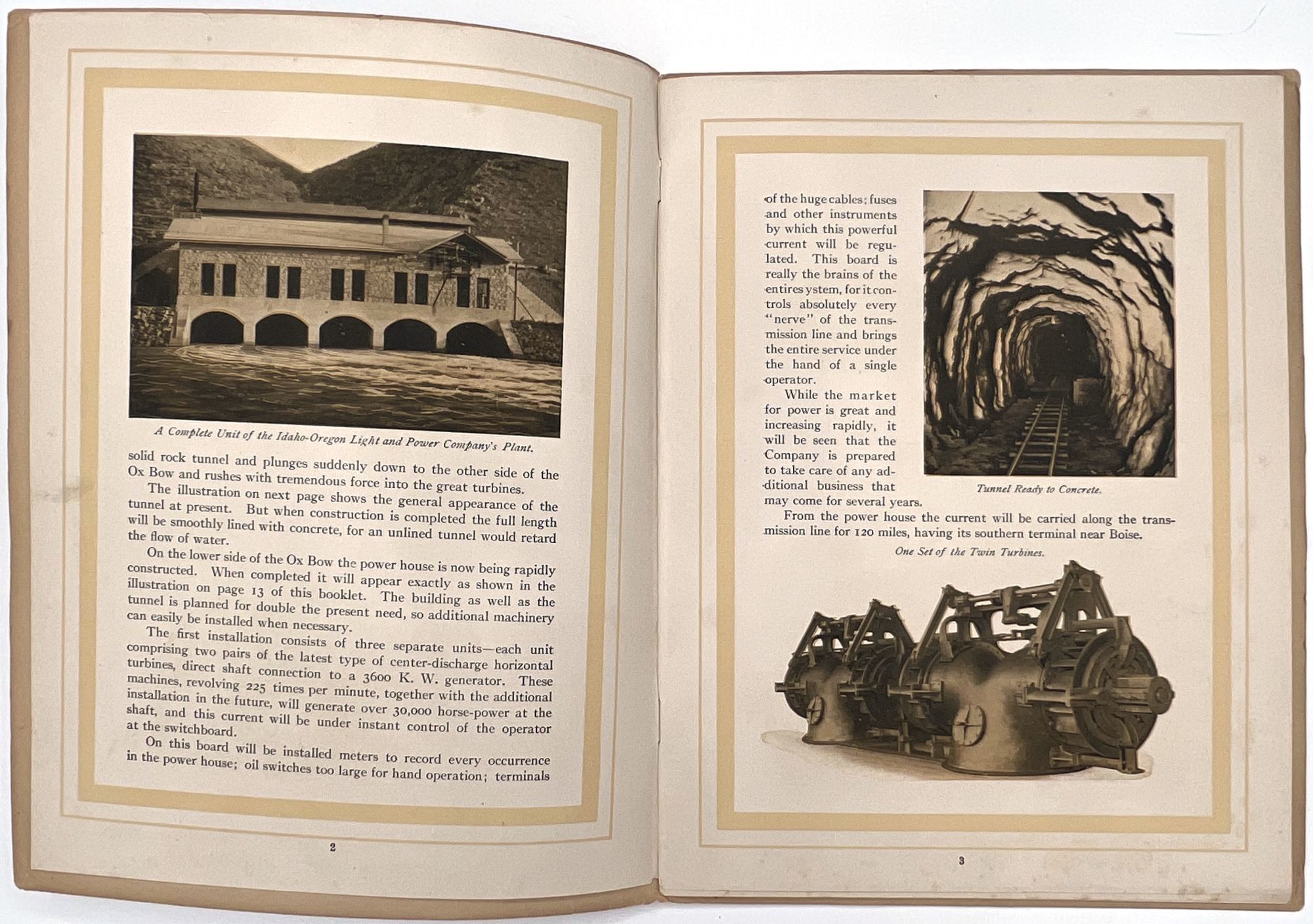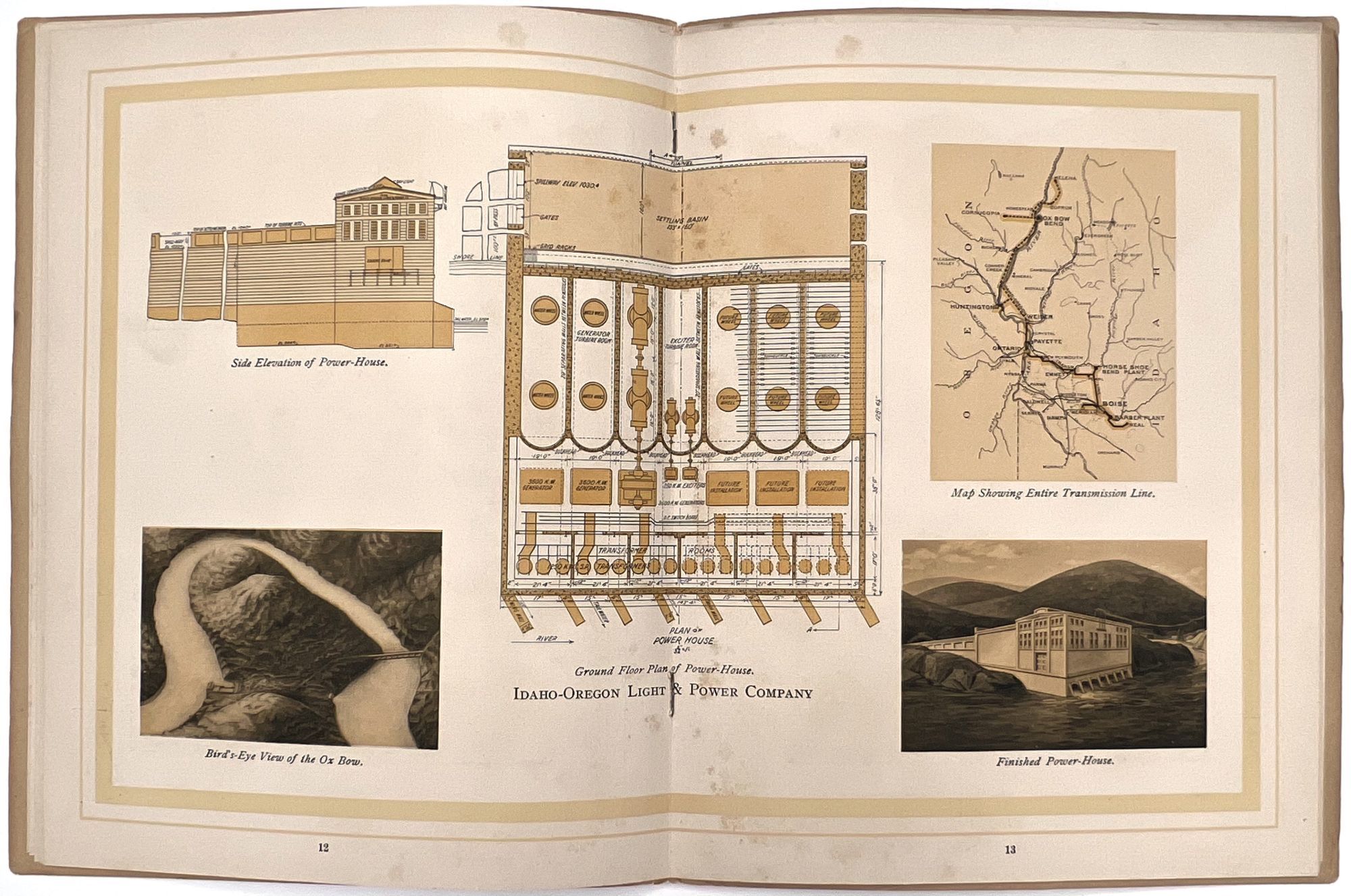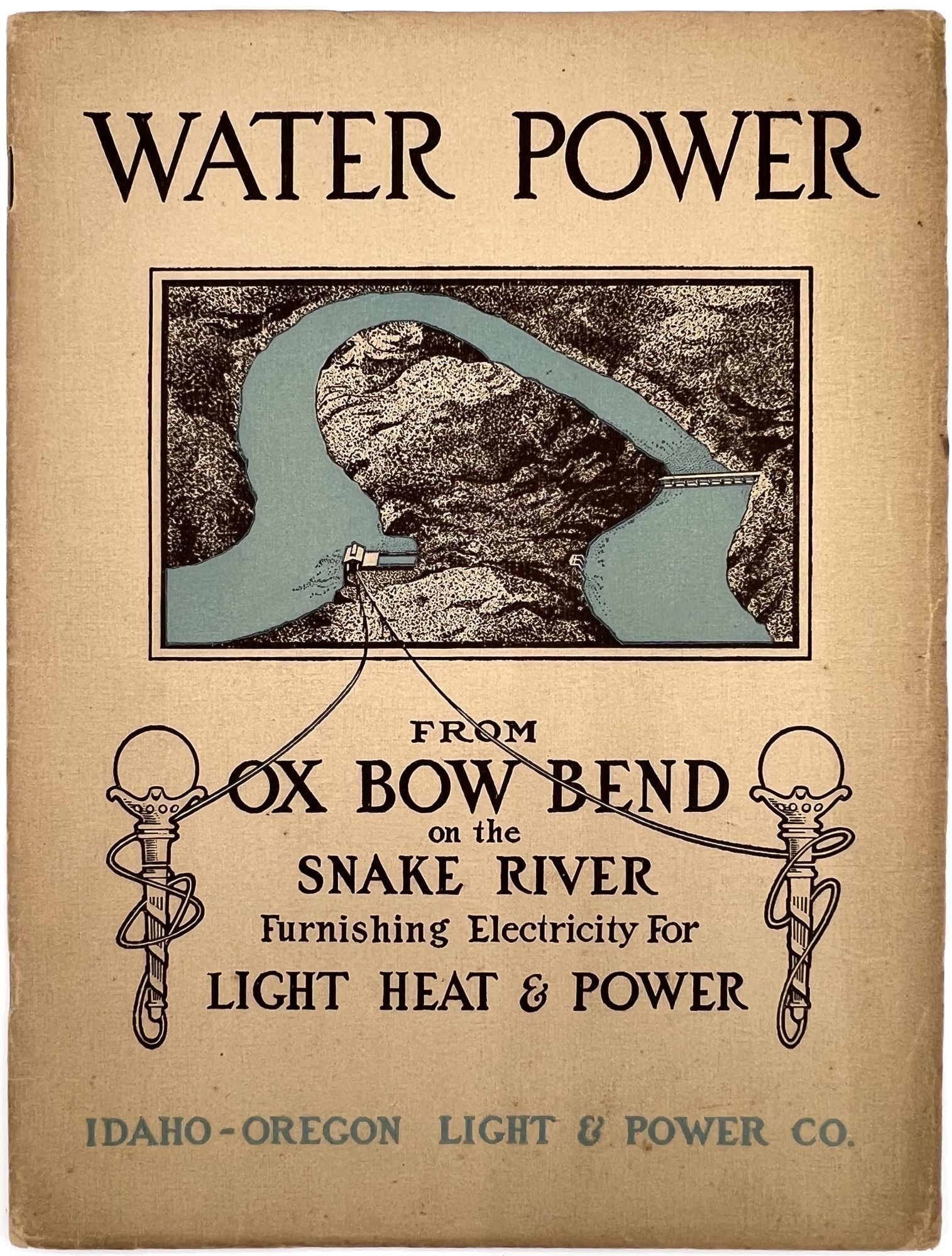 Oshkosh, Wisconsin: Idaho-Oregon Light & Power Co, 1909. Very good. Spotting.. A promotional booklet for the Idaho-Oregon Light & Power Co. highlighting their new hydroelectric project using currents "from Ox Bow Bend on the Snake River" on the border or Oregon and Idaho. Features an attractively designed wrapper with aerial view of the proposed site, and lines connected to two stylized electric torches on either side of the image. Includes photos and plans of the proposed site and construction, which is to be done by the Arnold Company of Chicago. Includes photos of the surrounding cities, highlighting the rapidly growing need for power. Single vol. (9.25" by 7"), pp. 24, illus., stapled in original illus. wrps.
